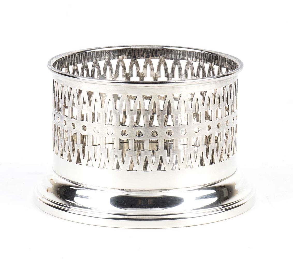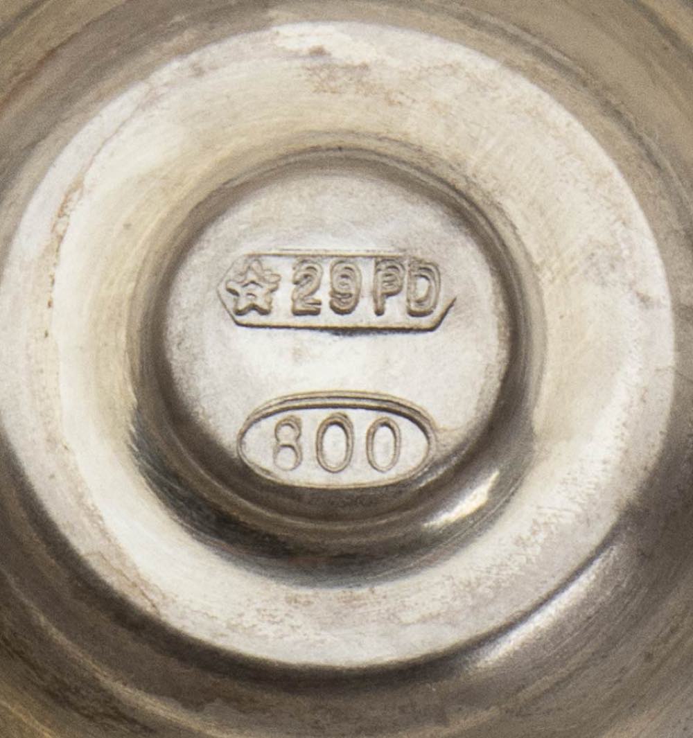 d) sottobottiglia in argento 800/1000 punzonato "800" e "+ 30 PD", altezza 7,5 cm, diametro 10 cm, peso 185 gr;