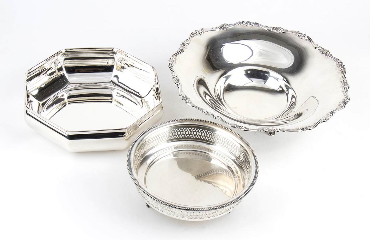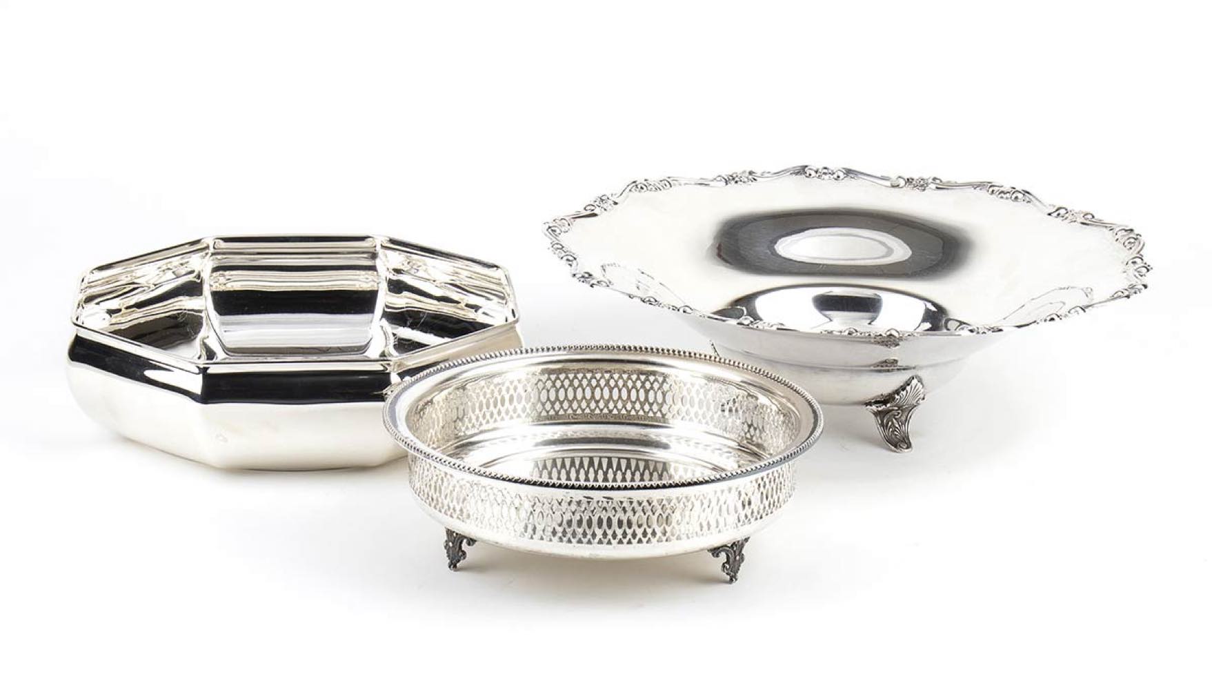 a) cestino ottagonale in argento 800/1000 punzonato "800" e "* 29 PD", diametro 20,6 cm, altezza 6,2 cm, peso 329 gr;