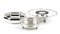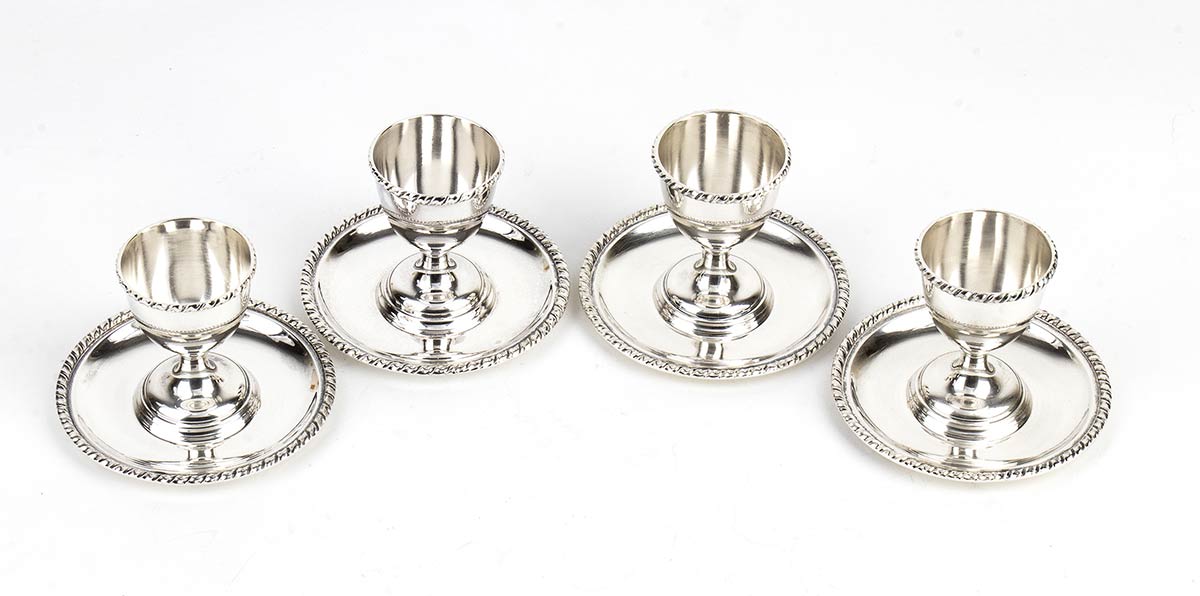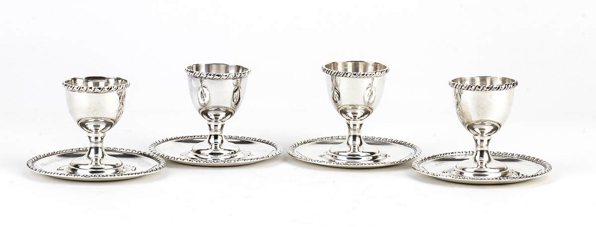 e) quattro portauovo in argento 800/1000 punzonati "800" e "1 BS", altezza 6 cm, diametro 9,5 cm, peso 280 gr;