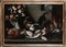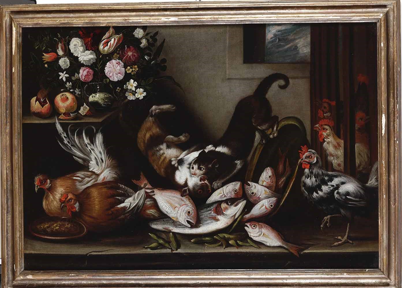 Scuola napoletana del XVIII secolo, Natura morta con fiori, frutta, galli, pesci e gatti