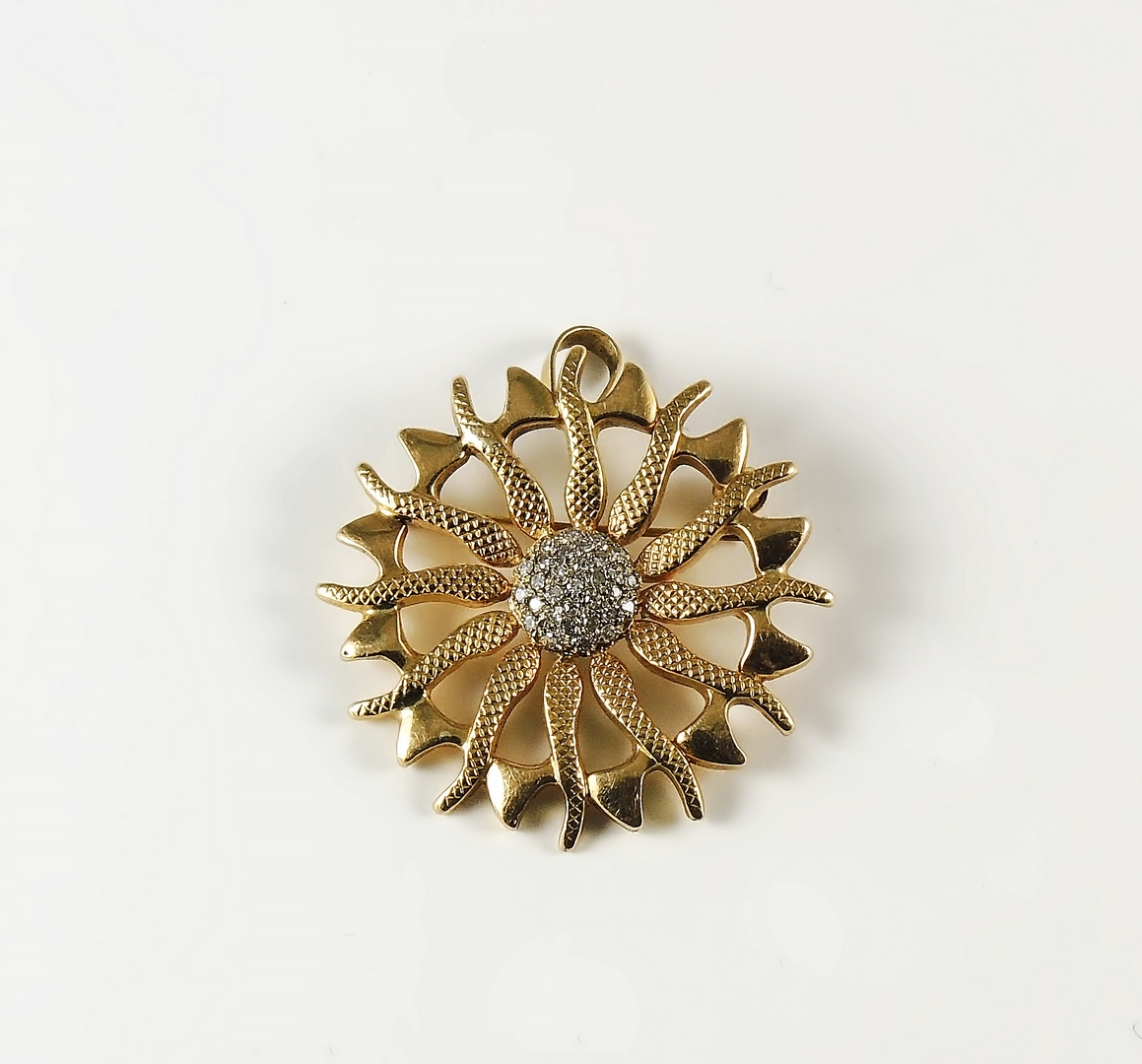 SPILLA-PENDENTE IN ORO GIALLO E BRILLANTINI realizzata come un fiore stilizzato con al centro pavè di brillanti gr 8,8