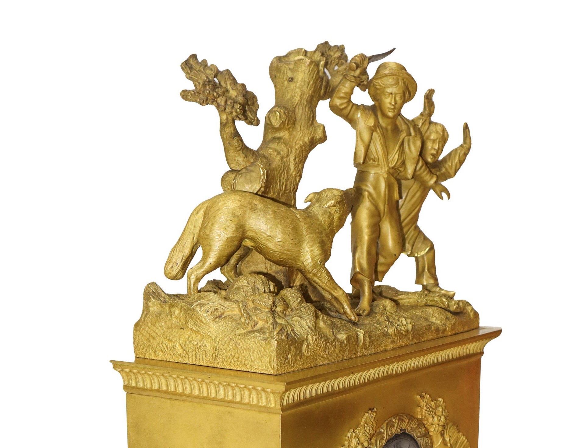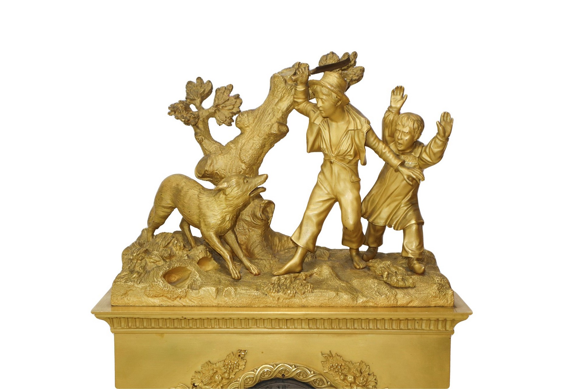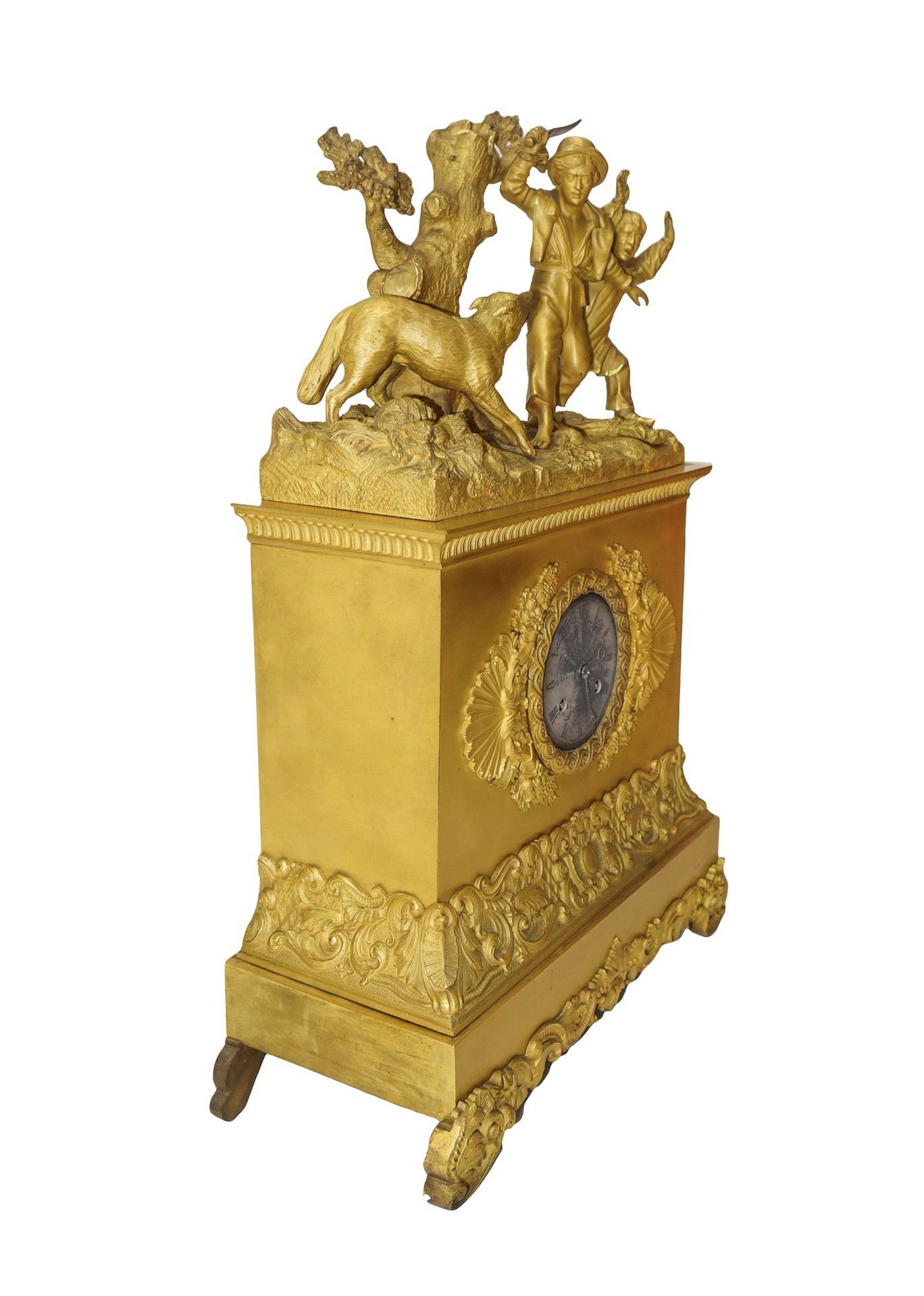Orologio francese in metallo dorato, Mid 19th century h cm 50 x cm 35 x cm 15 Dorato a mercurio (ormouro). Sovrastante scultura raffigurante ragazzi con cane lupo. Provvisto di meccanismo funzionante ma da revisionare.Dorato a mercurio (ormouro). Sovrastante scultura raffigurante ragazzi con cane lupo. Provvisto di meccanismo funzionante ma da revisionare.