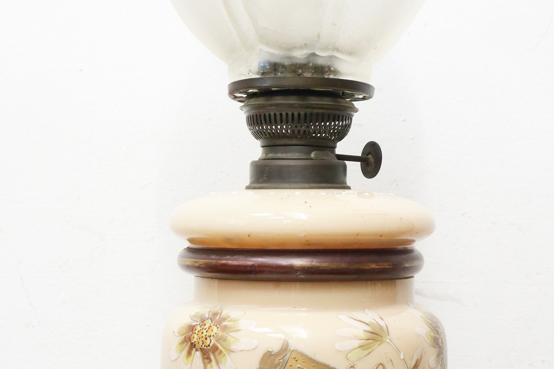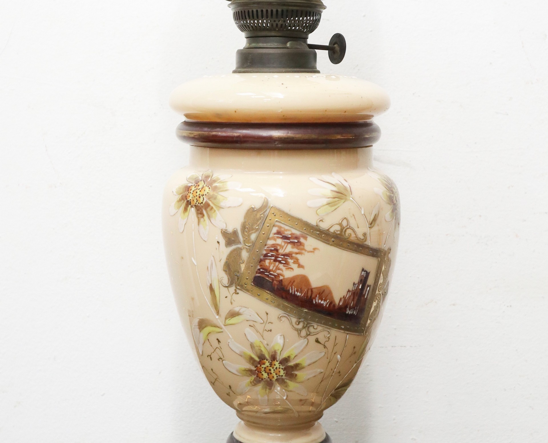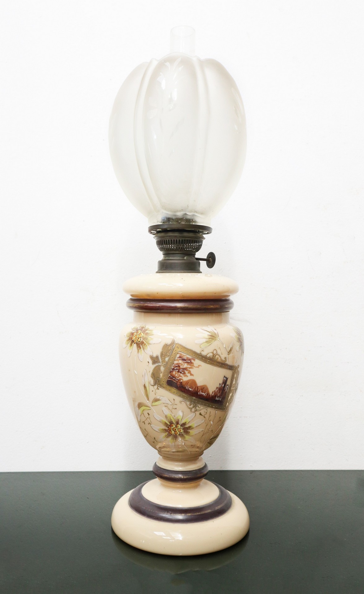 Lume a petrolio in opalina beige, nineteenth century h cm 55 Base in opalina beige. Dipinto a mano con soggetti floreali, diffusore in vetro con motivi florealiBase in opalina beige. Dipinto a mano con soggetti floreali, diffusore in vetro con motivi floreali