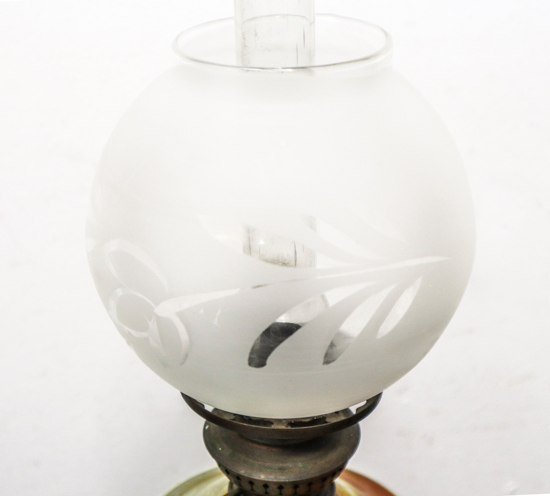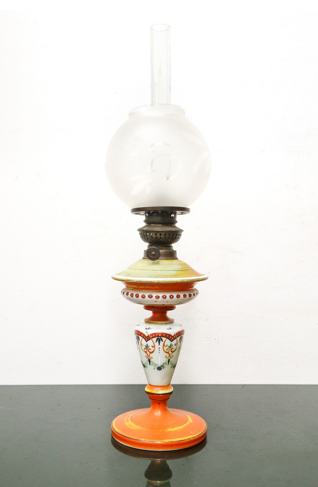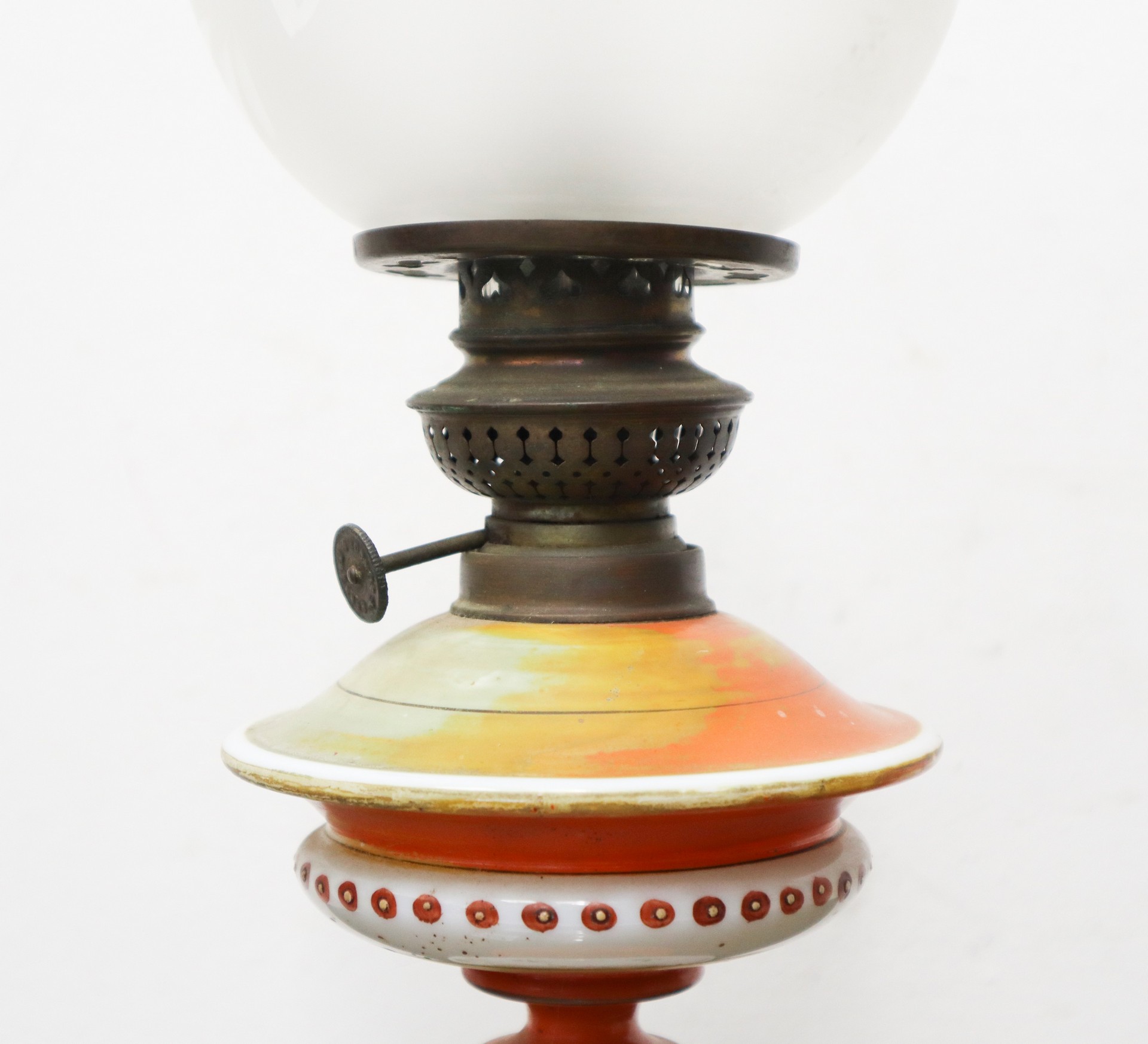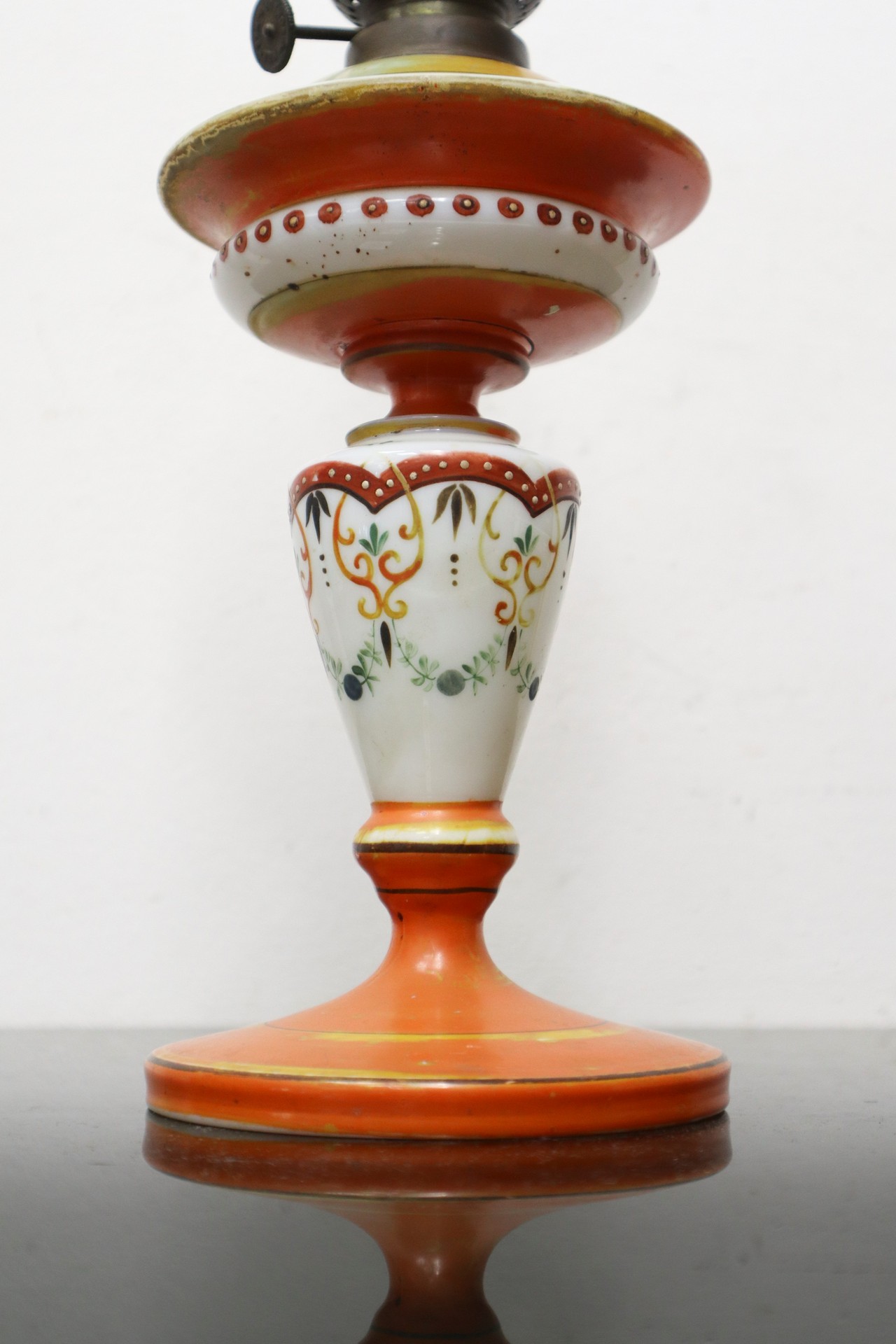 Lume a petrolio in maiolica arancione, Late 19th century h cm 40 Base in maiolica arancione, dipinto a mano con diffusore in vetro Base in maiolica arancione, dipinto a mano con diffusore in vetro