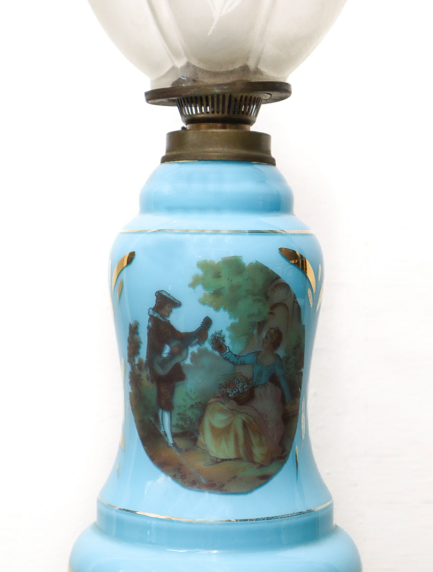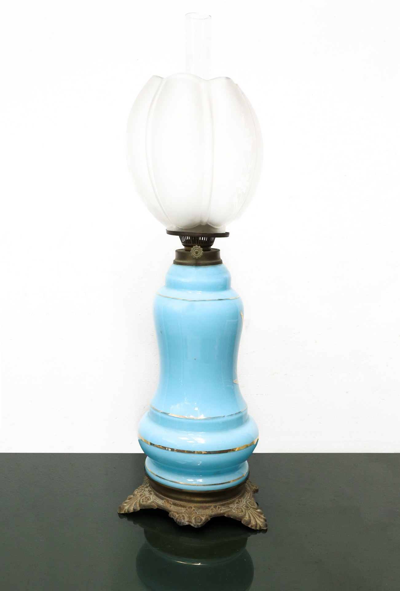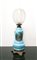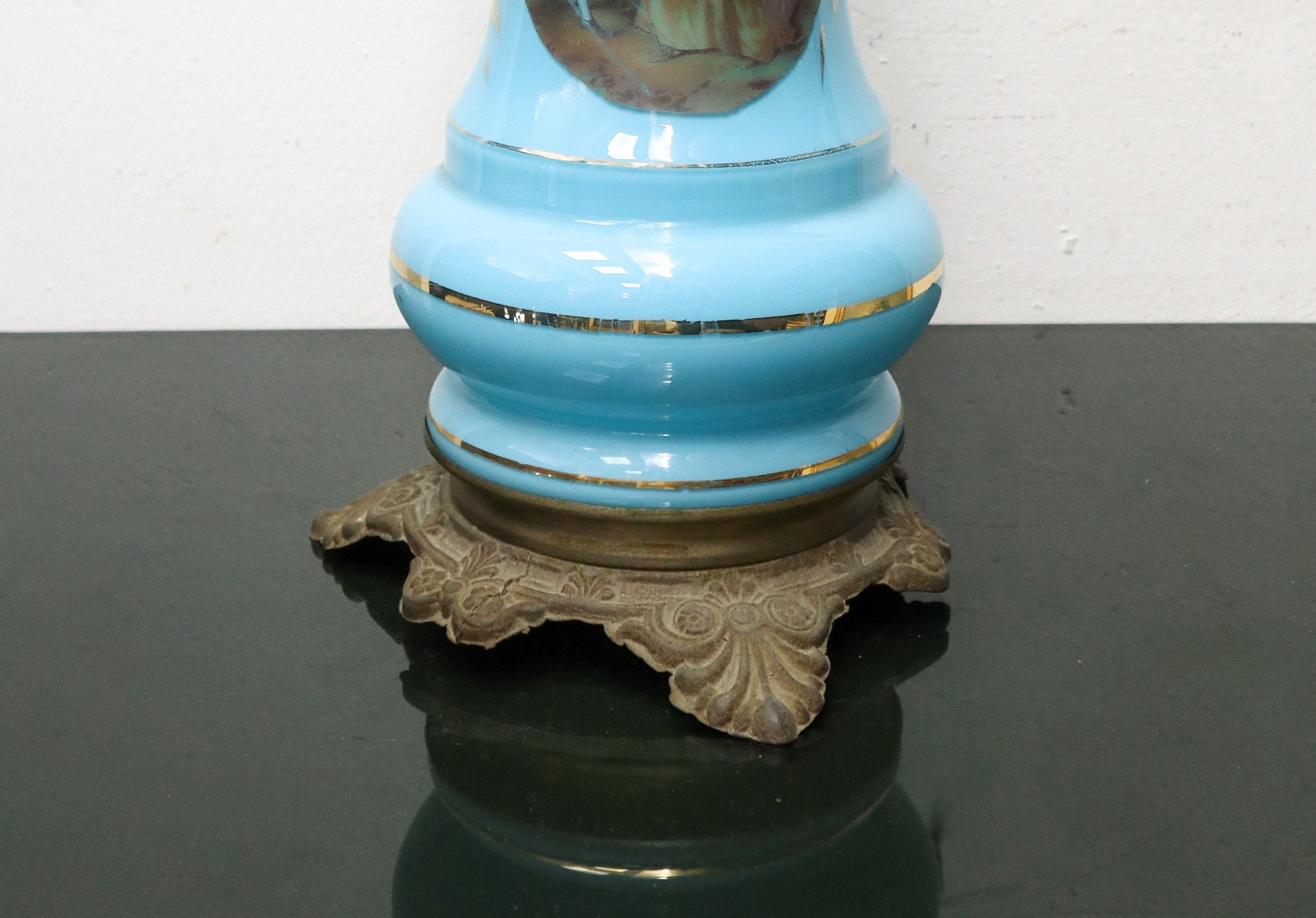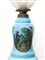 Lume a petrolio in opalina azzurra, Late 19th century h cm 50 Base in BRONZO, con scena di genere sul fronte e riporti doratiBase in BRONZO, con scena di genere sul fronte e riporti dorati