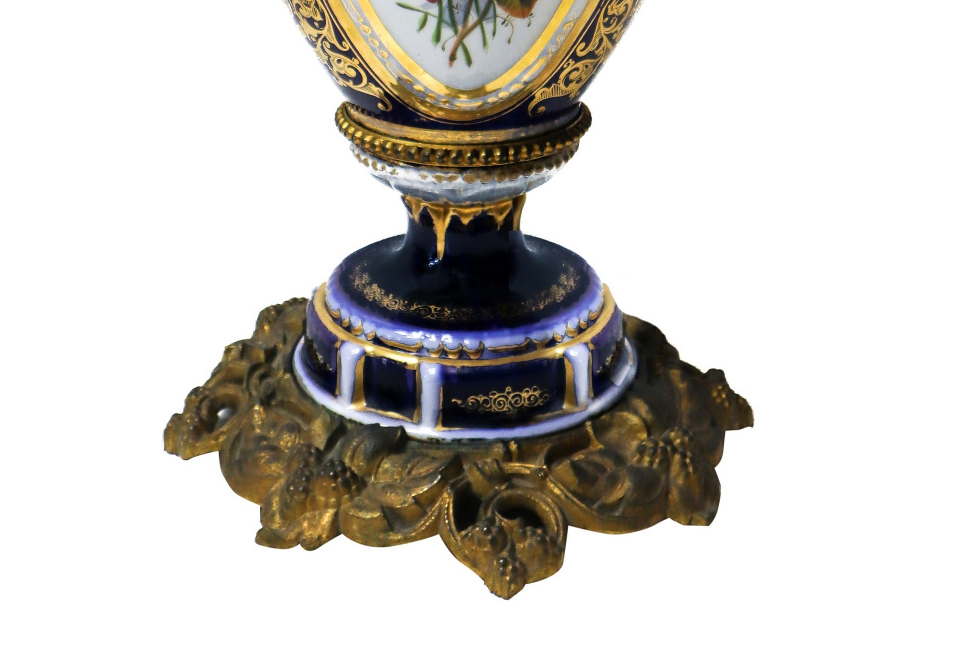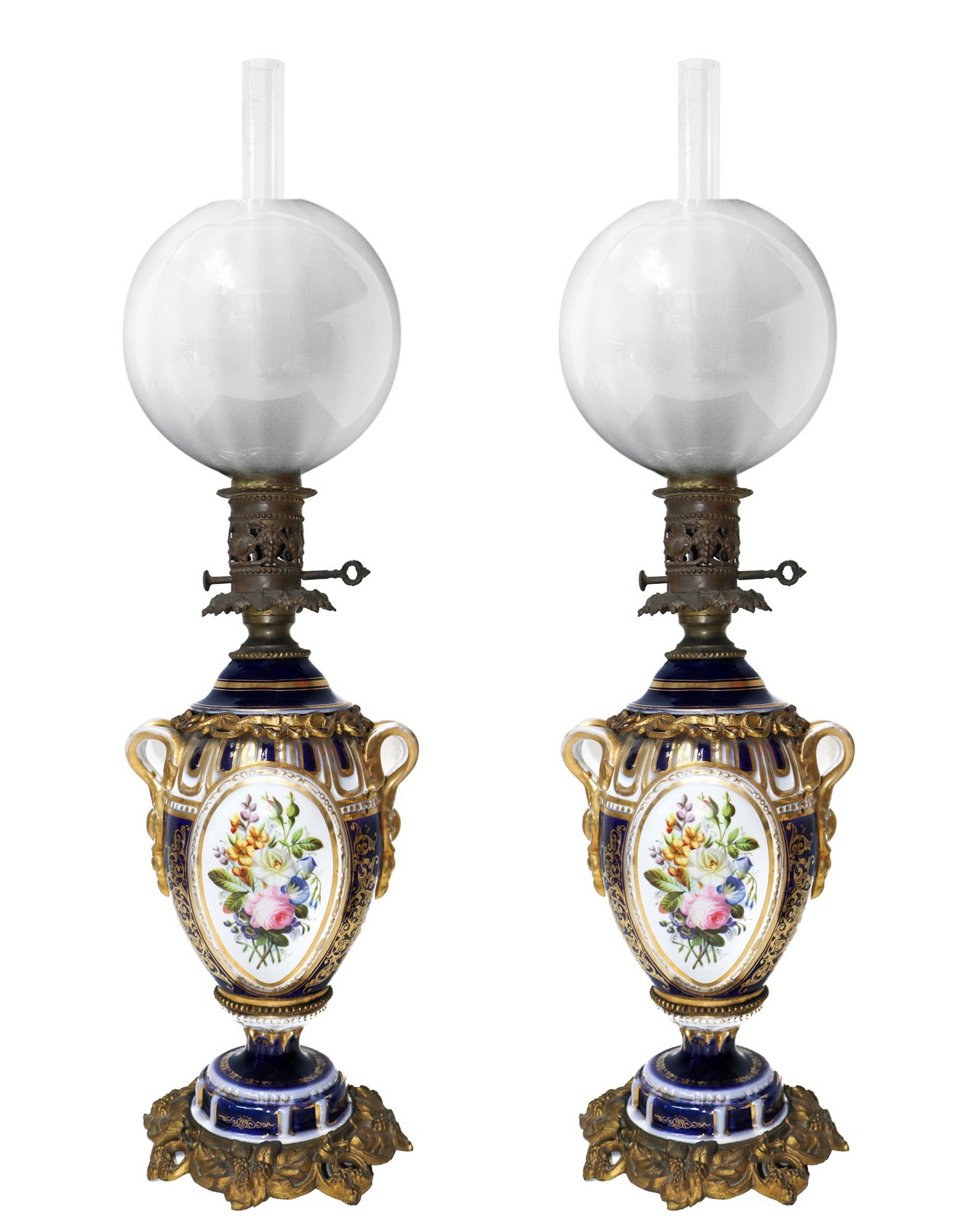 Coppia di lumi a petrolio in porcellana e bronzo, Late 19th century