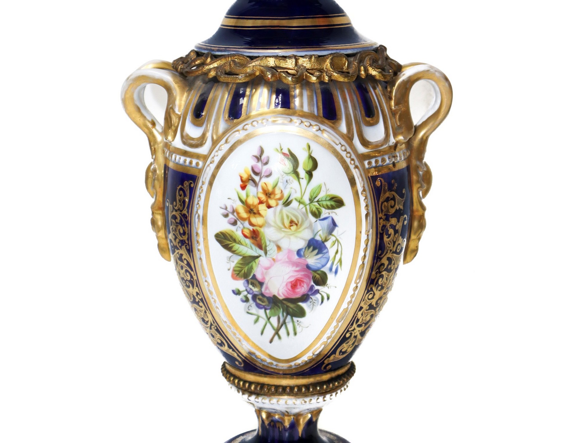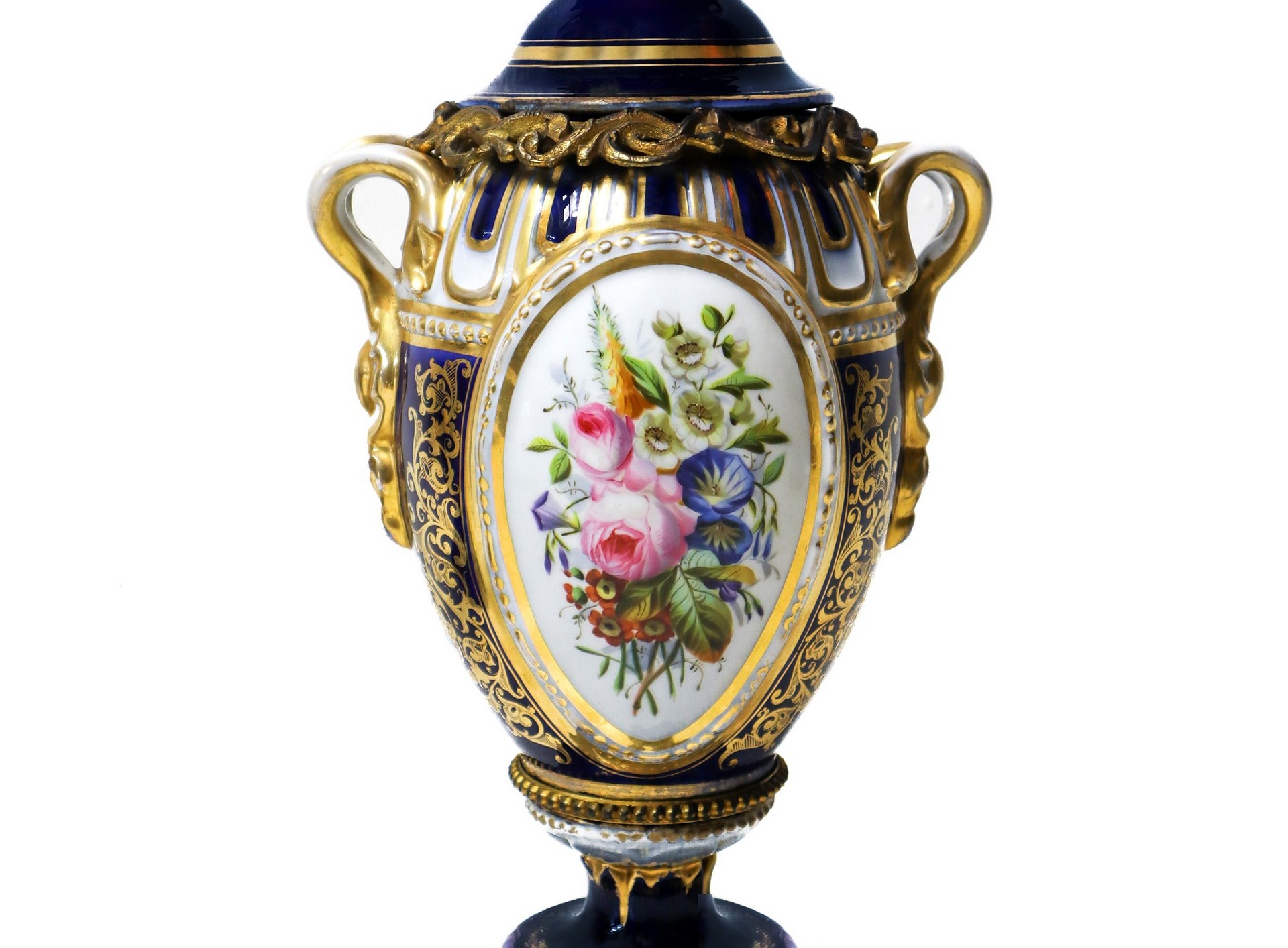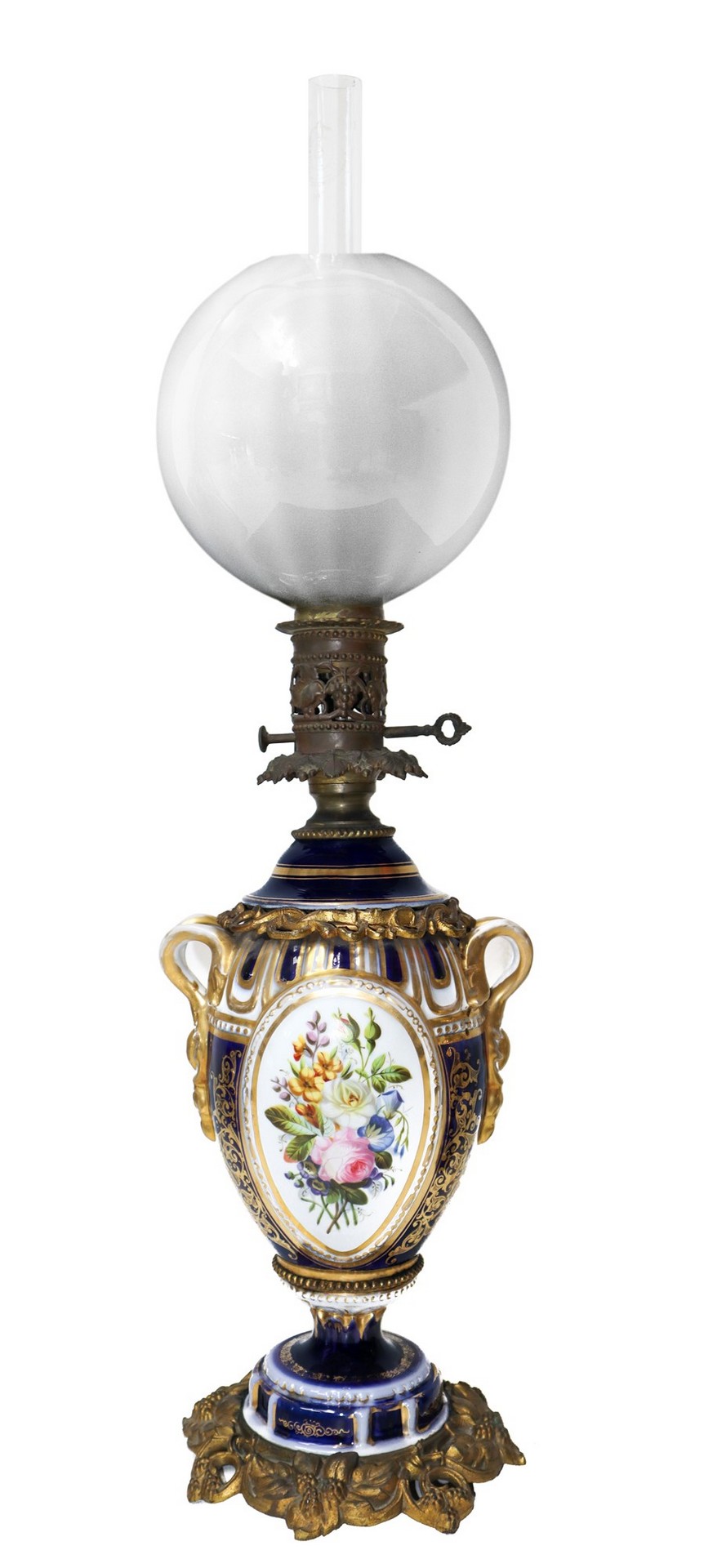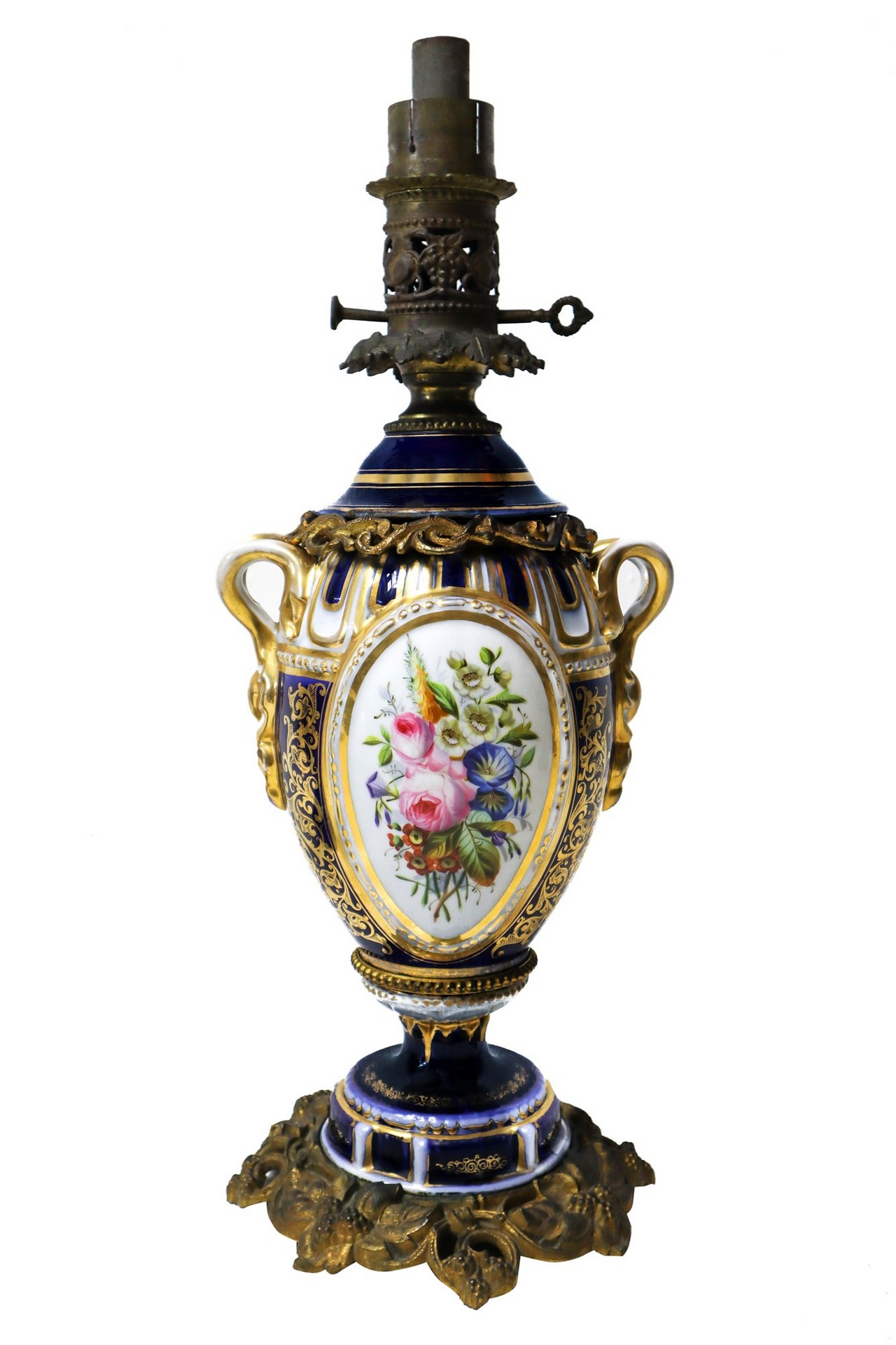 Coppia di lumi a petrolio in porcellana e bronzo, Late 19th century h cm 80 Dipinti su fronte e su retro con motivi floreali e particolari dorati su fondo blu.Dipinti su fronte e su retro con motivi floreali e particolari dorati su fondo blu.