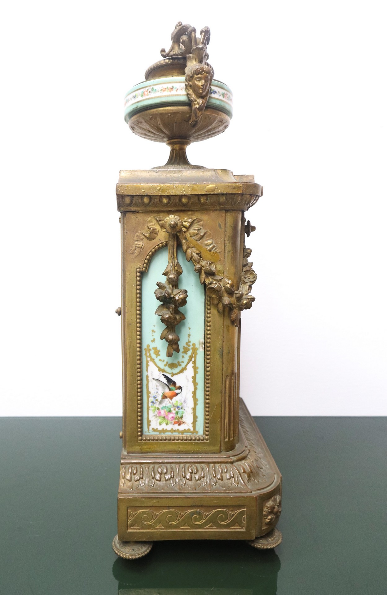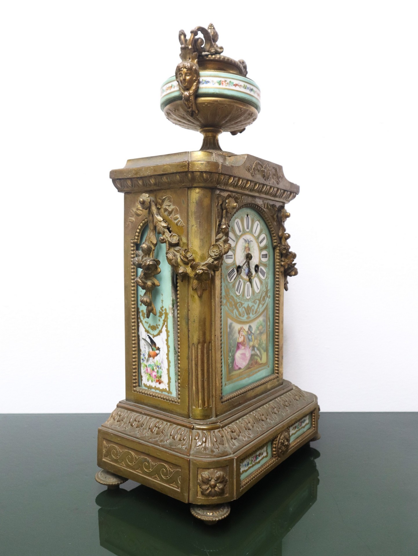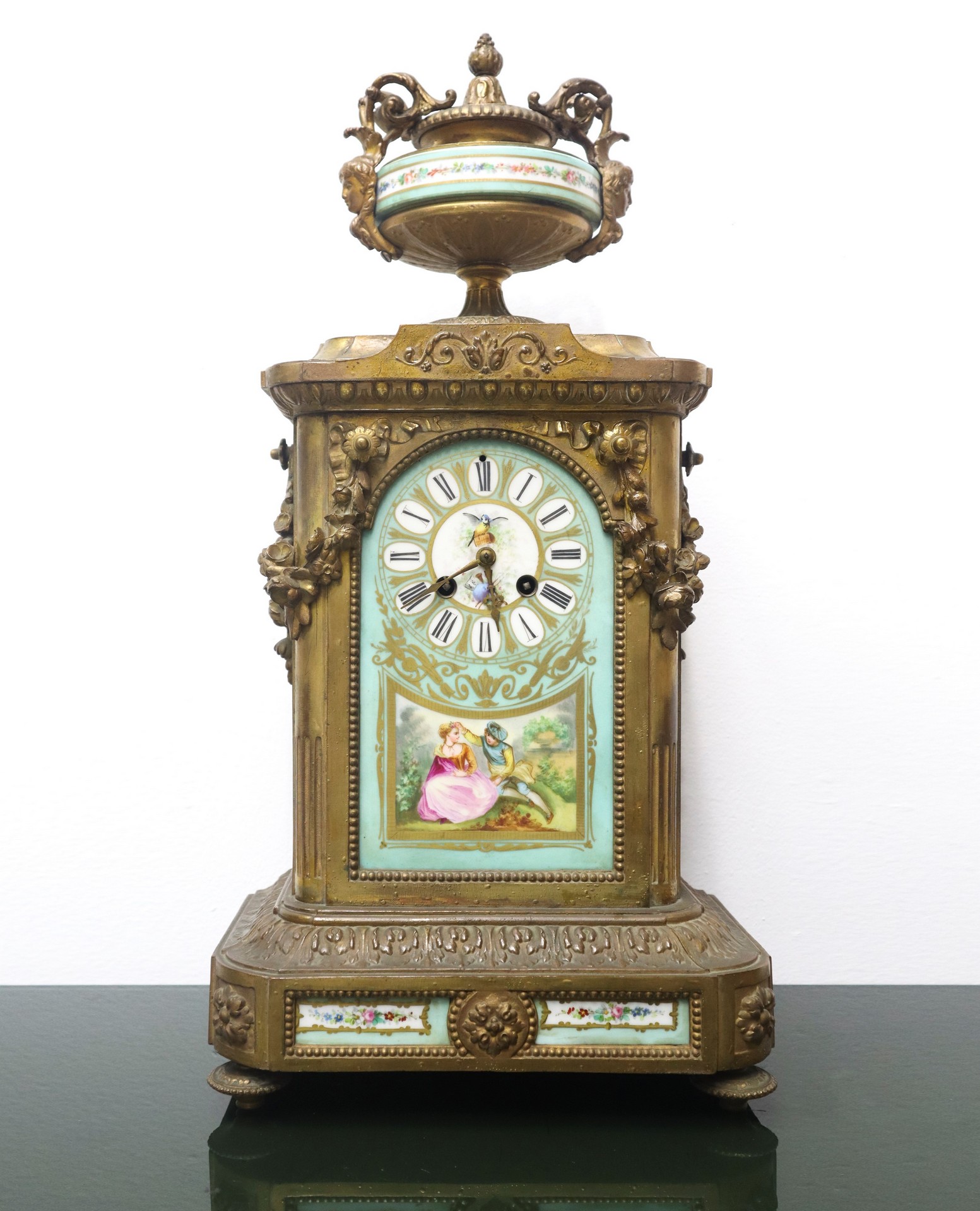 Orologio, Late 19th century. H cm 54 Struttura in metallo dorato con porcellane raffiguranti fiori, volatili e scene di genere. Da revisionareStruttura in metallo dorato con porcellane raffiguranti fiori, volatili e scene di genere. Da revisionare