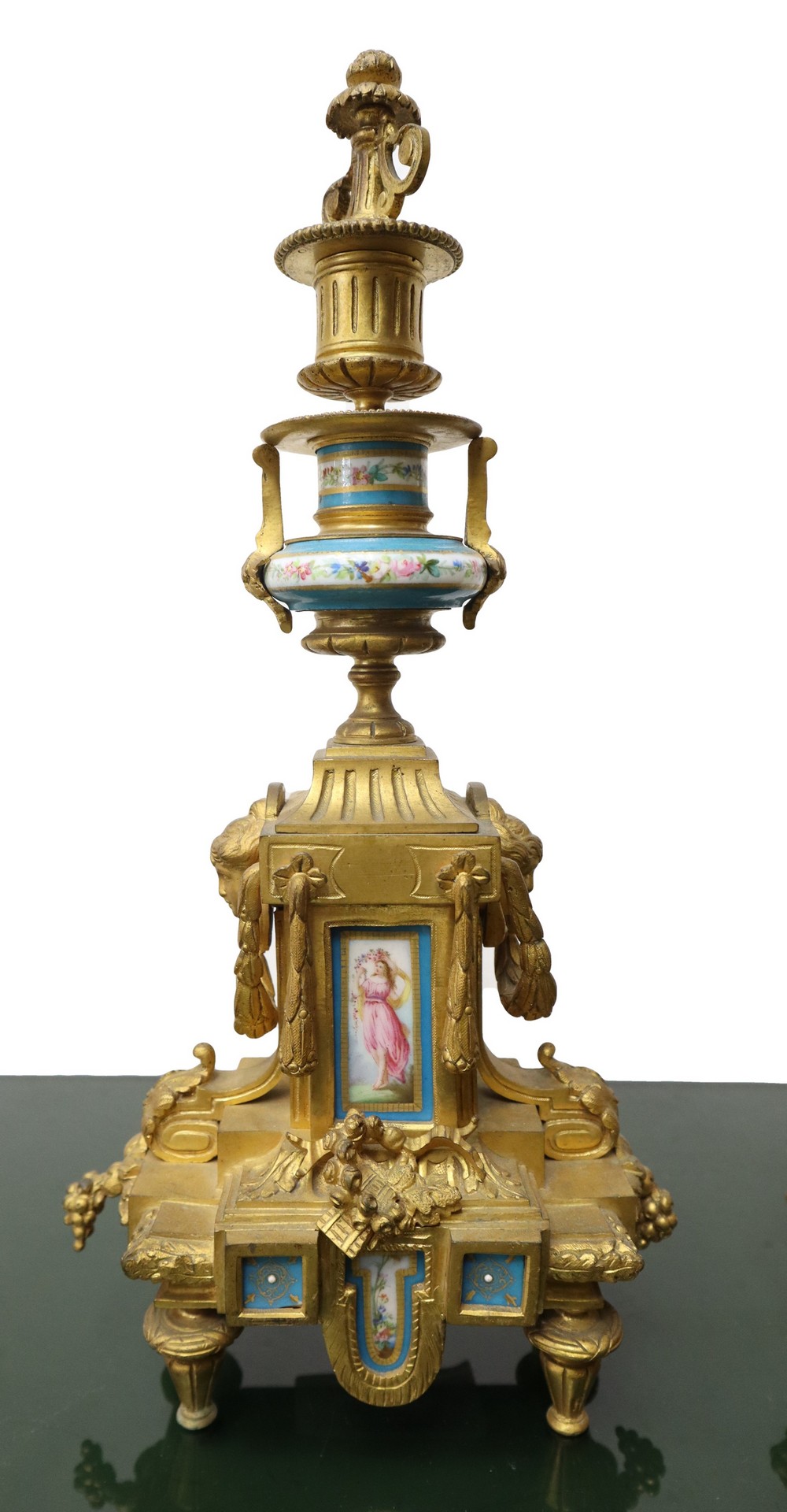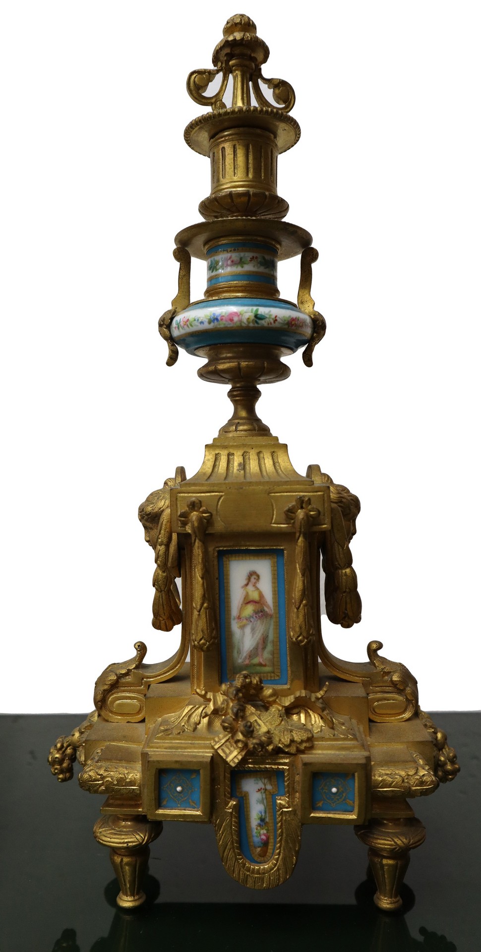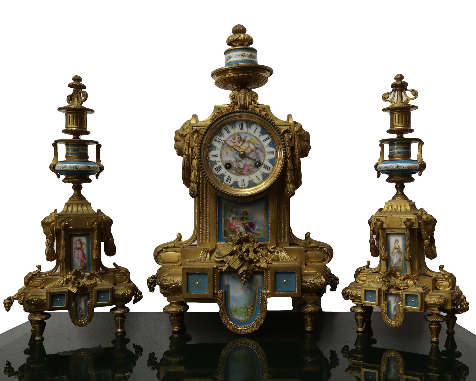 Trittico con orologio e coppia candelieri in bronzo dorato e porcellane miniaturizzate , Napoleon III, 19th century France Candelieri H cm 33, Orologio h cm 41, base cm 24 Da revisionare