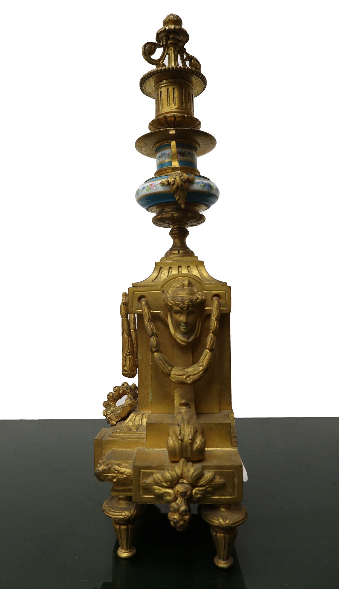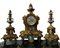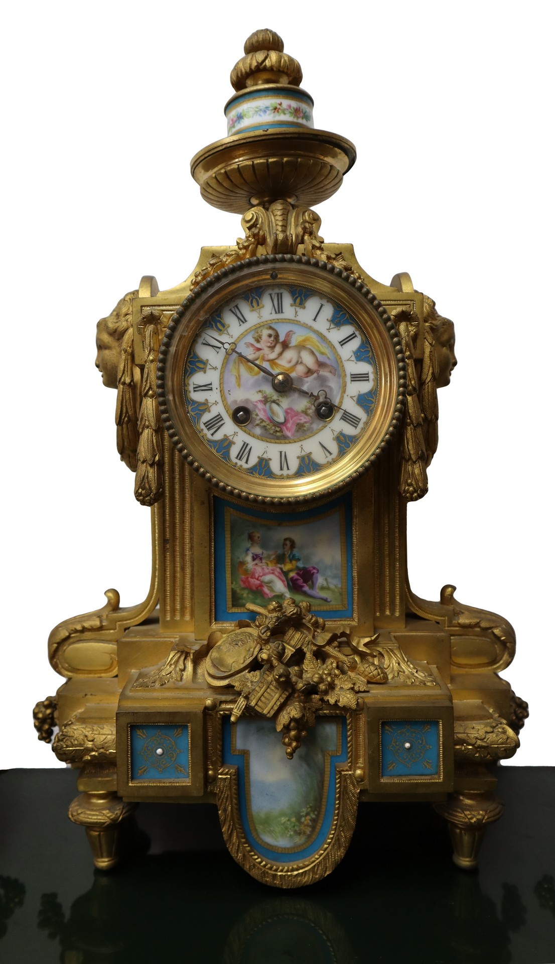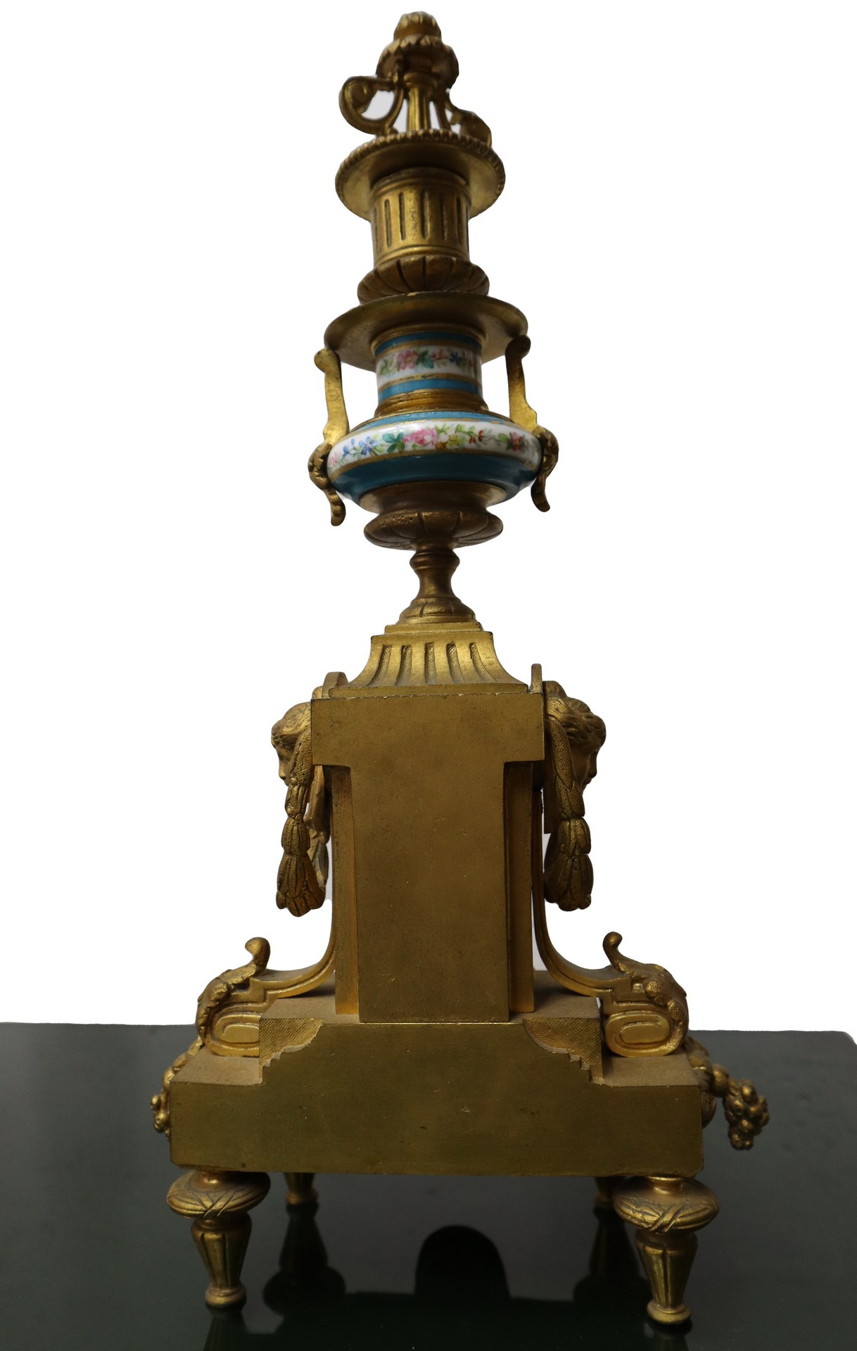Trittico con orologio e coppia candelieri in bronzo dorato e porcellane miniaturizzate , Napoleon III, 19th century France Candelieri H cm 33, Orologio h cm 41, base cm 24 Da revisionare