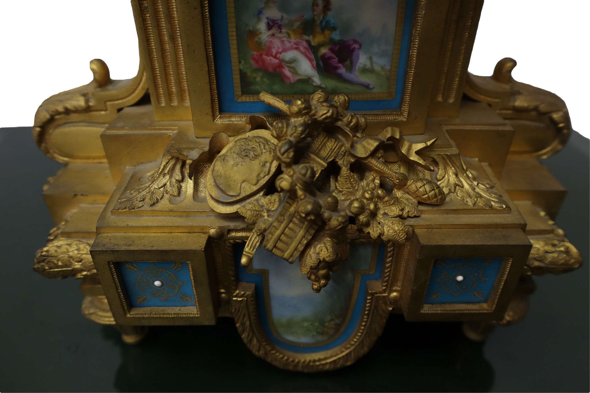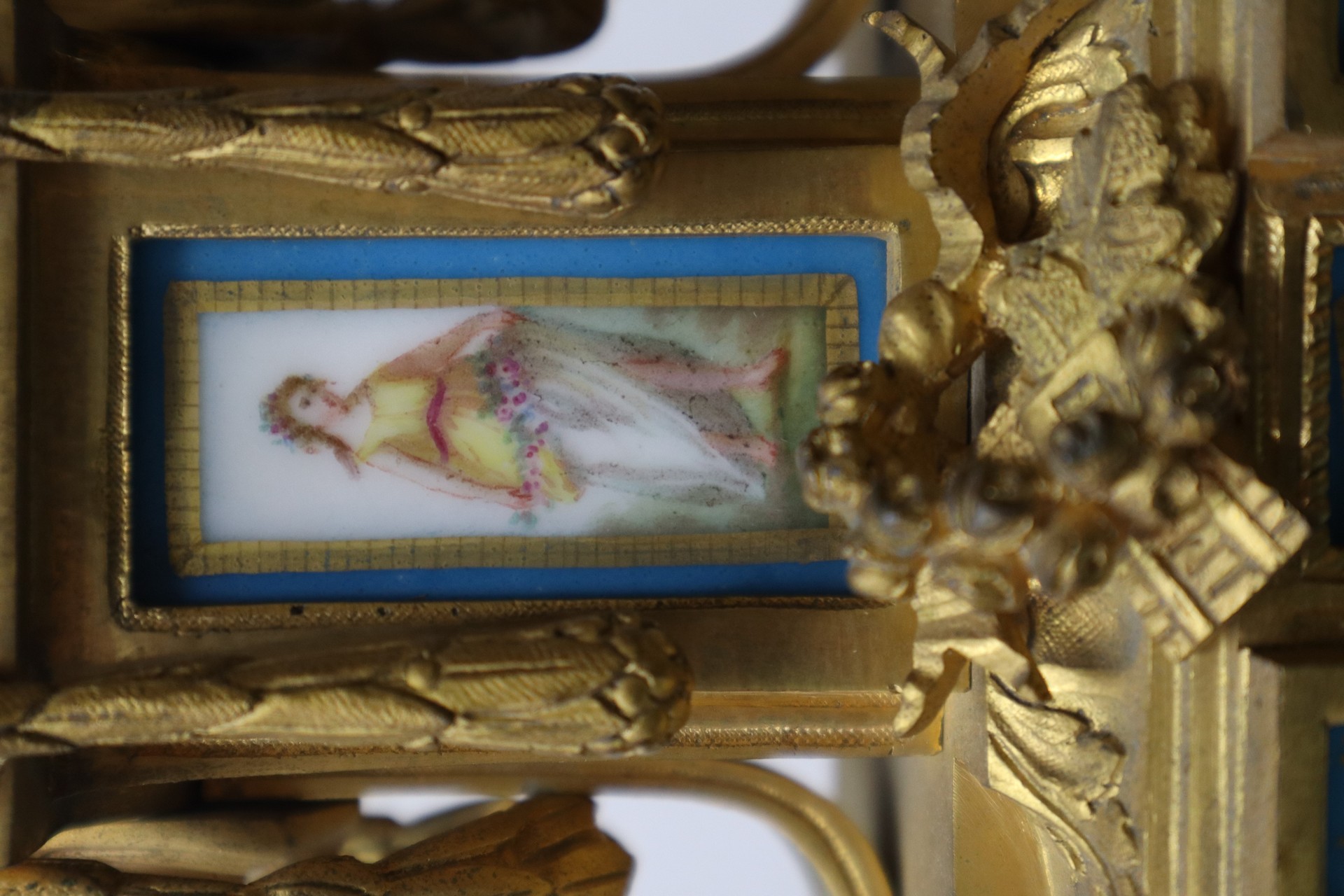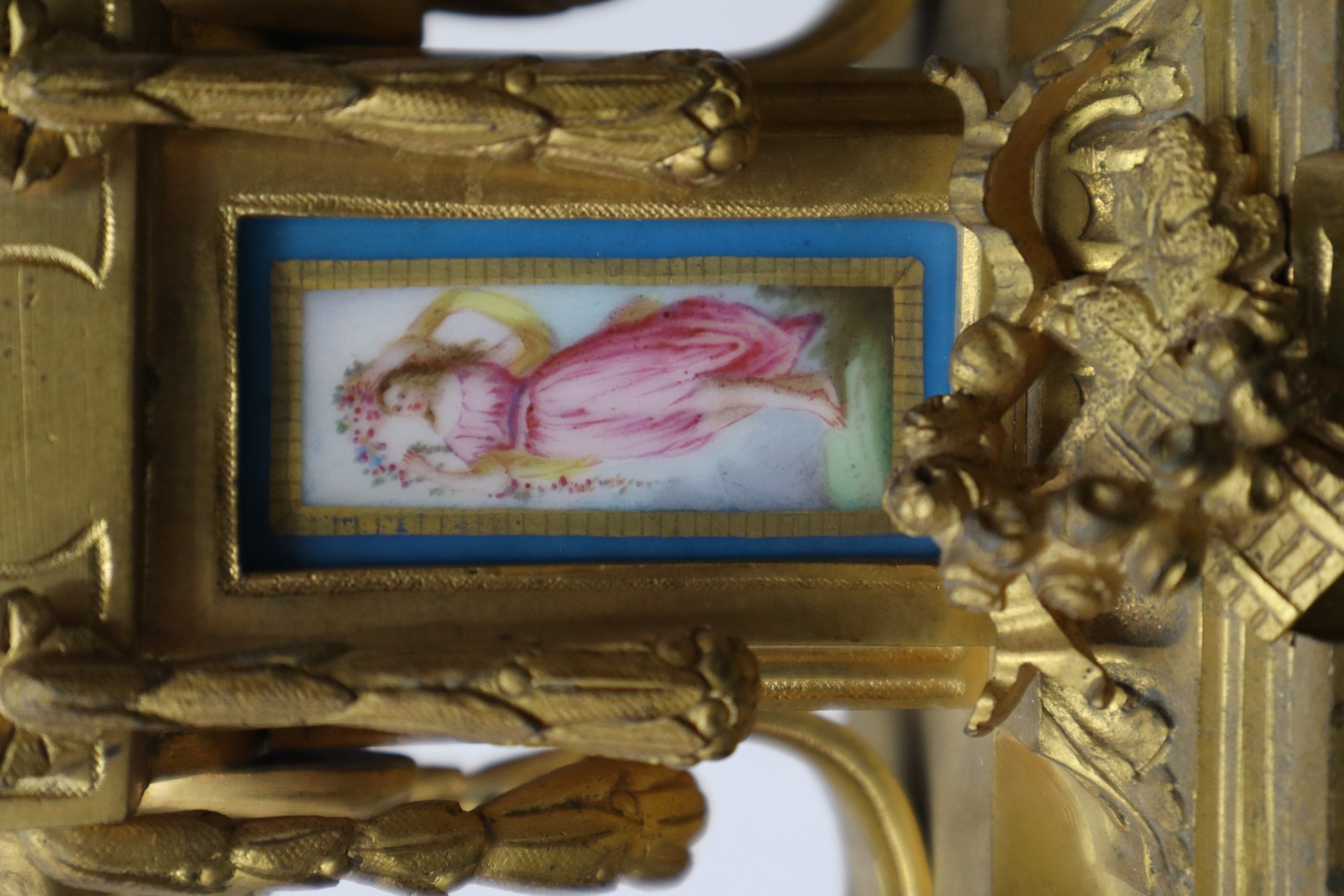 Trittico con orologio e coppia candelieri in bronzo dorato e porcellane miniaturizzate , Napoleon III, 19th century France