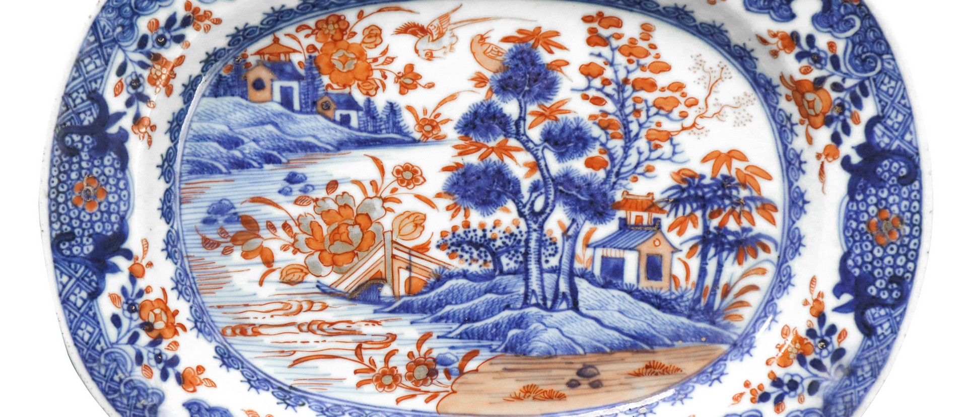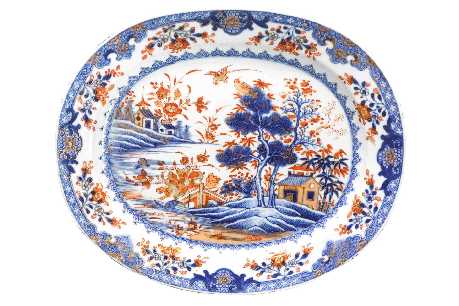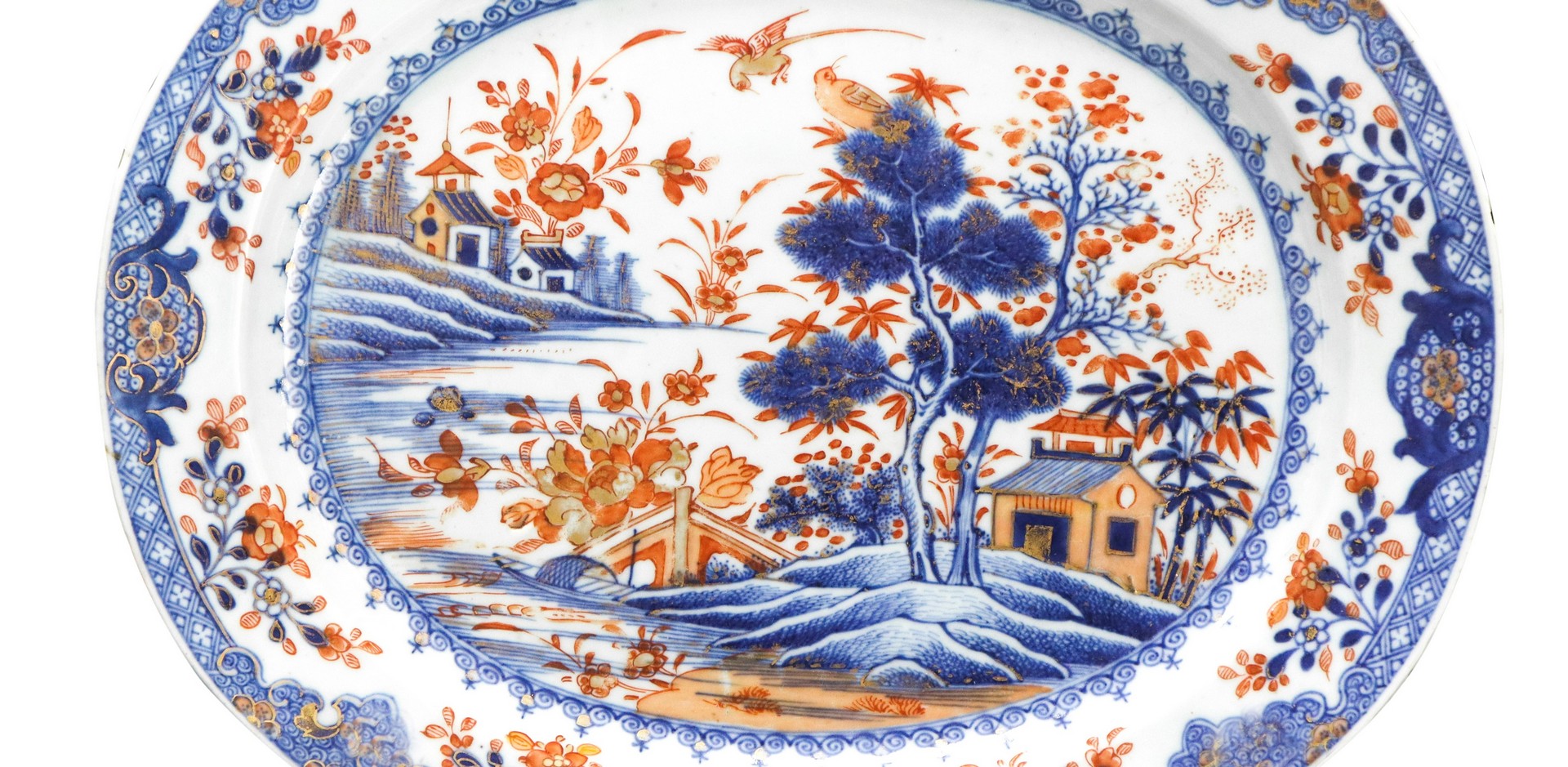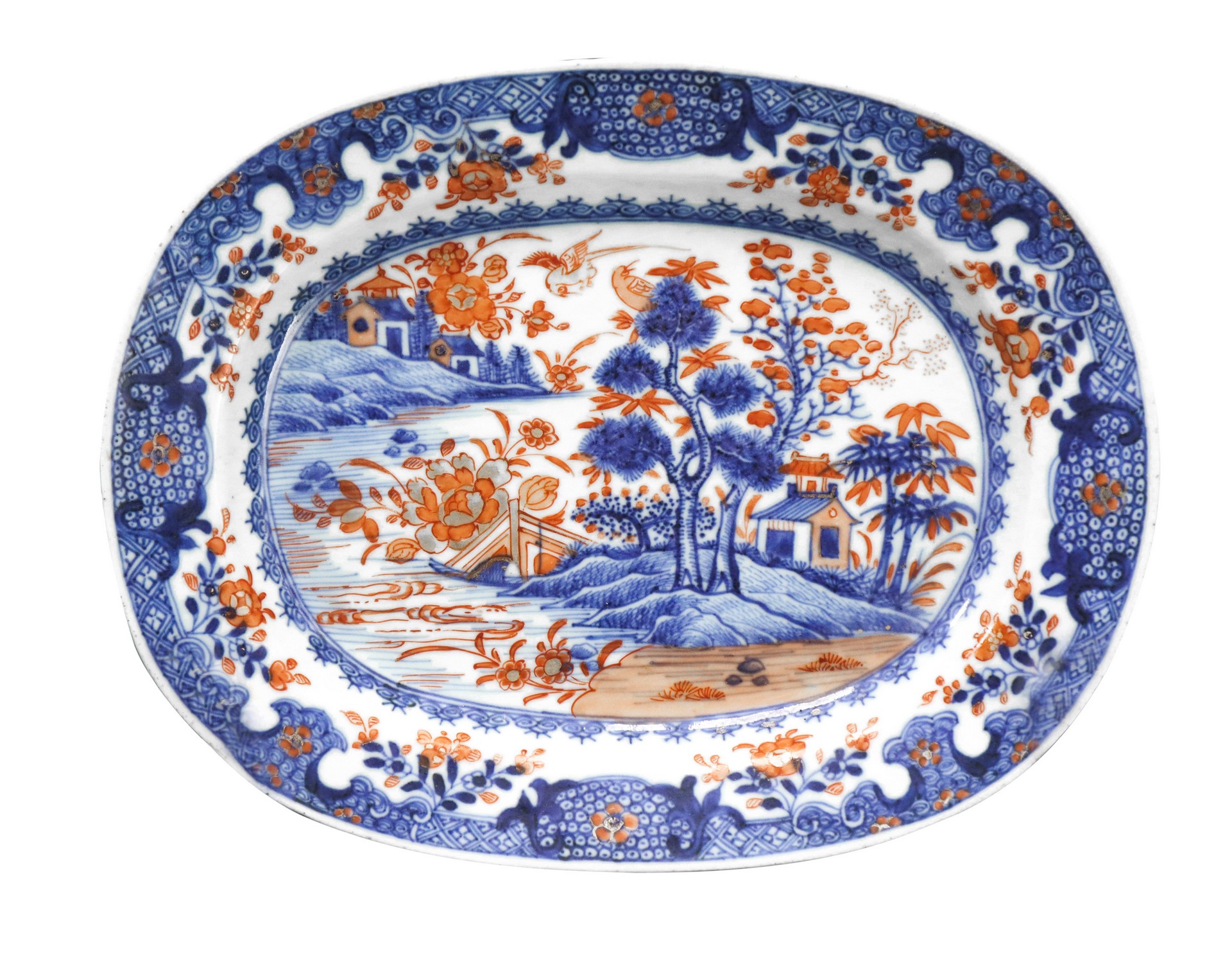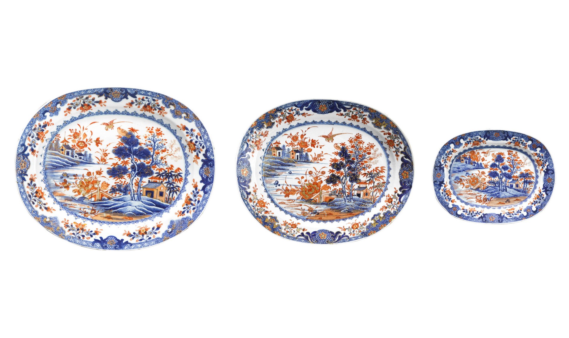 Trittico di piatti da portata con raffigurazioni di paesaggi orientali, nineteenth century cm 26 x cm 20; cm 34 x cm 28; cm 38 x cm 32 Compagnia delle Indie. Presenti leggere filatureCompagnia delle Indie. Presenti leggere filature