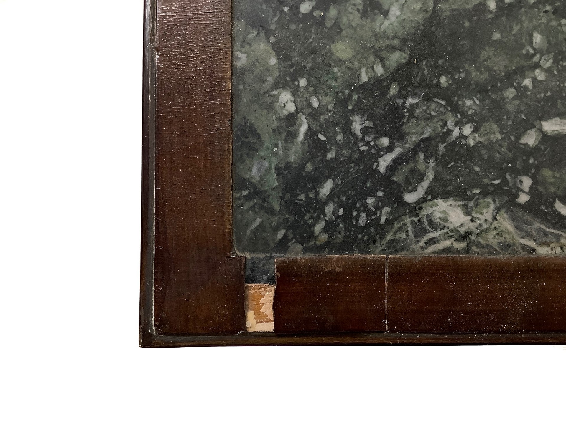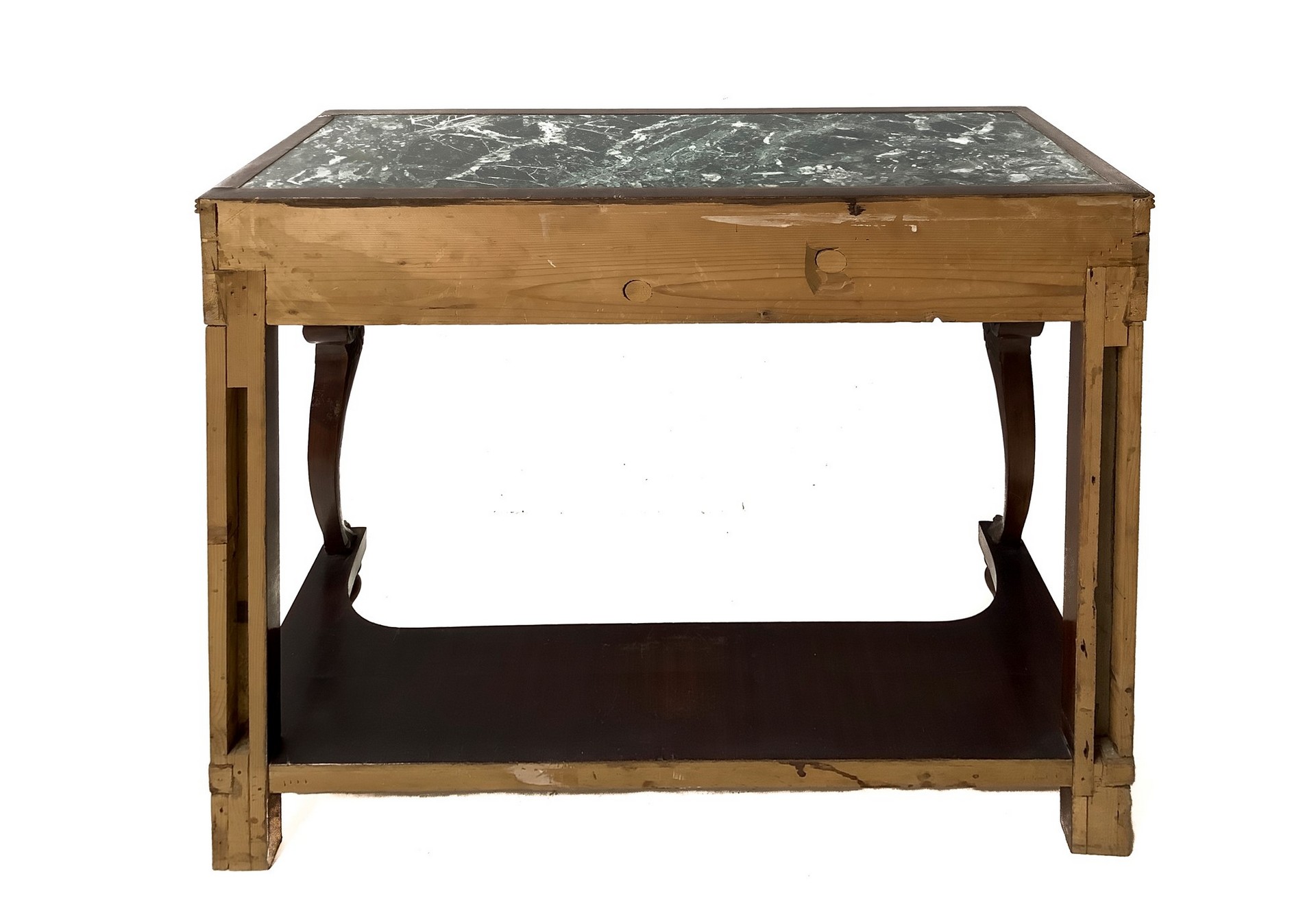 Console in legno di mogano, Nineteenth century h cm 85x97x33 Con marmo incassato al piano verde bardiglio e gambe anteriori a forma di cigniCon marmo incassato al piano verde bardiglio e gambe anteriori a forma di cigni