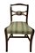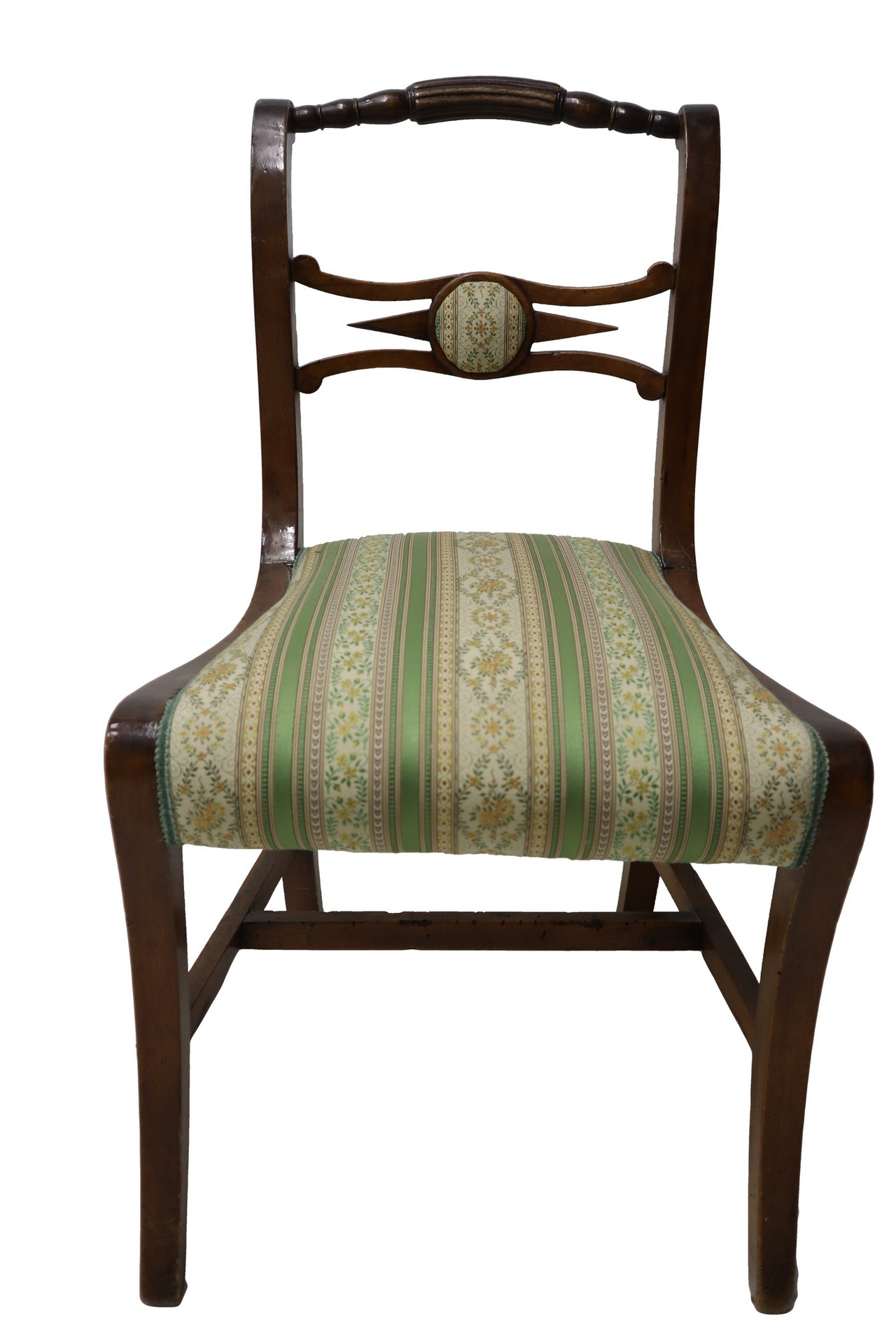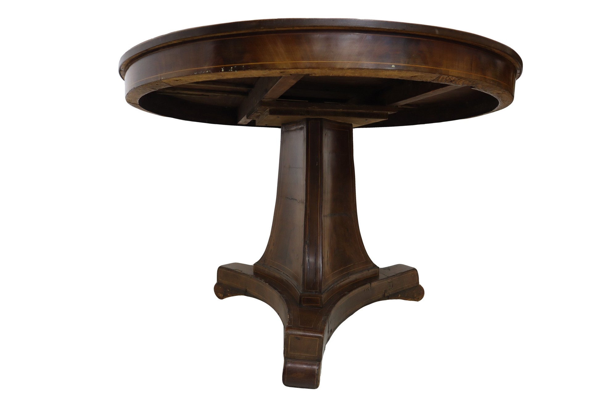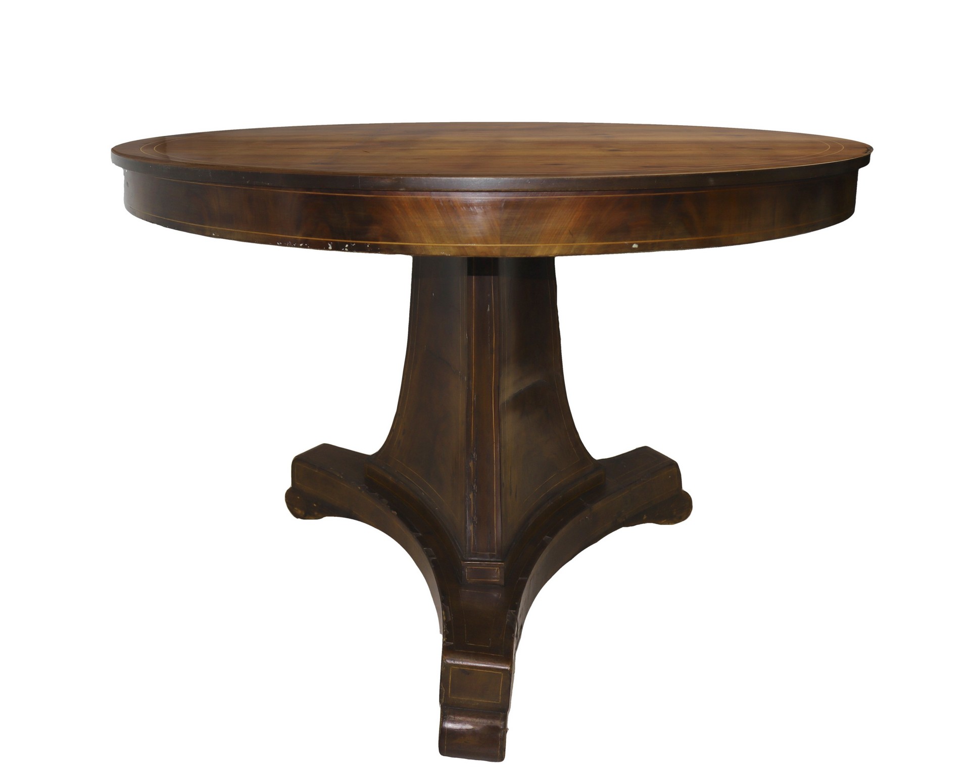 Tavolo rotondo in legno di mogano con n.6 sedie, nineteenth century h cm 80, diamentro 118; sedie h cm 83 x seduta cm 42 Base a tre razze, piano e piede filettato in legni chiari. Da restaurareBase a tre razze, piano e piede filettato in legni chiari. Da restaurare