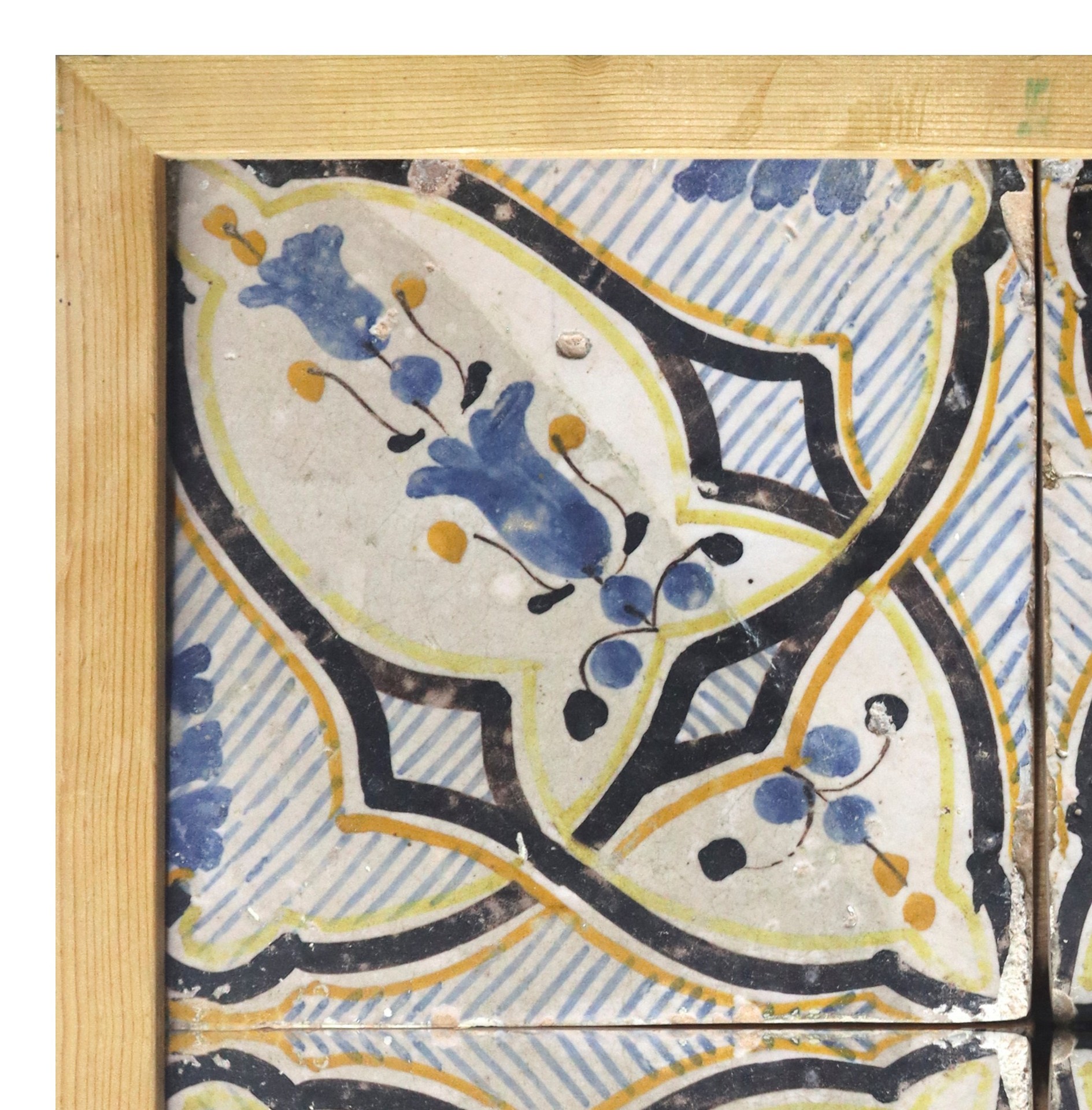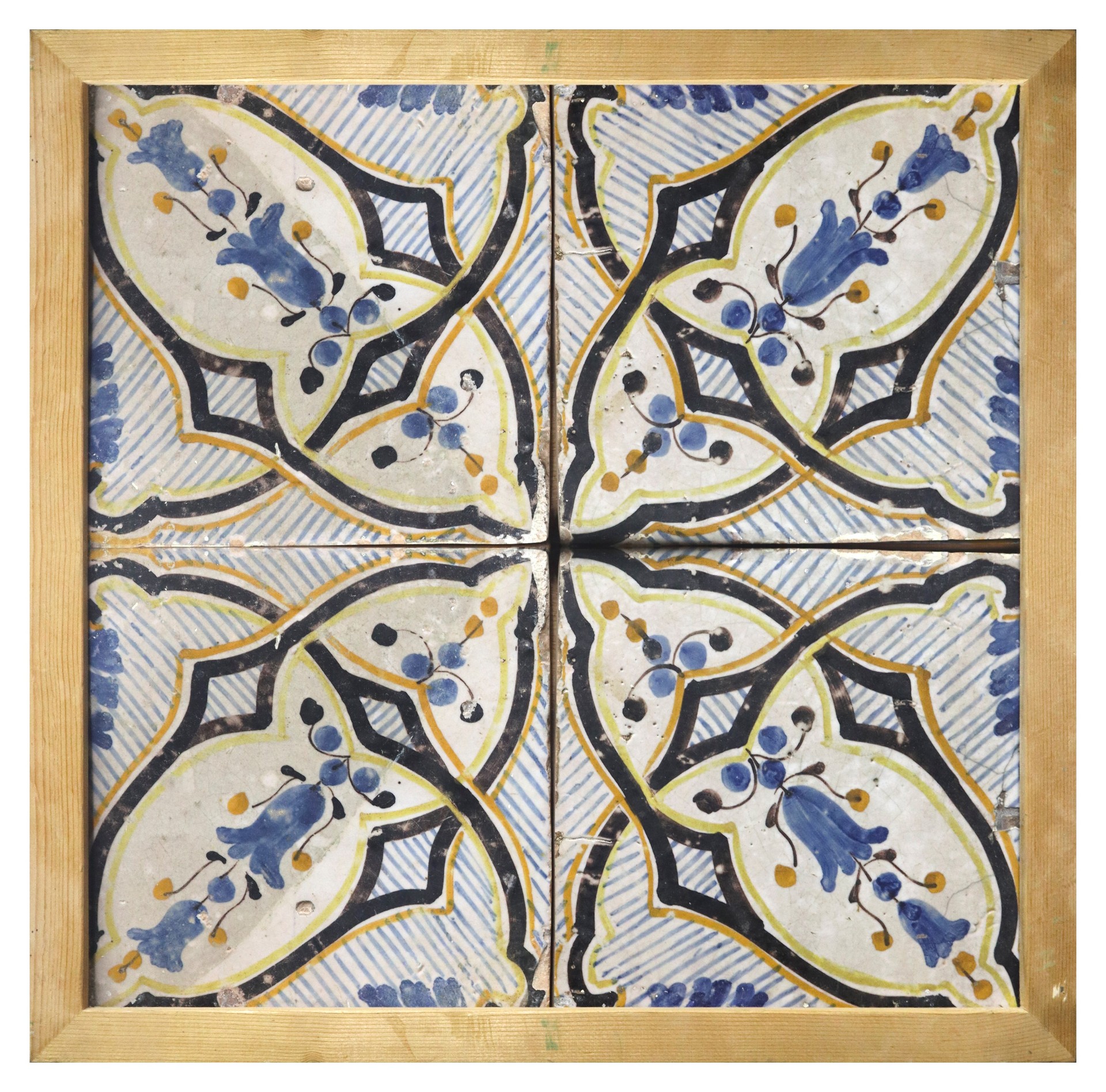 Composizione di N.4 Mattonelle in maiolica, Nineteenth century cm 20 x cm 20 cad. Nei toni dell'azzurro con disegni floreali, in corniceNei toni dell'azzurro con disegni floreali, in cornice