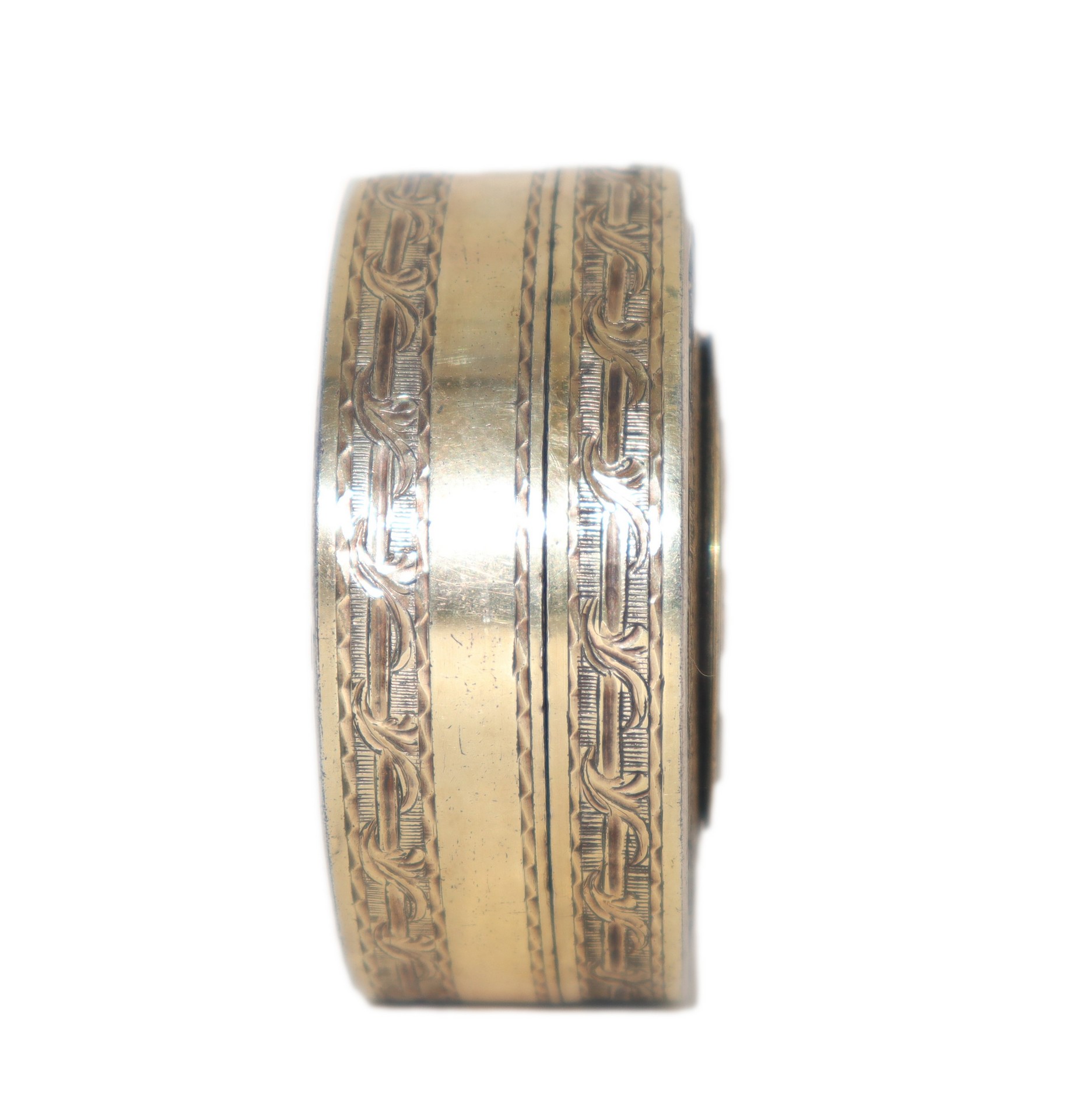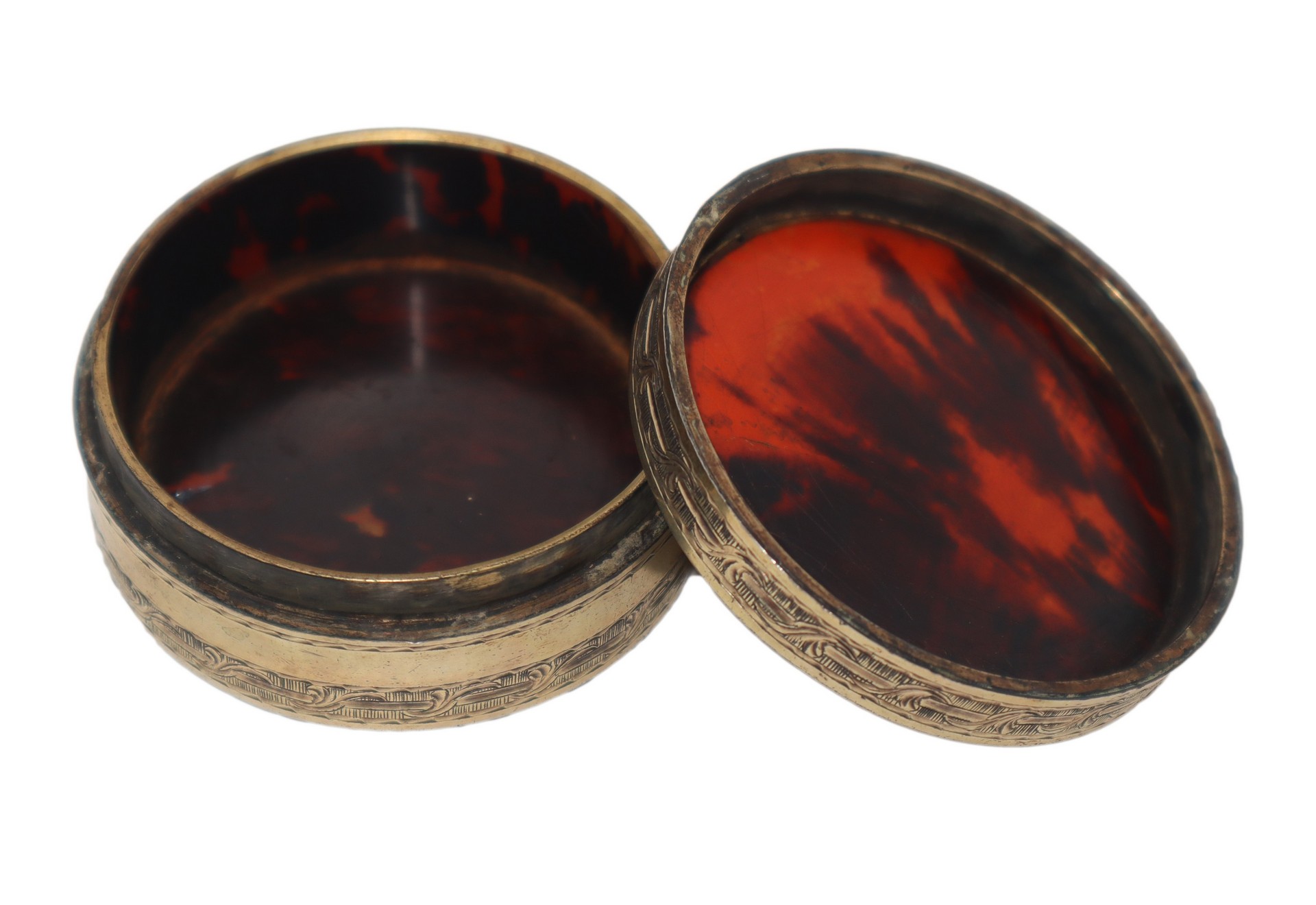 Scatola rotonda con miniatura centrale di Maria Antonietta, nineteenth century h cm 3, diametro cm 7 In metallo dorato, interno in tartarugaIn metallo dorato, interno in tartaruga