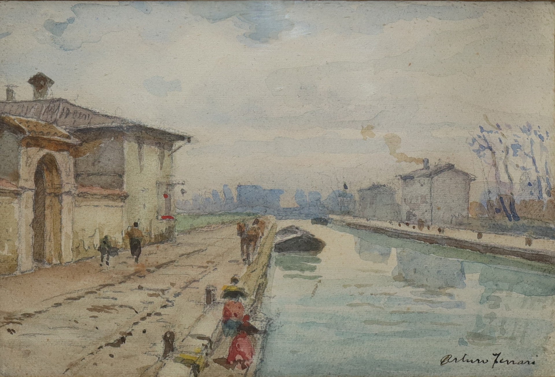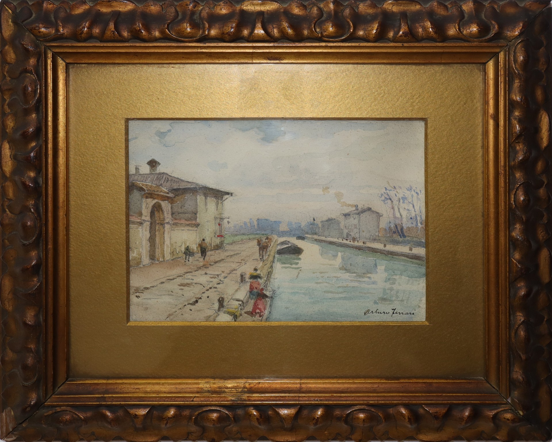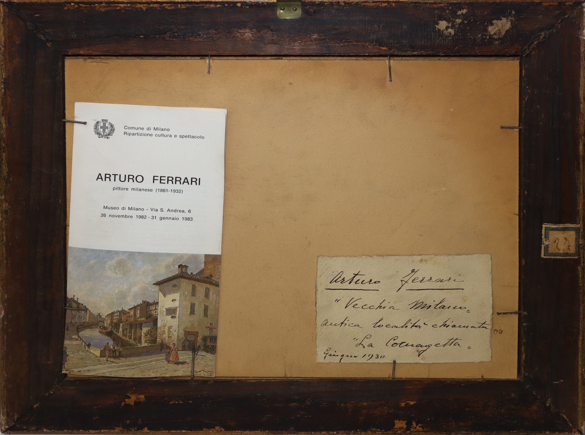 Arturo Ferrari (1861-1932) - Localita sui navigli cm 16 x cm 22, in cornice cm 34 x cm 40 acquarello Firmato a destra Arturo Ferrari. Sul retro scritta ''Vecchia Milano, antica località chiamata la ?''