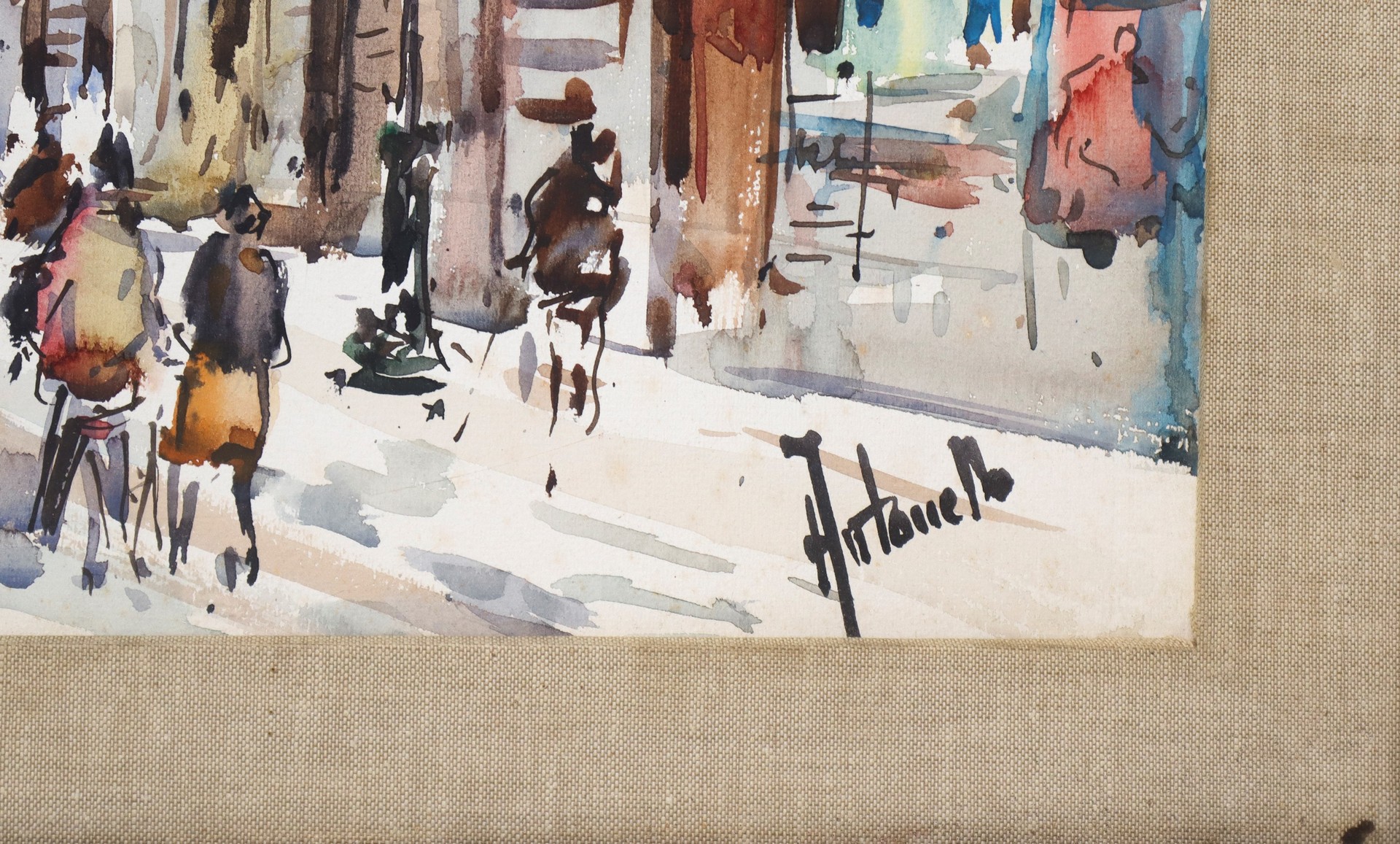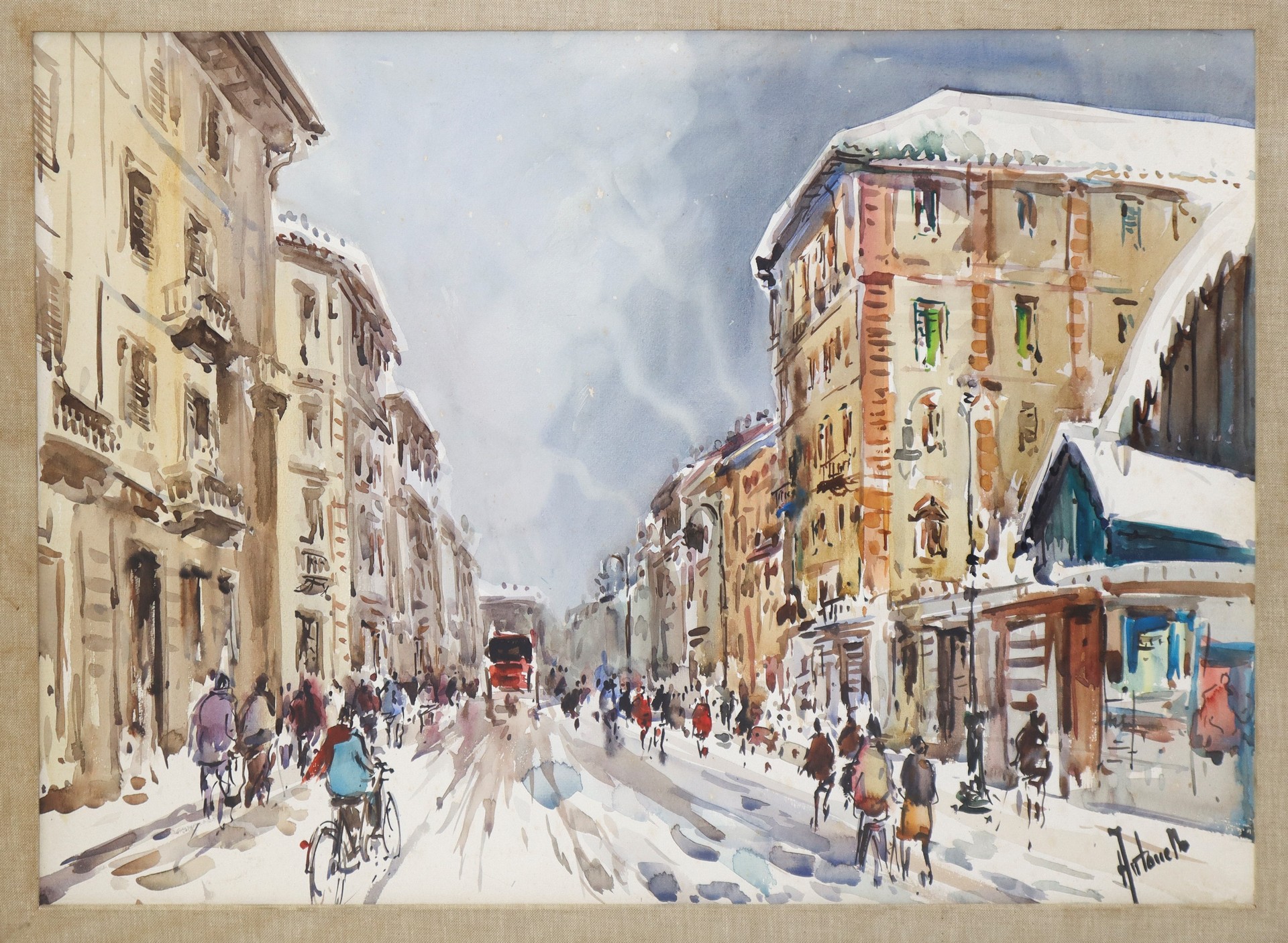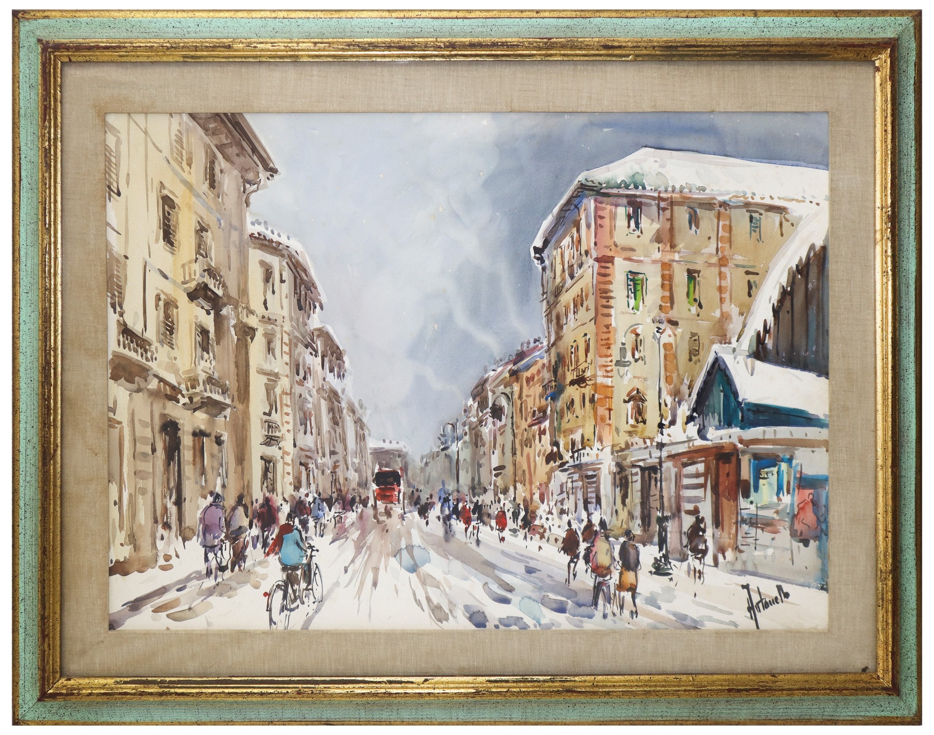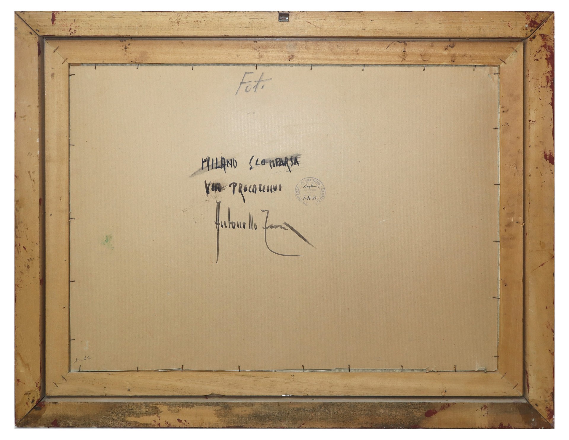 Milano scomparsa via Procacccini cm 50 x cm 70, in corncice cm 68 x cm 88 olio su cartoncino Firmato sul retro Antonello e titolato ''Milano scomparsa via Procacccini''. Timbro della Galleria Laghezza de Bartoli Castellanza Varese