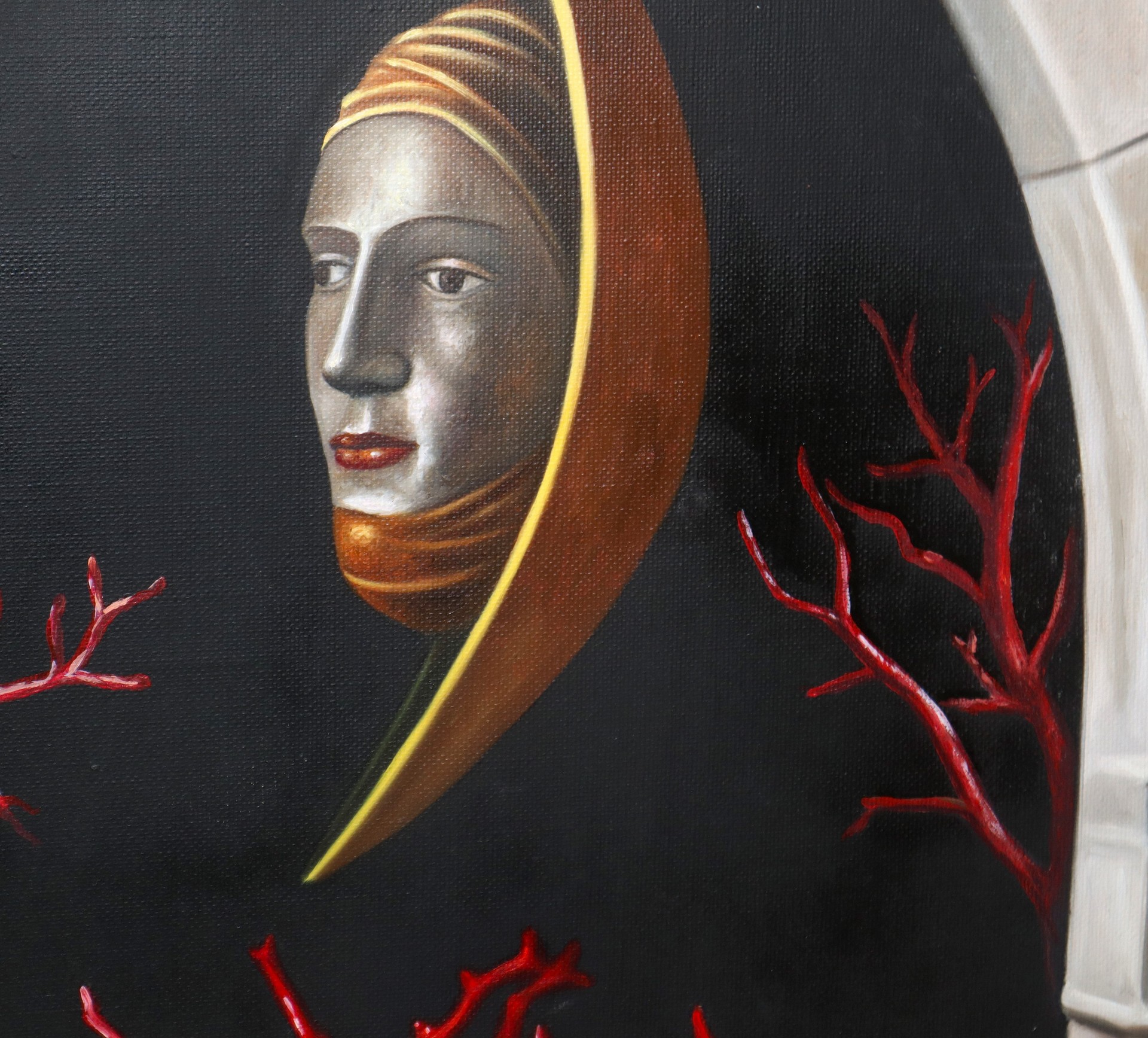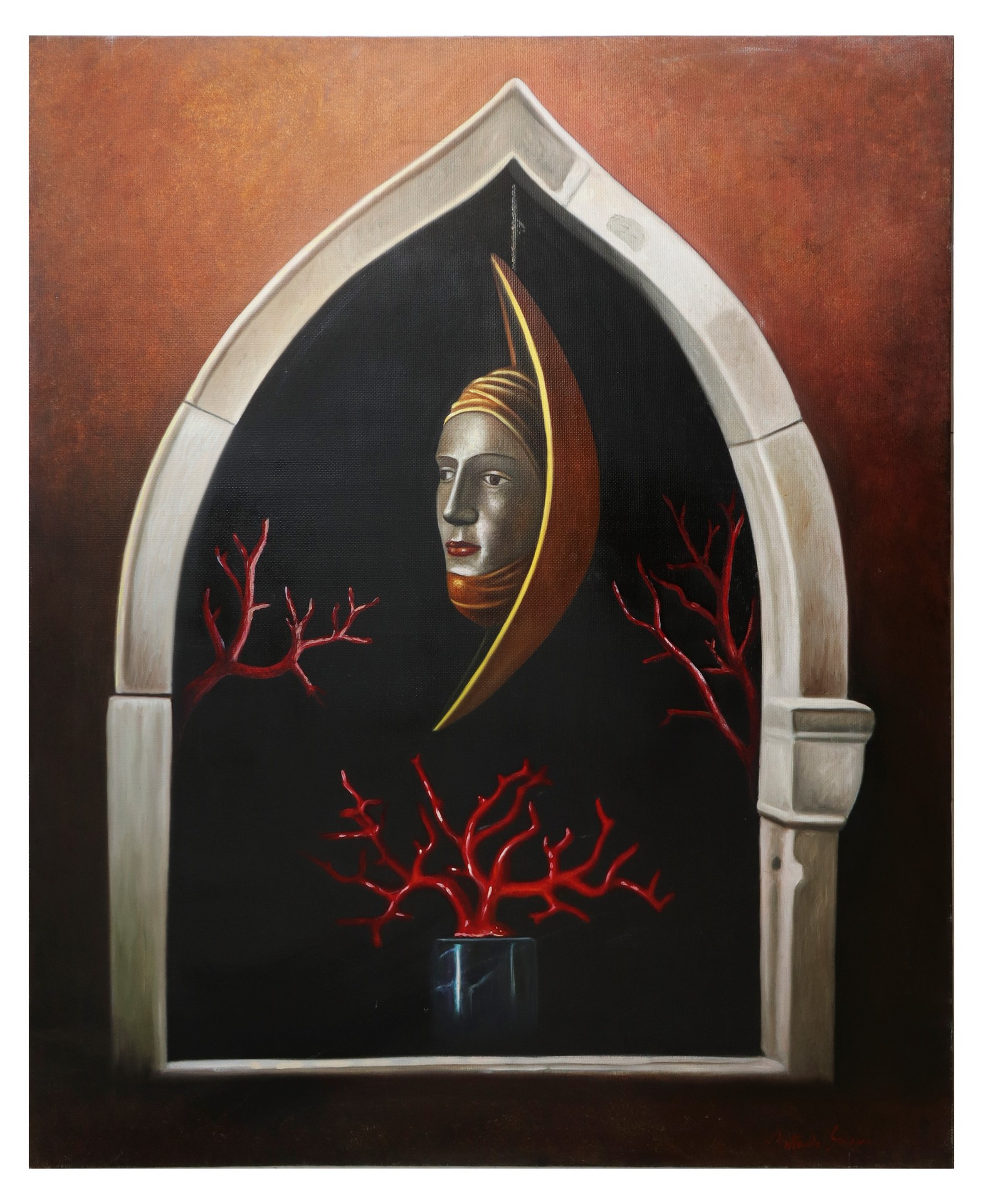 Antonio Sciacca (Catania 1957) - Volto di luna con coralli cm 110 x cm 90 olio su tela Firmato in basso a destra e sul retro. Presenti tracce di umidità