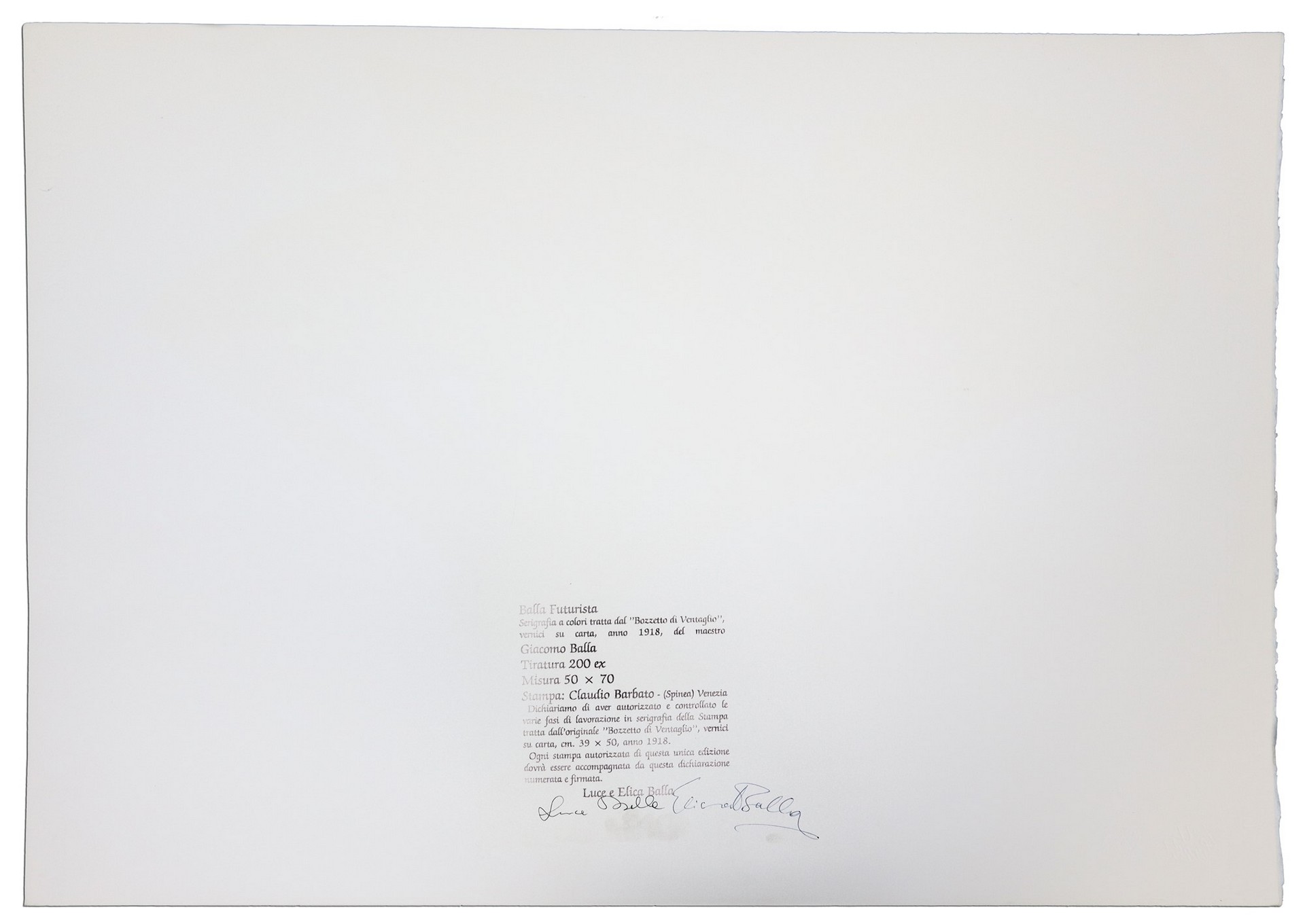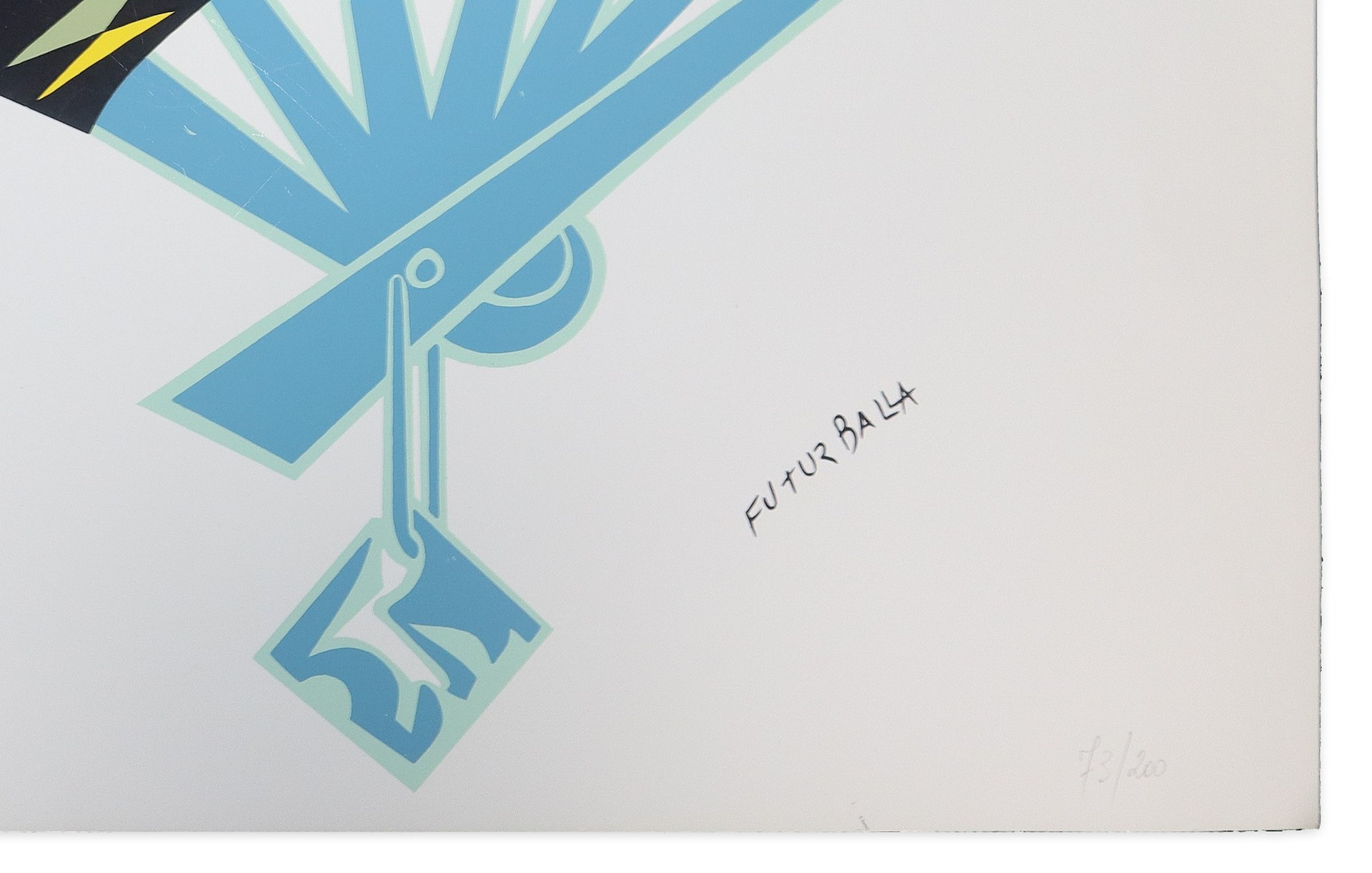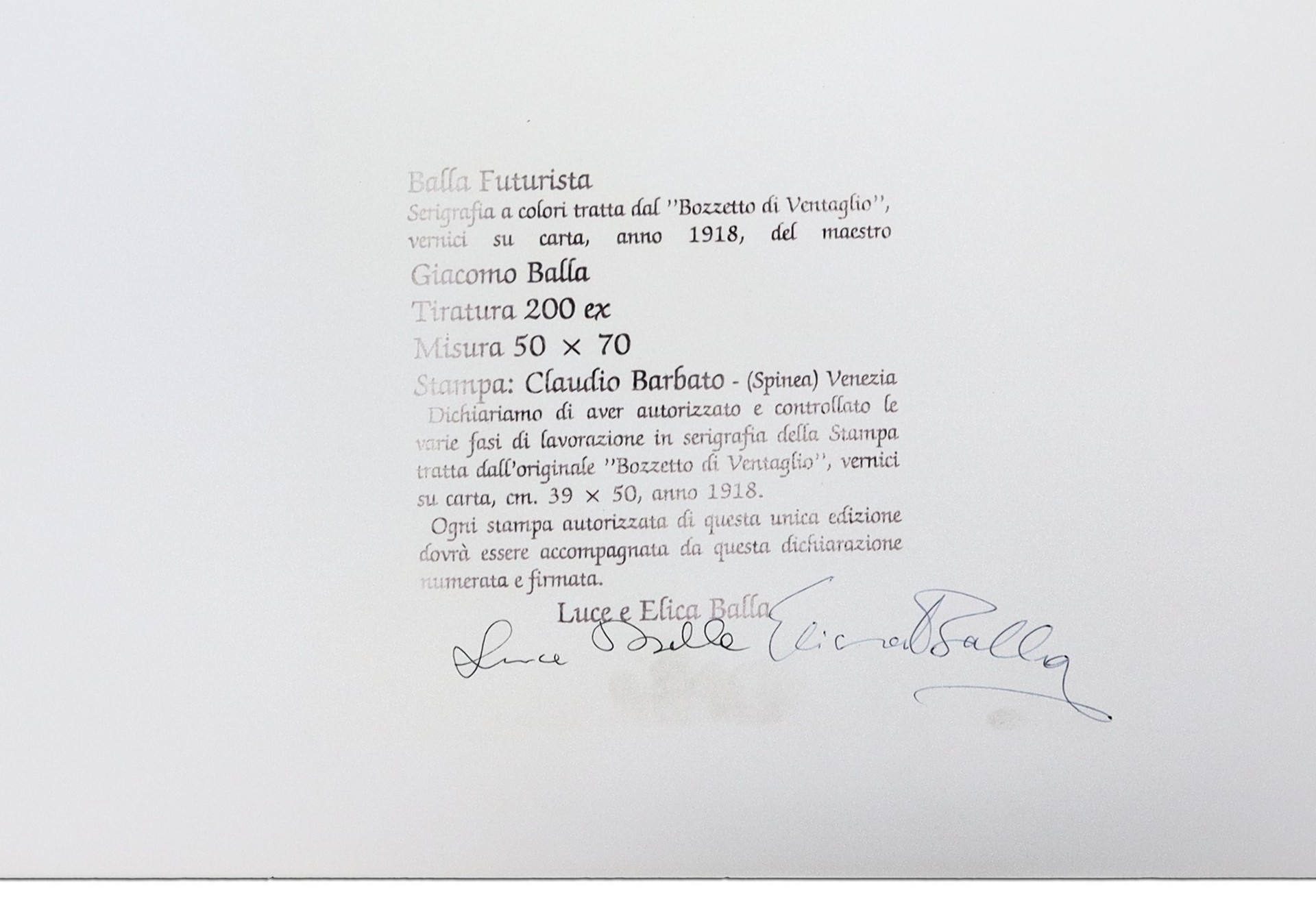Giacomo Balla (Torino 1871-Roma 1958) - Ventaglio, 1918 Cm 50x70 Litografia a colori Firmata in basso a destra FuturBalla. Tiratura N. 73/200. Serigrafia a colori tratta dal ''Bozzetto di Ventaglio'', tiratura 200 ex, sul retro Certificazione di Luce ed Elica Balla.
