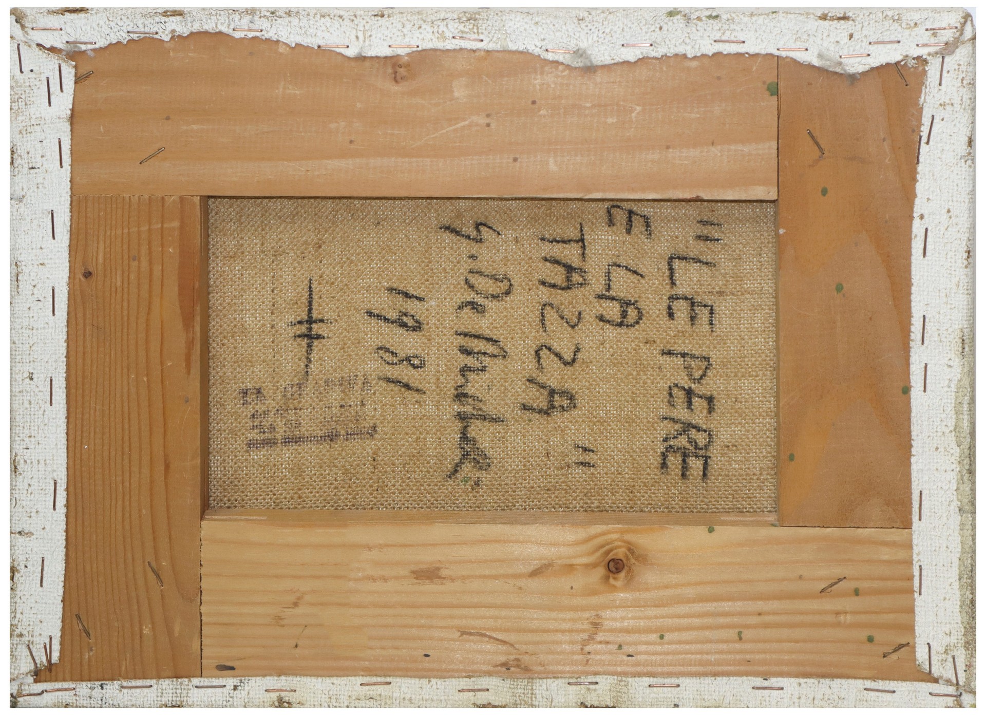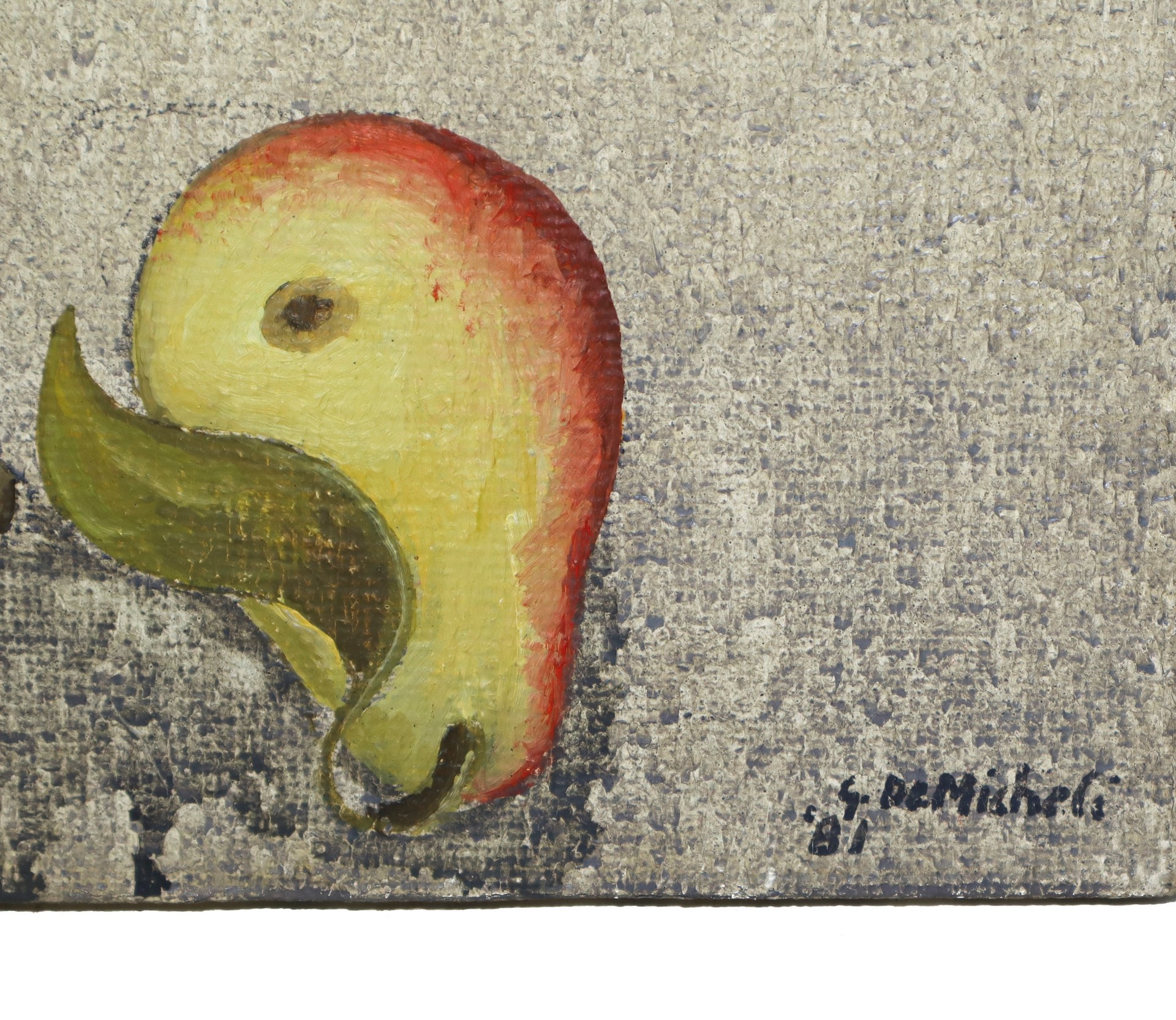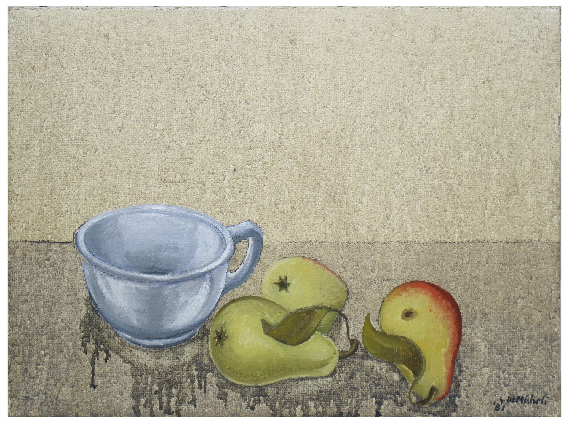 Gioxe De Micheli (Milano 1947) - Le pere e la tazza, 1981 cm 30x40, opera priva di cornice Olio su tela Firmato e datato sul fronte in basso a destra, firmato , titolato e datato al retro