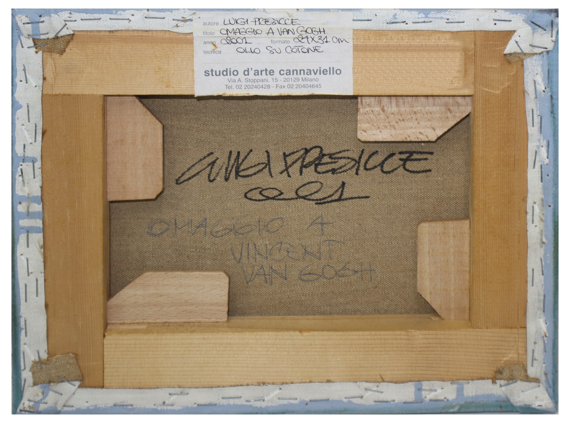Luigi Presicce (Lecce 1976) - Omaggio a Van Gogh, 2001 Cm 21x31 Olio su tela di cotone Firma , titolo e data. Etichetta dello Studio d'arte Cannaviello (Milano). Autentica su fotografia