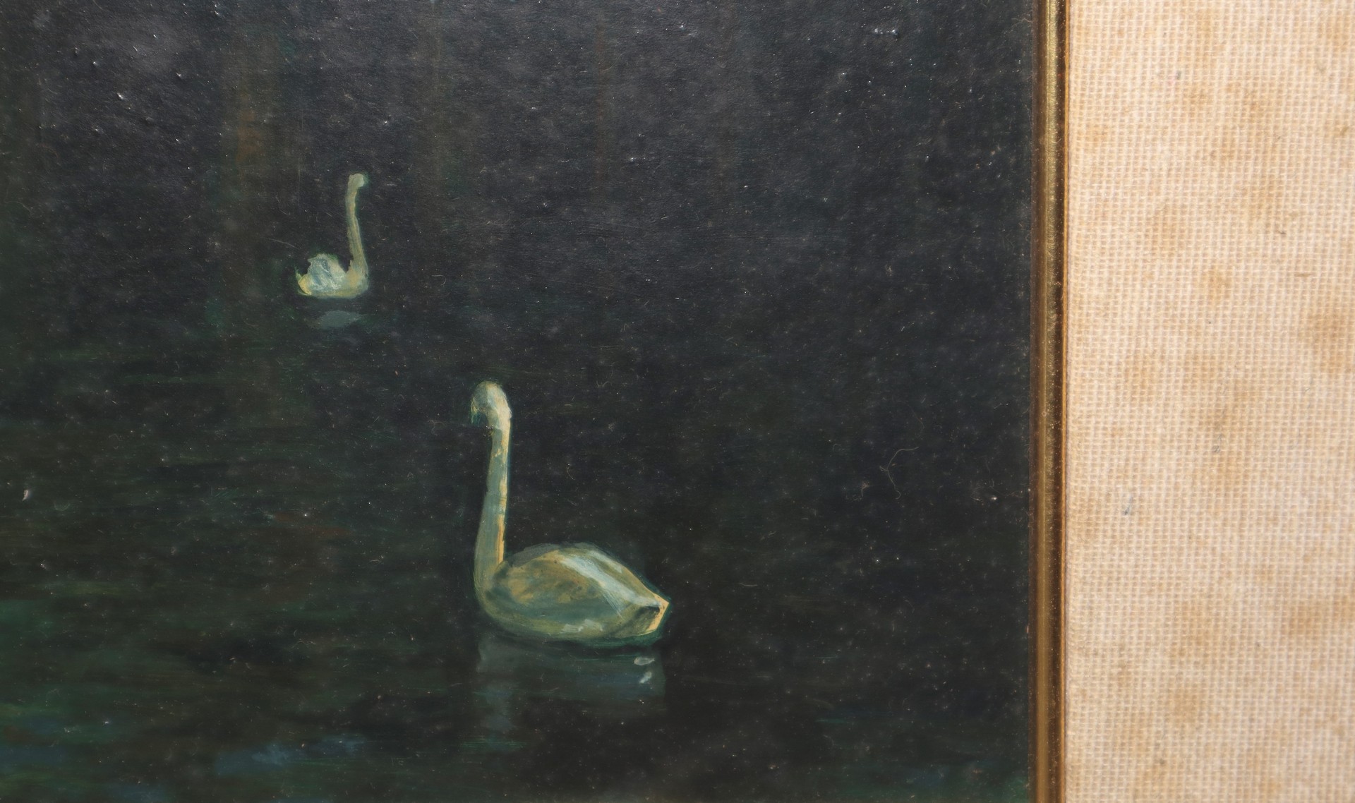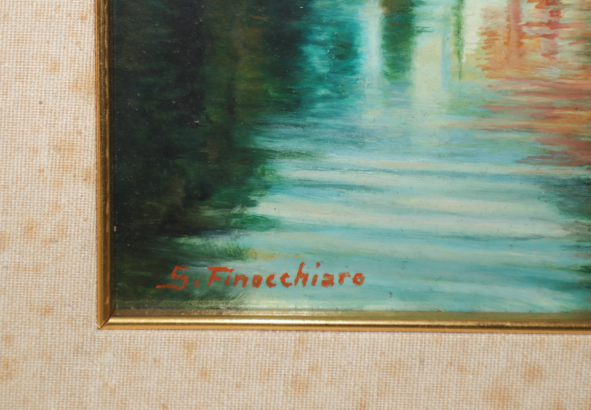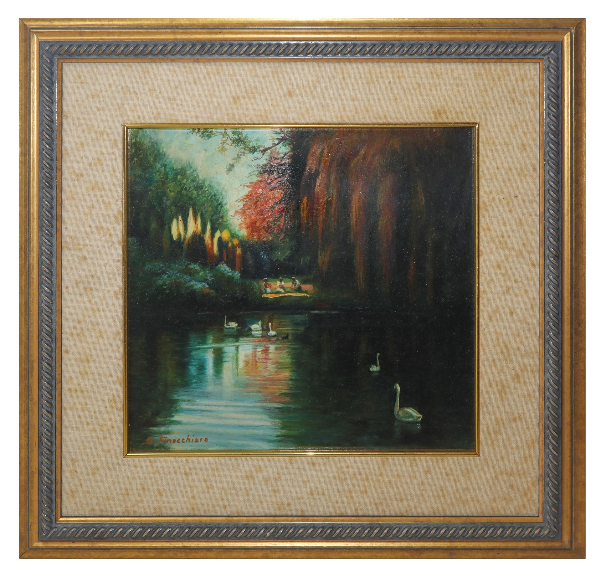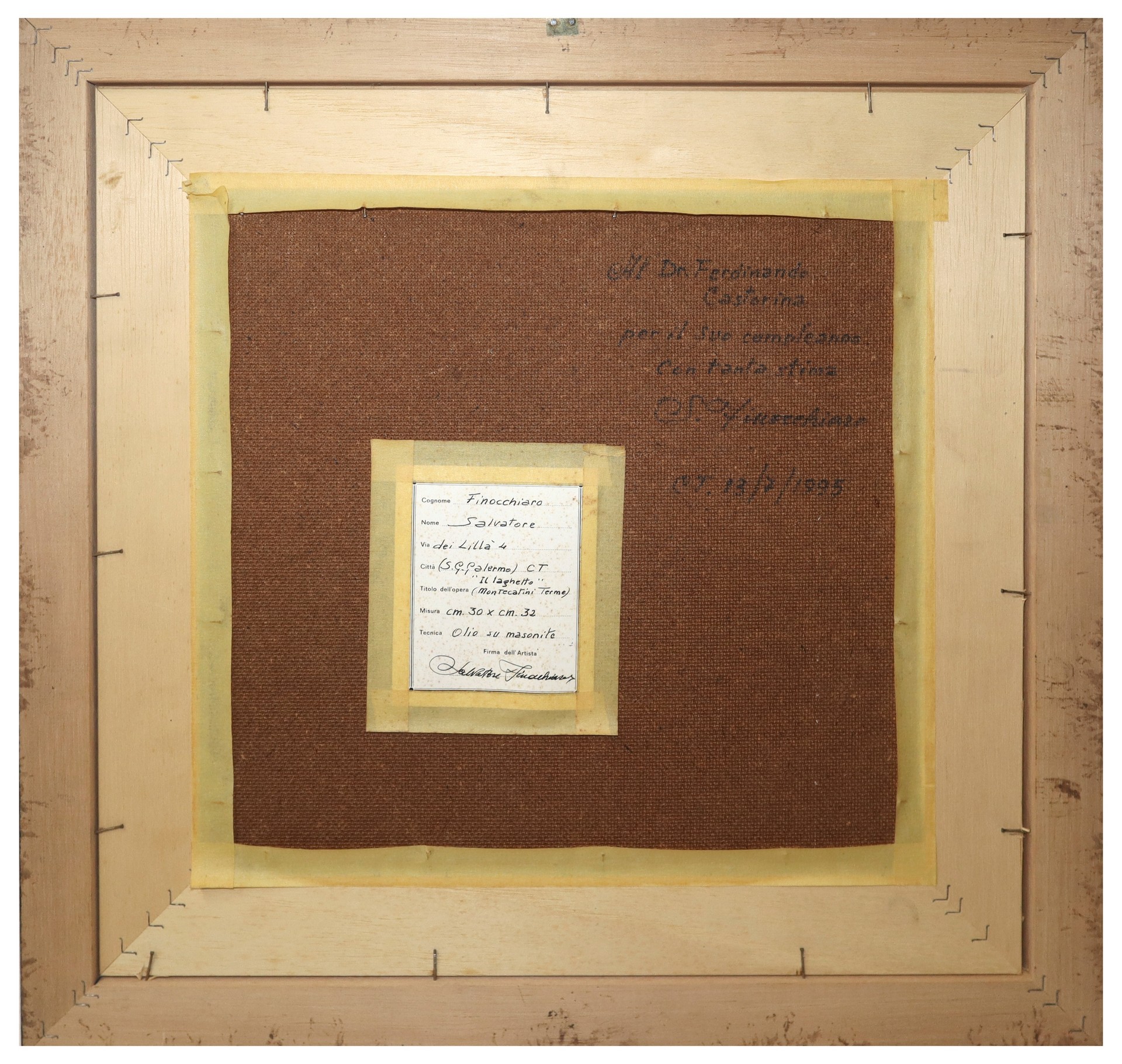 Salvatore Finocchiaro - ''Il laghetto'' cm 30x32; in cornice cm 50x48 olio su masonite Firmato in basso a sinistra e sul retro firmato con dedica e firmato 1995