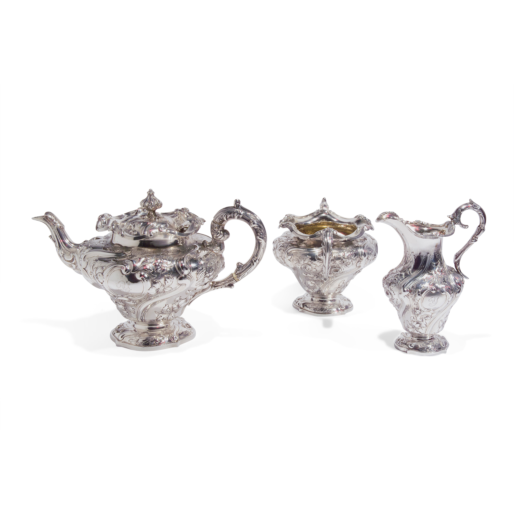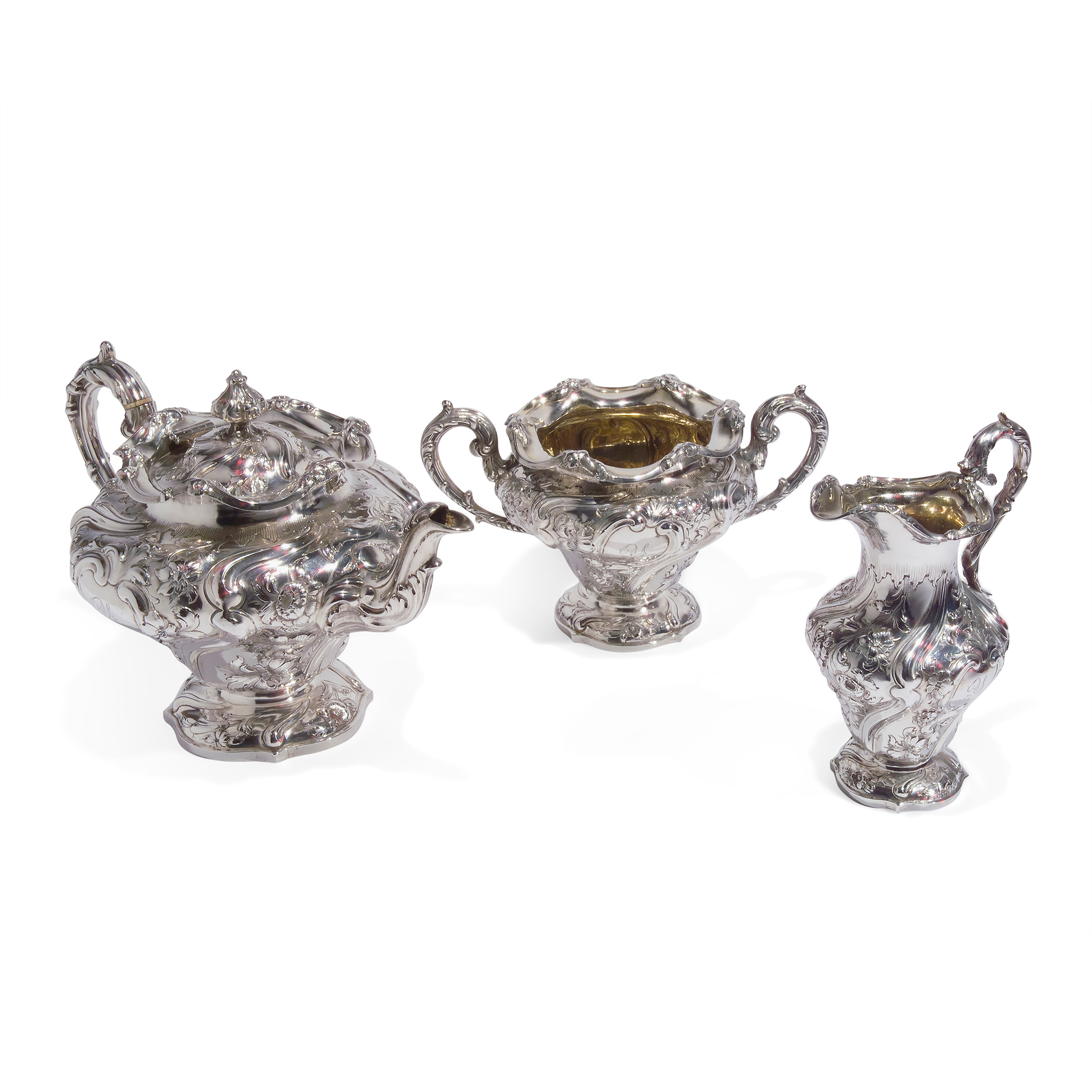 Composto da tre teiera, zuccheriera e lattiera, peso complessivo 1406 gr., dimensioni complessive max 17x30x19 cm.