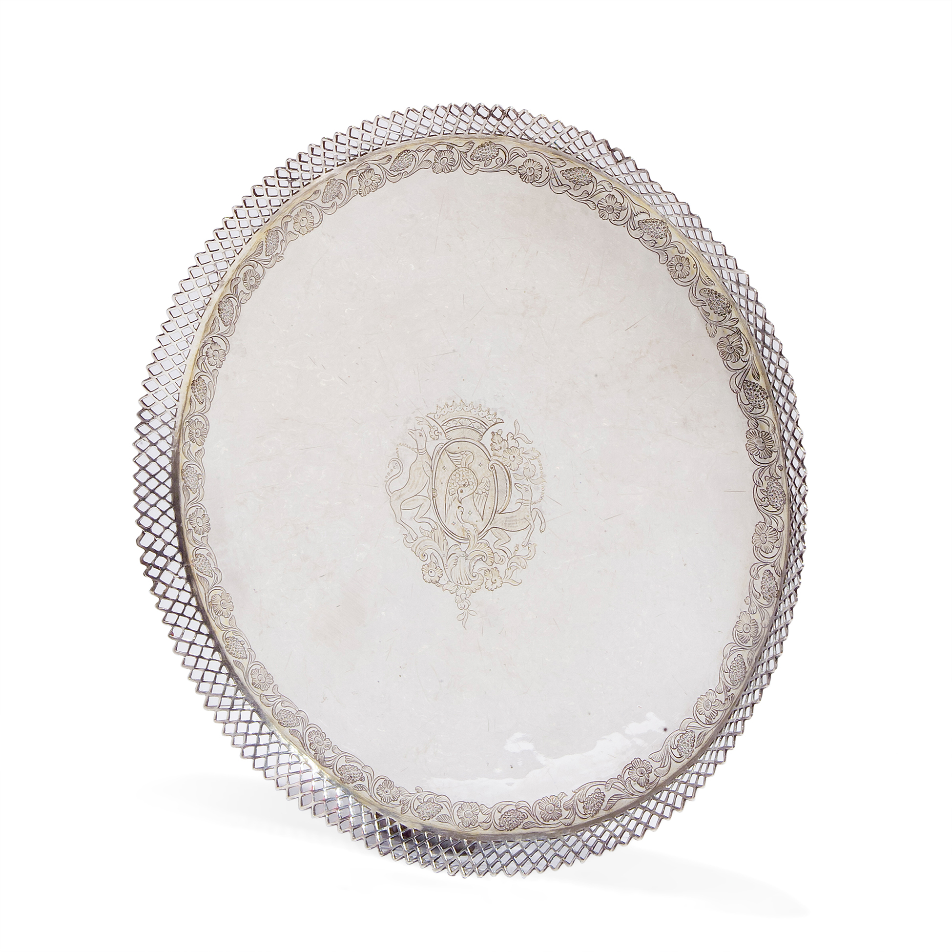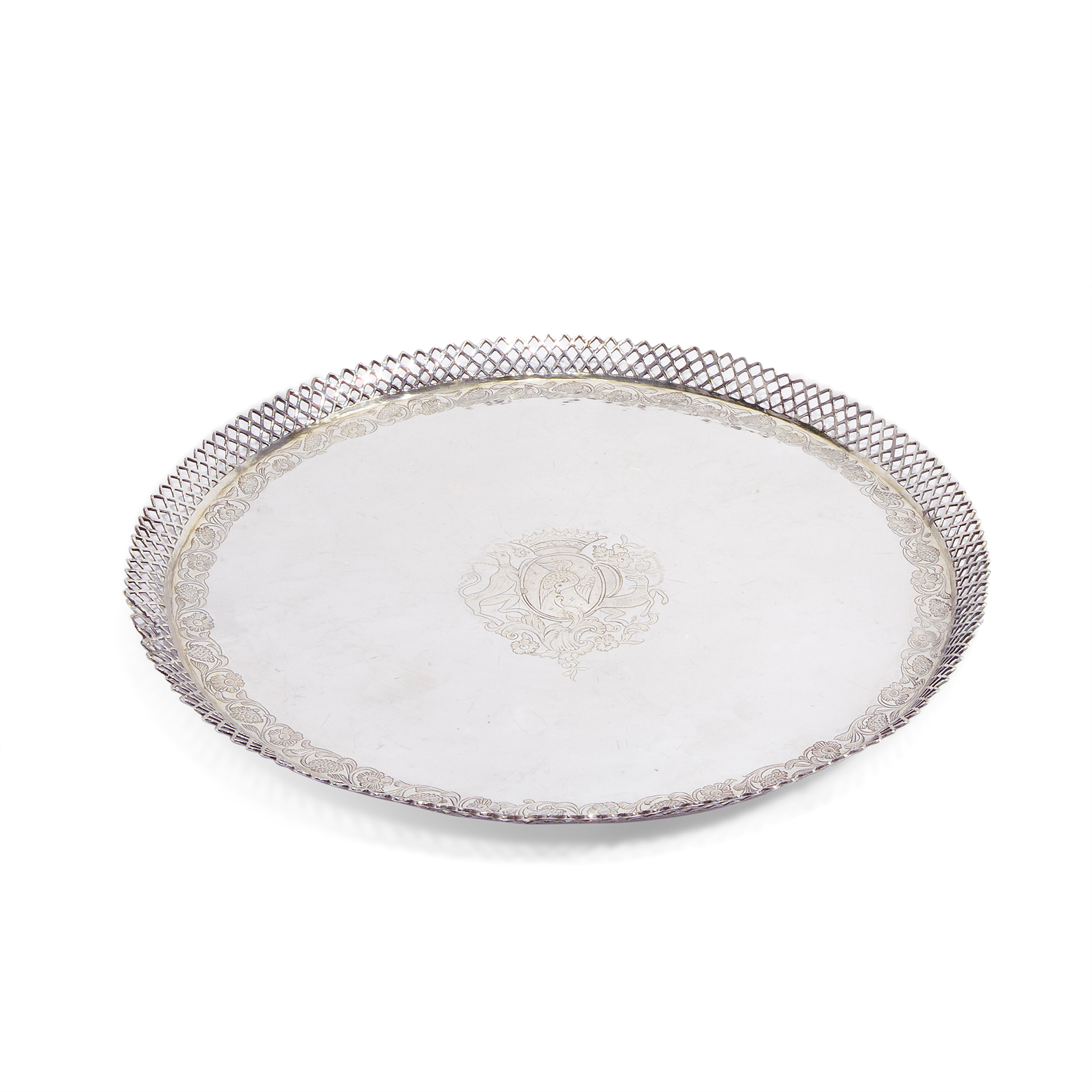 Decorato finemente con bordo lavorato a traforo; apparentemente privo di punzoni. Peso complessivo 546 gr., dimensioni complessive 2x31x31 cm.