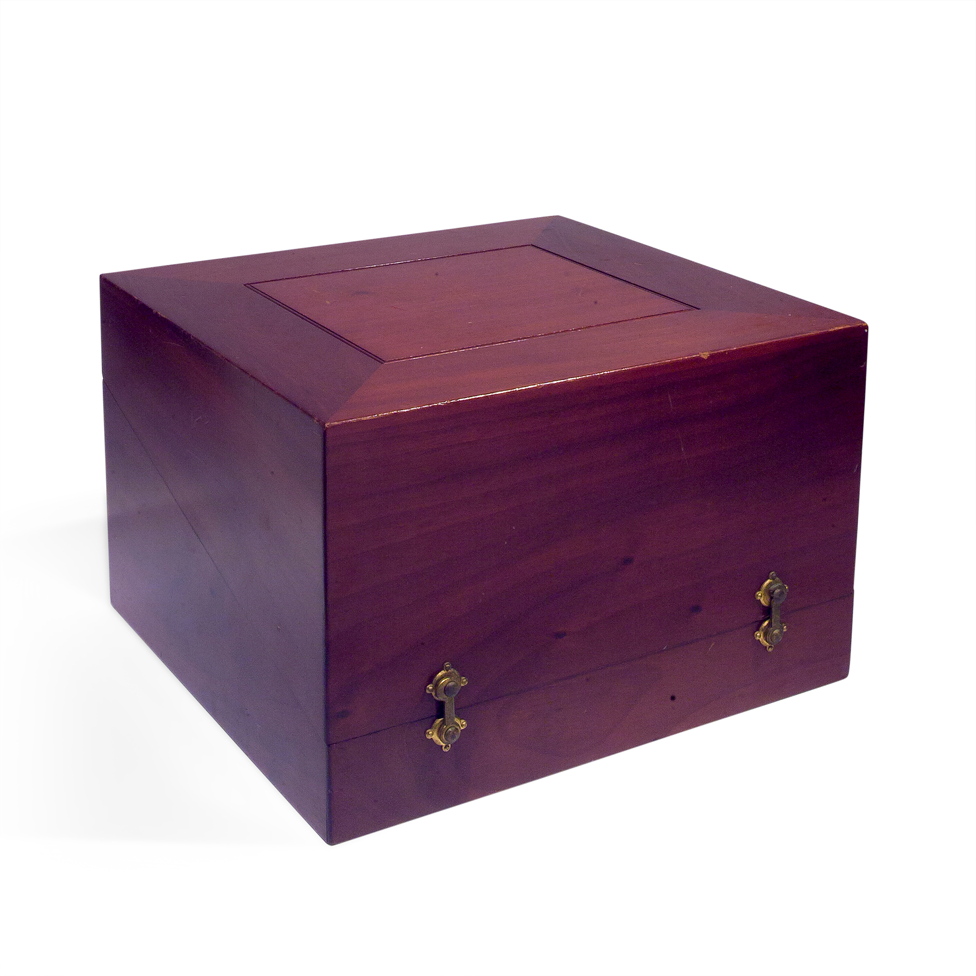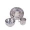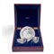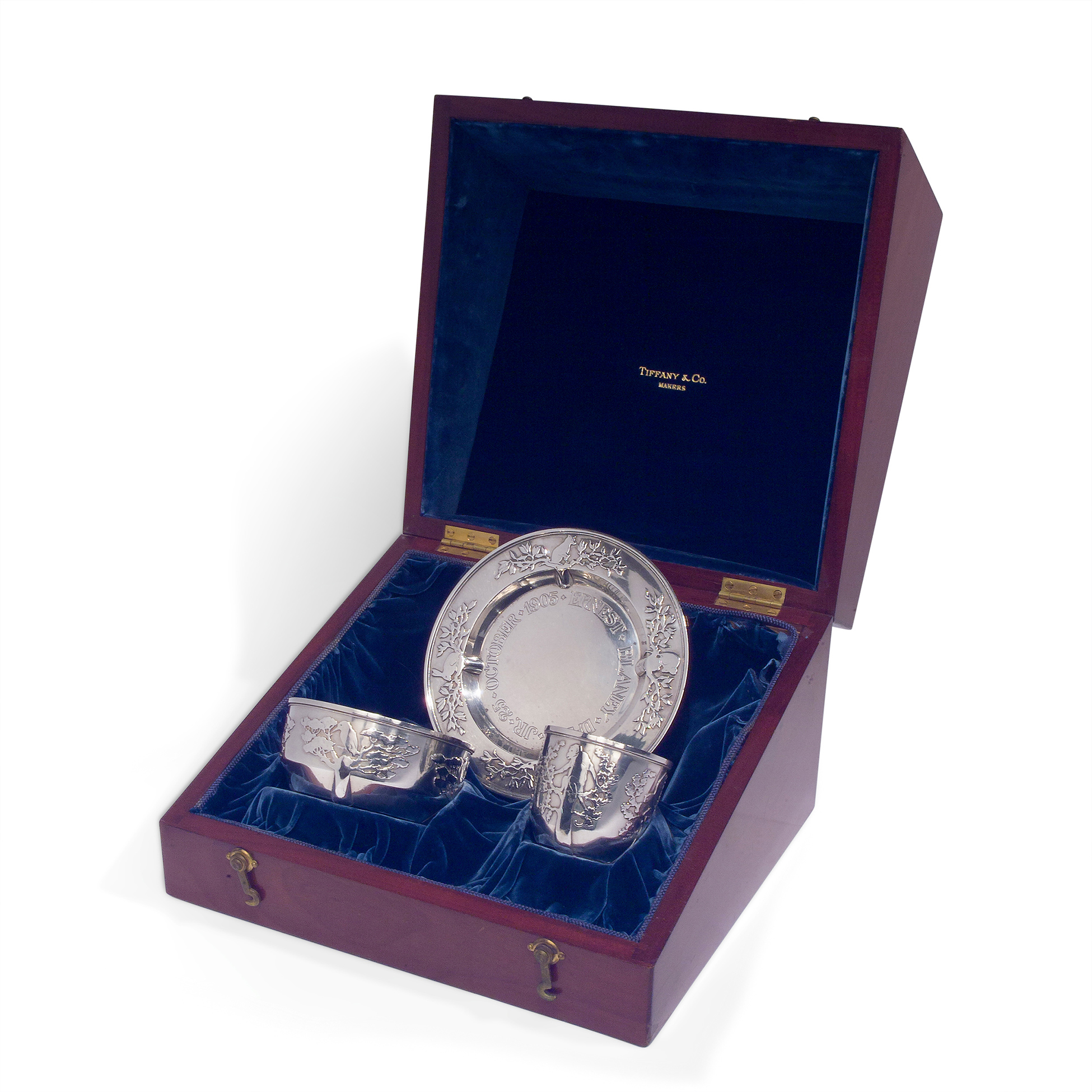 Composto da un bicchiere, una ciotola e un piatto custoditi in elegante custodia originale in legno e velluto blu. Peso complessivo 746 gr., dimensioni complessive scatola 21x32.5x30 cm.