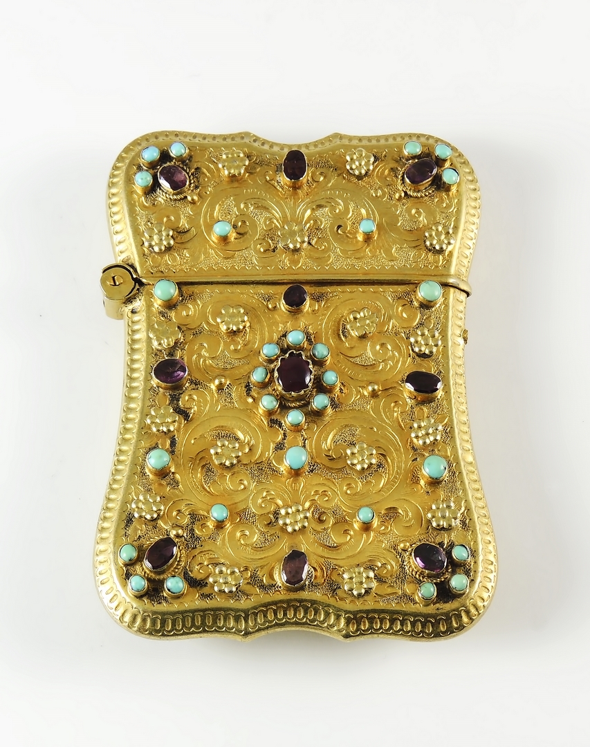 SCATOLA PORTA CARNET IN METALLO DORATO, TURCHESI E VETRO inizio del XX secolo di forma sagomata interamente sbalzata con foglie e fiori con applicazioni in pietre, entro scatola