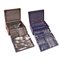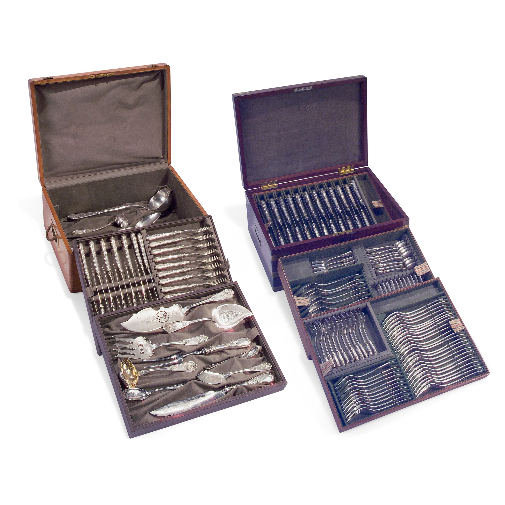 Doppio servizio con custodie in legno originali e manufatti dalla 'Bruckmann & Sohne'; composto da 182 pezzi in totale. Il primo servizio è composto da 12 forchette pesce, 22 forchette da tavola, 11 forchettine frutta, 24 cucchiaini, 12 cucchiai da tavola, 24 coltelli, 12 coltelli frutta e 11 cucchiaini da the. Il secondo servizio è composto da 17 posate da portata miste, 12 coltelli pesce, 12 forchette pesce. Peso complessivo 7321 gr., dimensioni prima scatola 21x45x32, seconda scatola 18x43.5x33.5 cm.