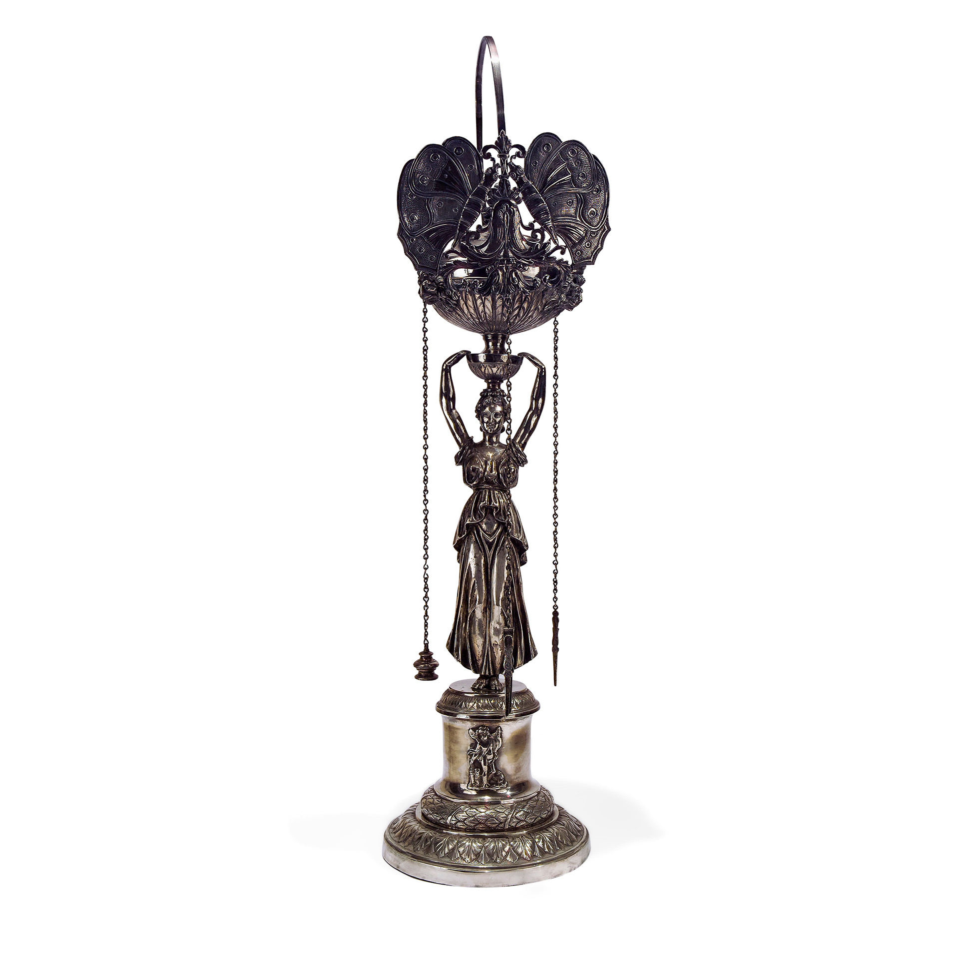Con figura femminile centrale e ventola a farfalla; argenteria romana, produzione di Angelo Giannotti. Peso complessivo 2966 gr., dimensioni complessive 81x29x15.5 cm.
