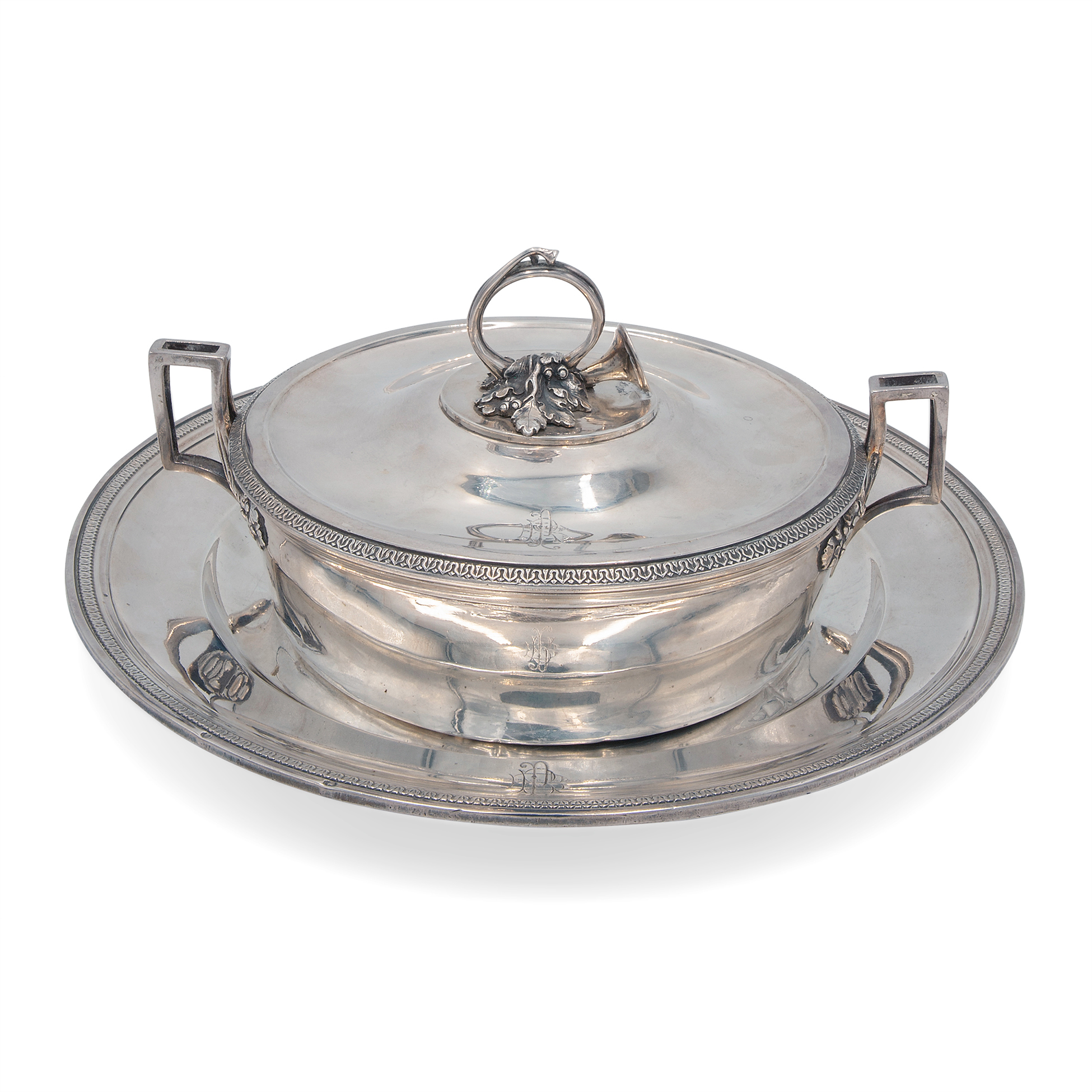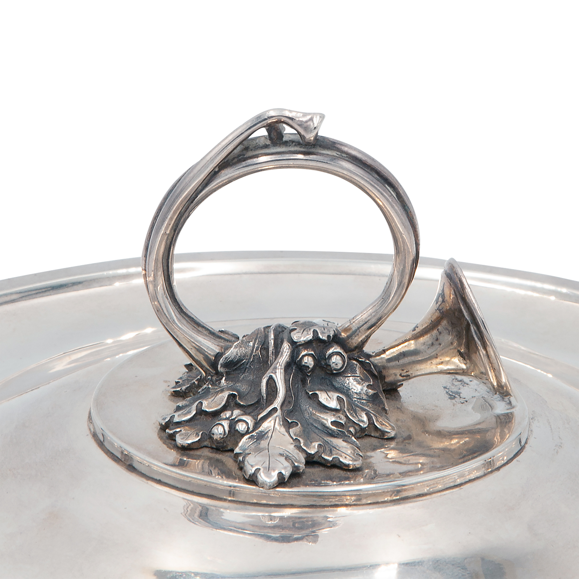 Con sottopiatto, realizzata dal maestro orafo J. C. Cahier. Peso complessivo 1728 gr., dimensioni complessive 14x30x30 cm.