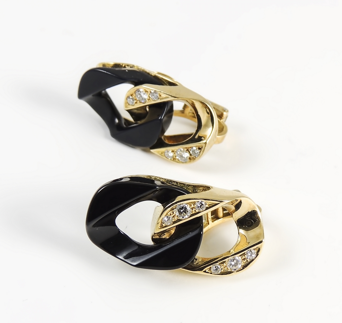 PAIO DI ORECCHINI IN ORO GIALLO E ONICE realizzati come due maglie piatte impreziosite da diamanti taglio brillante oro gr complessivi netti 20, ct complessivi 0,56