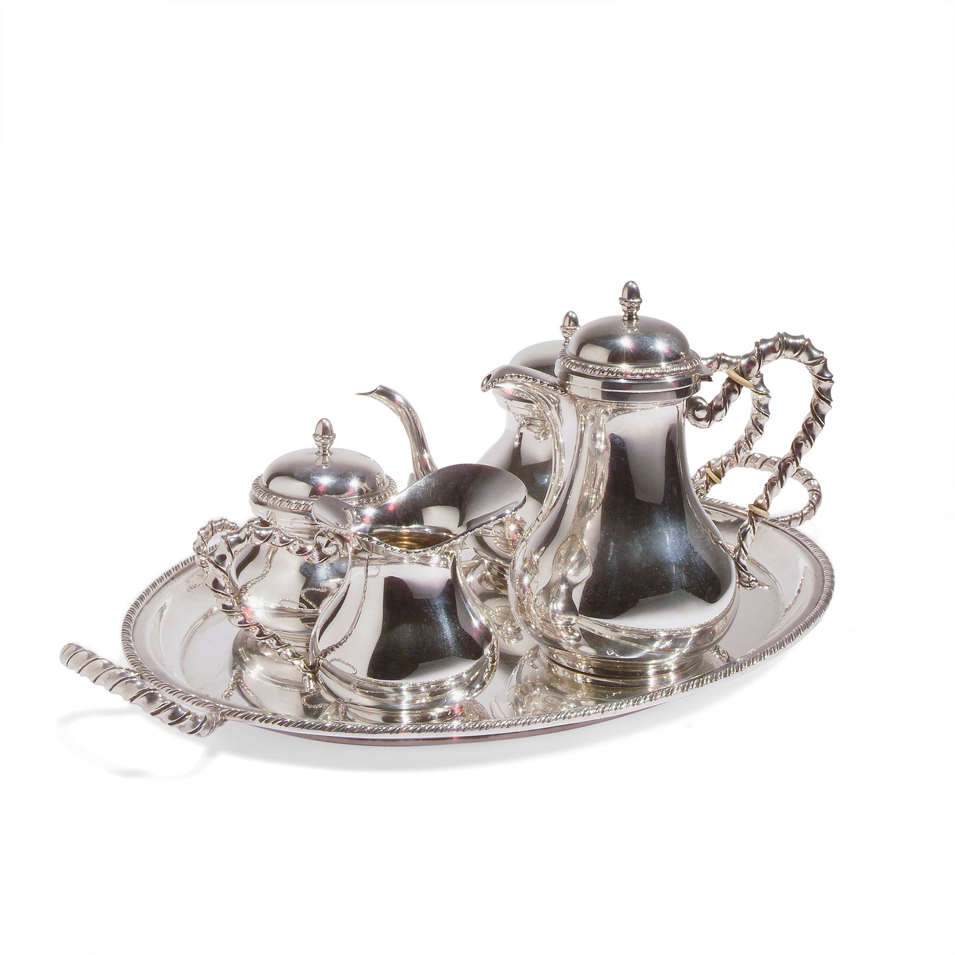 Composto da cinque pezzi: un vassoio con manici, una teiera, una caffettiera, una zuccheriera e una lattiera. Peso complessivo 4225 gr., dimensioni complessive max 24x59x38 cm.