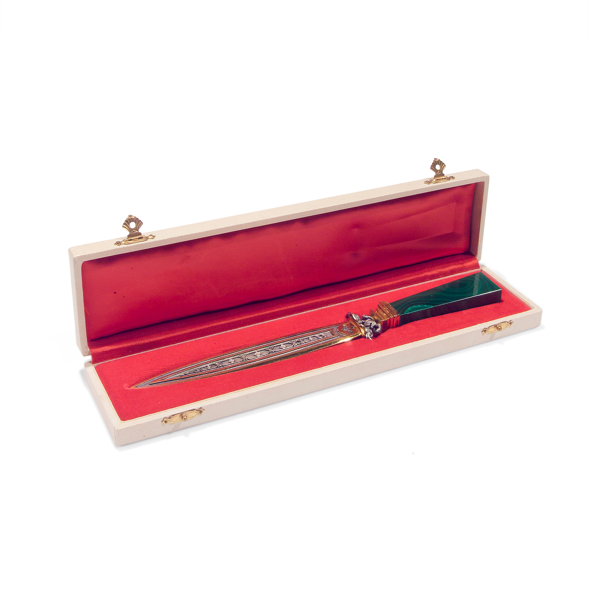 Precedente Lotto 191 Successivo Telearte - Piazzale Ammiraglio Bergamini 10, 00136 Roma Silver Wonderland Silver Wonderland - Seconda Sessione giovedì 1 dicembre 2022 ore 16:00 (UTC +01:00) Tagliacarte in argento con manico in malachite, 1950 circa Dimensioni complessive 2.5x28x6.5 cm.