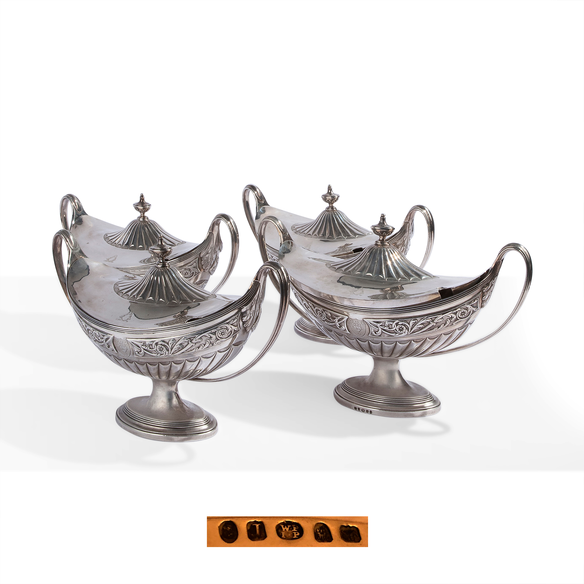 Manifattura dei maestri argentieri William Pitts e Joseph Preedy; peso complessivo 2916 gr., dimensioni complessive 15.5x26x10.5 cm. cad.