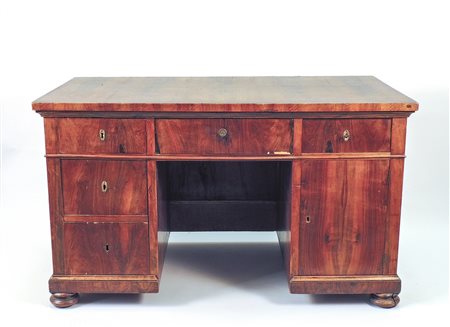 SCRIVANIA A BANCO IMPIALLACCIATA IN NOCE fine del XIX secolo tre cassetti nella fascia ed altri due laterali, piedi a cipolla, difetti h cm 78x128x70