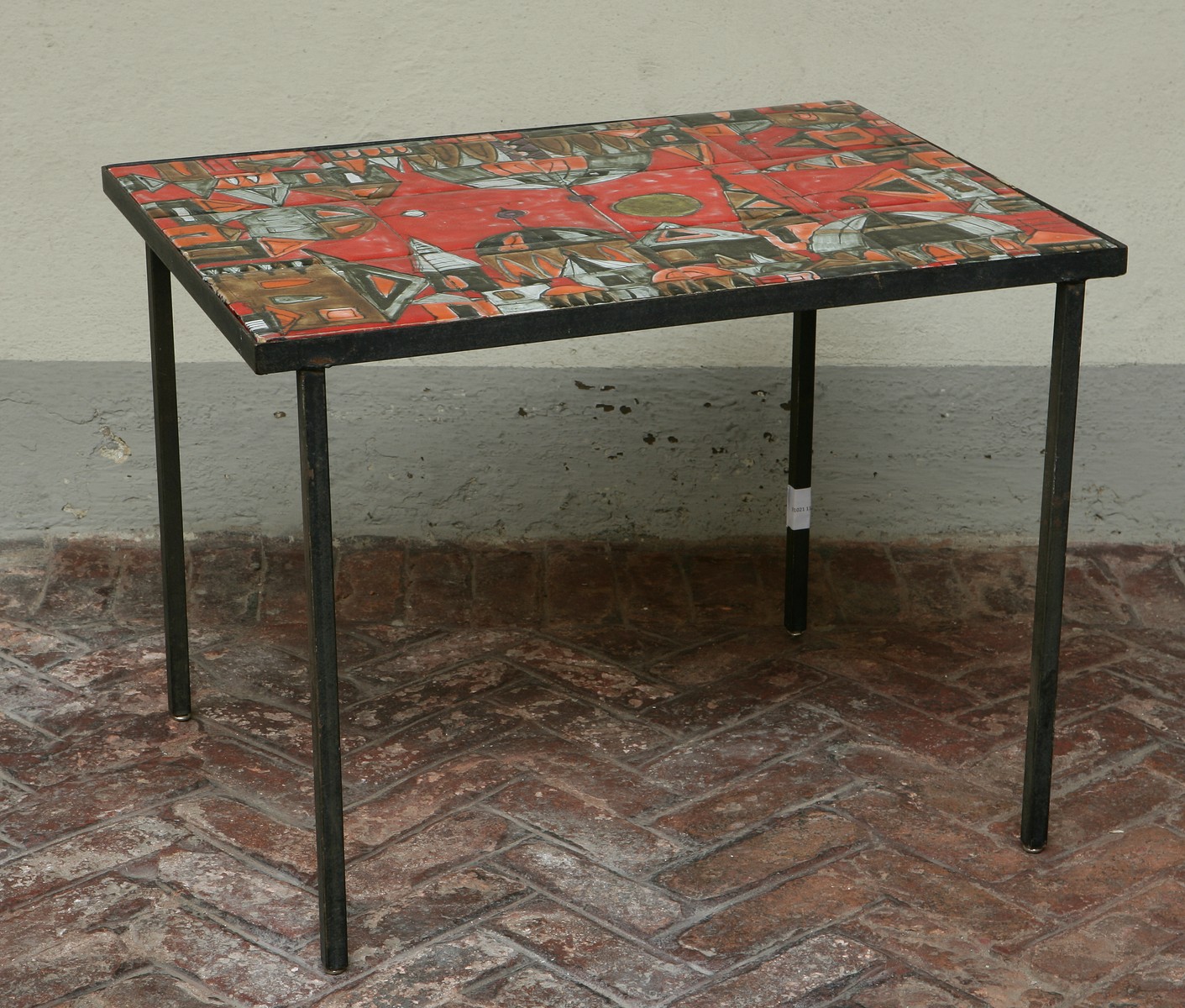 SCHIAVON ELIO. Tavolino da salotto. Cofee table. Ferro. Cm 61x45x46. Tavolino da salotto in ferro con vivace e decorativo mosaico in ceramica. Coffee table, iron with lively, decorative ceramic mosaics. 1960.