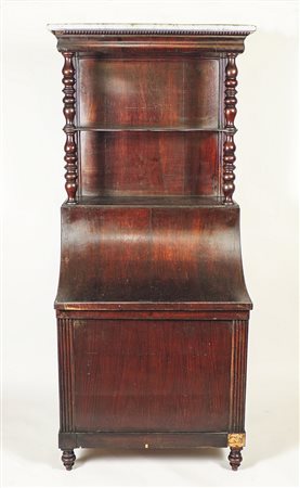 PORTA LEGNA IMPIALLACCIATO IN MOGANO metà del XIX secolo base sagomata con sportello da alzarsi e piedini a cipolla, etagere nella parte superiore con ripiano sagomato e sostegni torniti, cappello in marmo bianco, difetti h cm 154x60x50