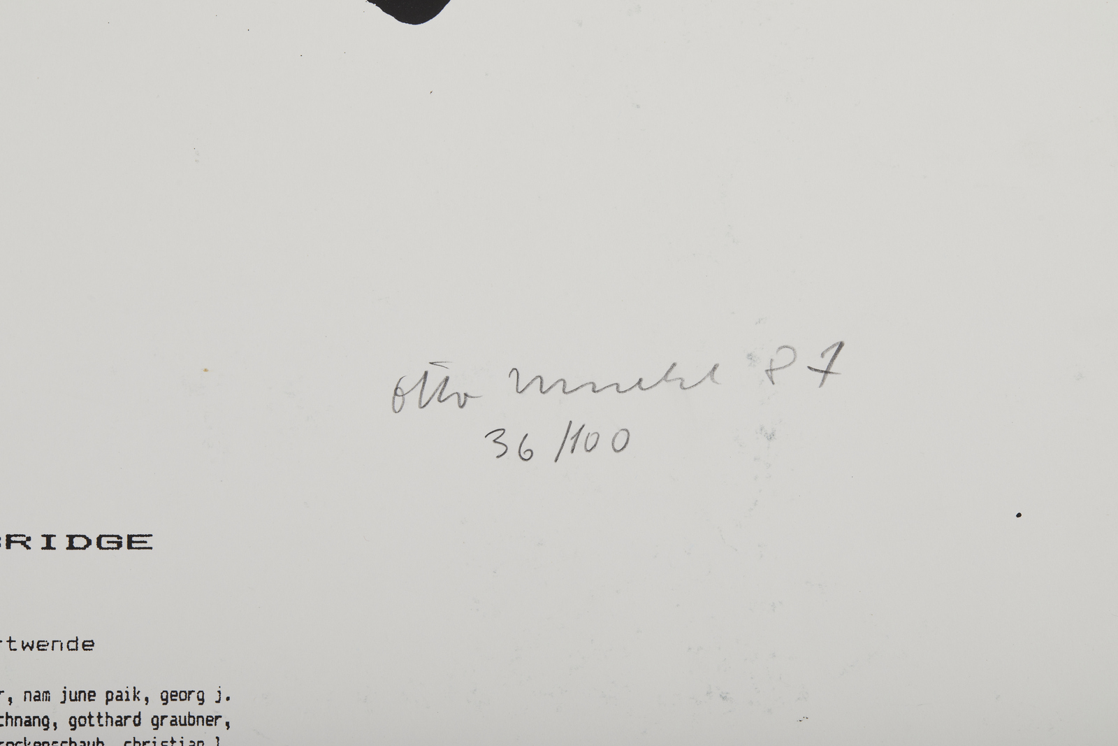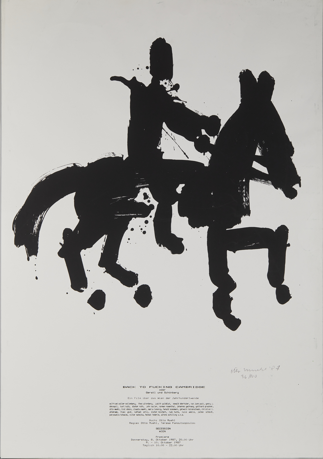 MUEHL OTTO (1925 - 2013) Back to fucking Cambridge. 1987. Litografia. Cm 70,00 x 100,00. 36/100. Tiratura, firma e anno in basso a destra a matita. Locandina di presentazione del film omonimo alla "Secession Wien". Provenienza: Galleria Lucio Amelio, Napoli; Collezione privata. Lievi difetti.