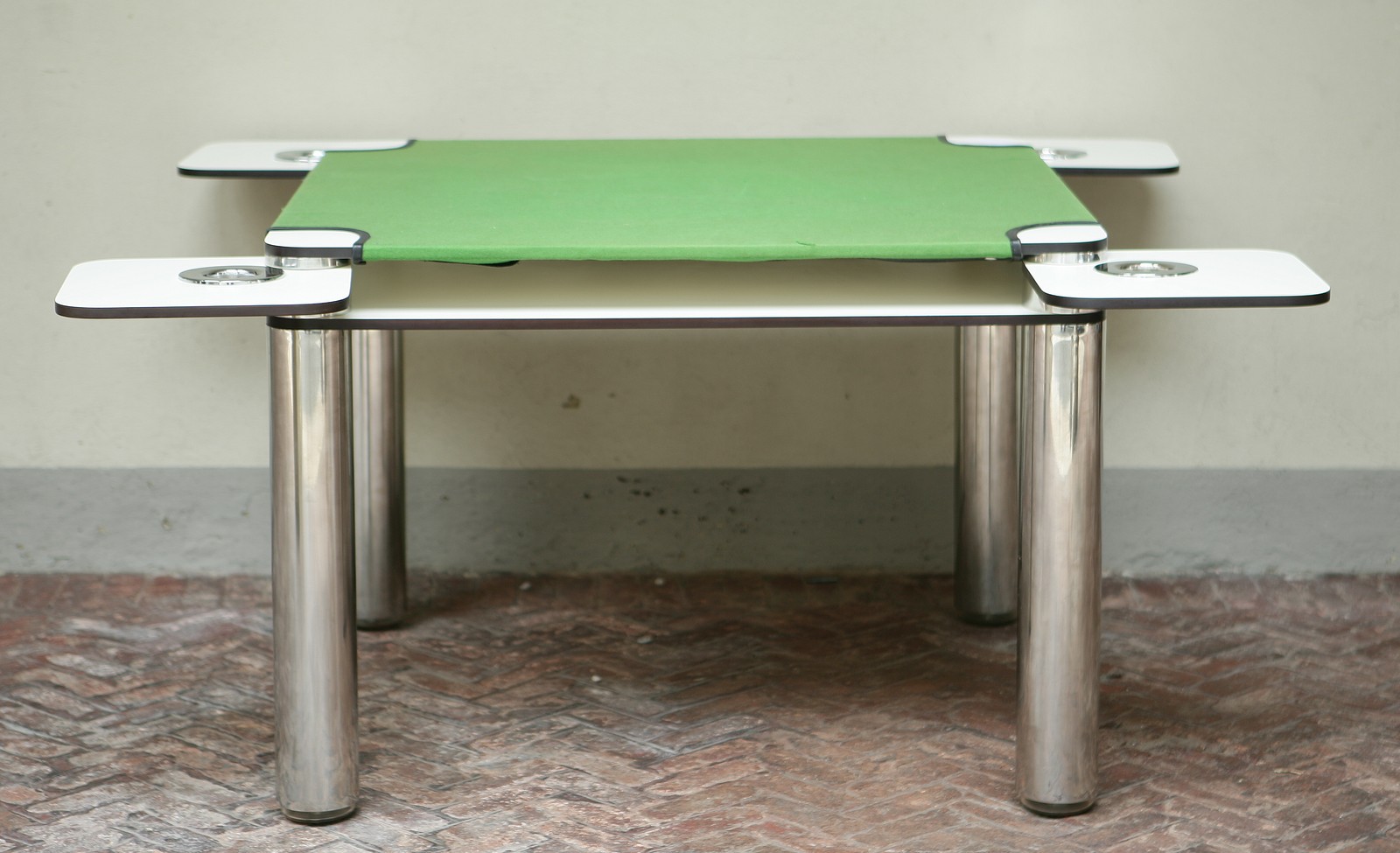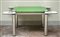COLOMBO JOE. Tavolino "Poker" per Zanotta. "Poker" table for Zanotta. Laminato plastico, acciaio e stoffa. Cm 100x70x100. Due piani in laminato plastico stratificato,colore bianco.Panno verde bordato in pelle, amovibile. Gambe in acciaio inox. Two layer of white plastic laminate.Removable green drape boarded in leather,legs in steel. 1968.