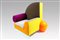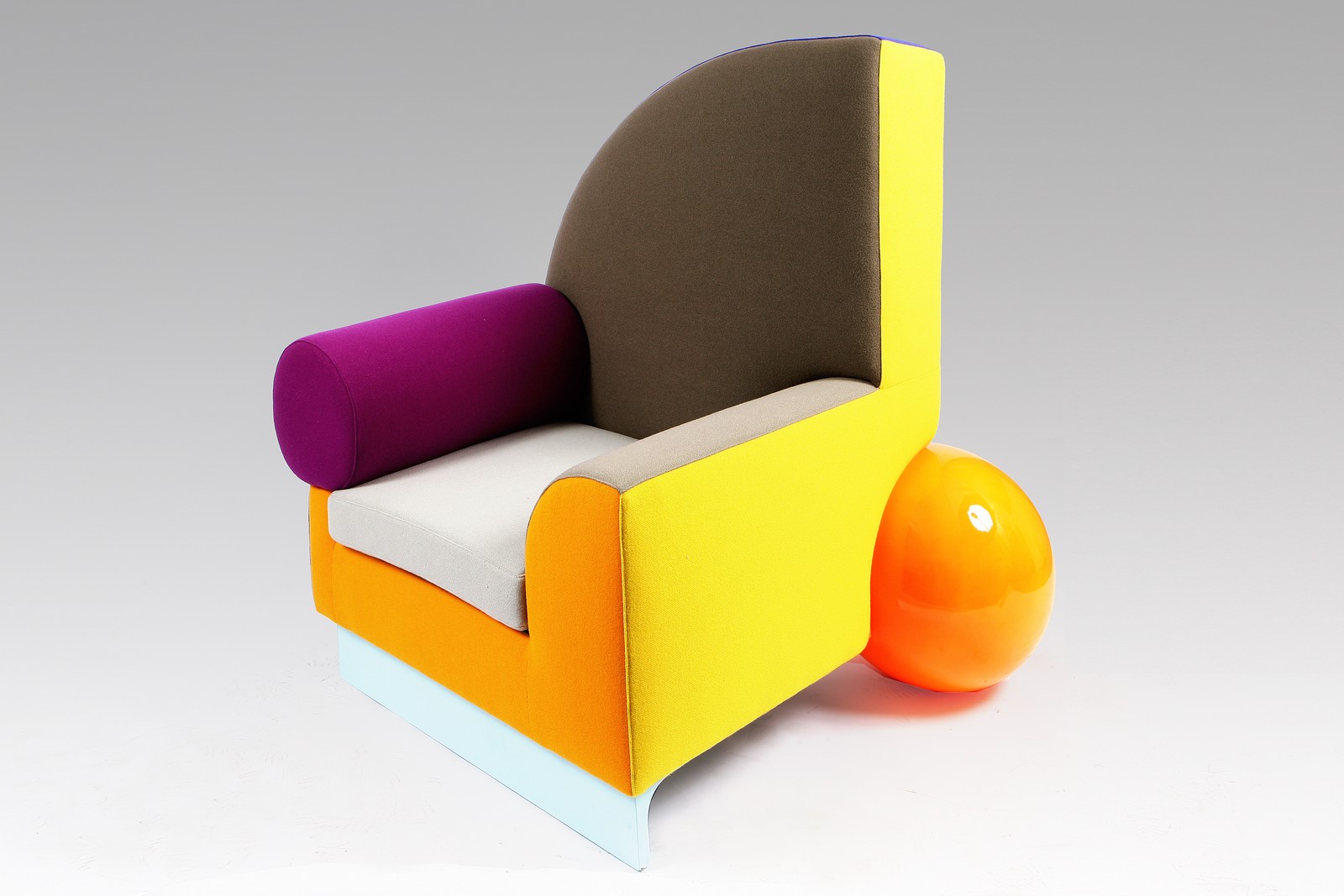 SHIRE PETER (N. 1947). Poltyrona "Bel Air" Legno e tessuto. Cm 123x125x109. Poltrona in lana multicolore con una palla in plastica al posto della gamba.