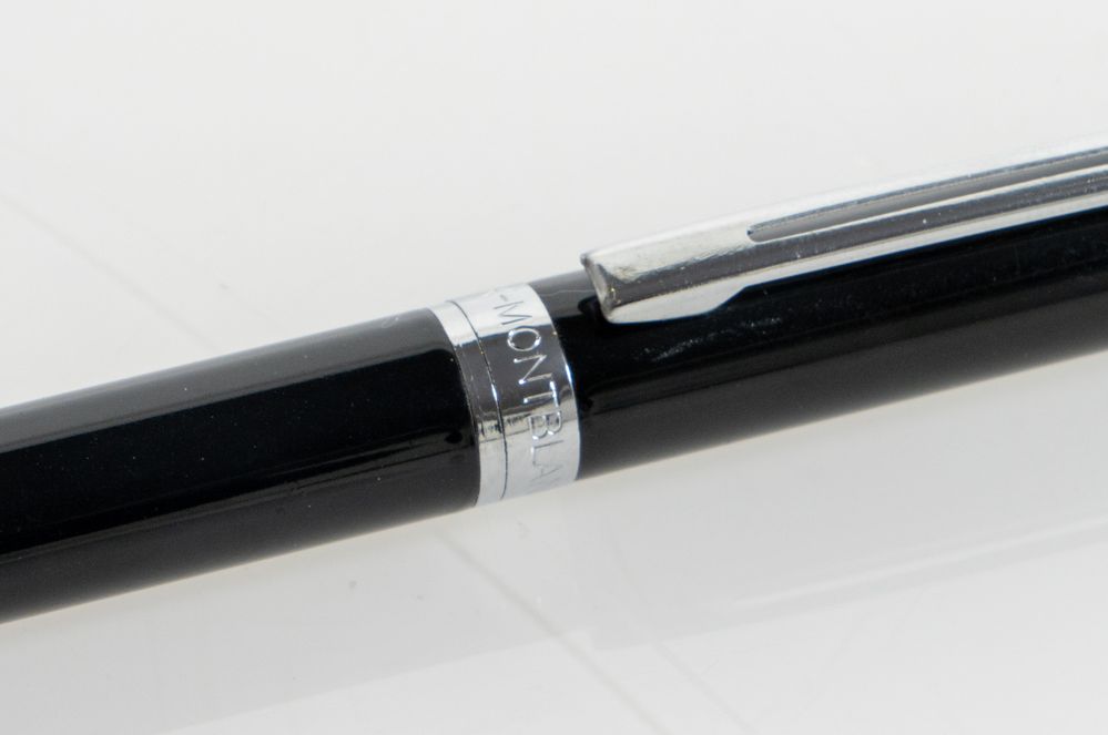 MONT BLANC Meiserstück penna a sfera. Corpo in resina nera, dettagli di rifinitura in metallo argentato e cappuccio sormontato dal marchio a stella bianca. Lunghezza: cm 13. Reca marchio Meiserstück Montblanc.