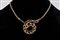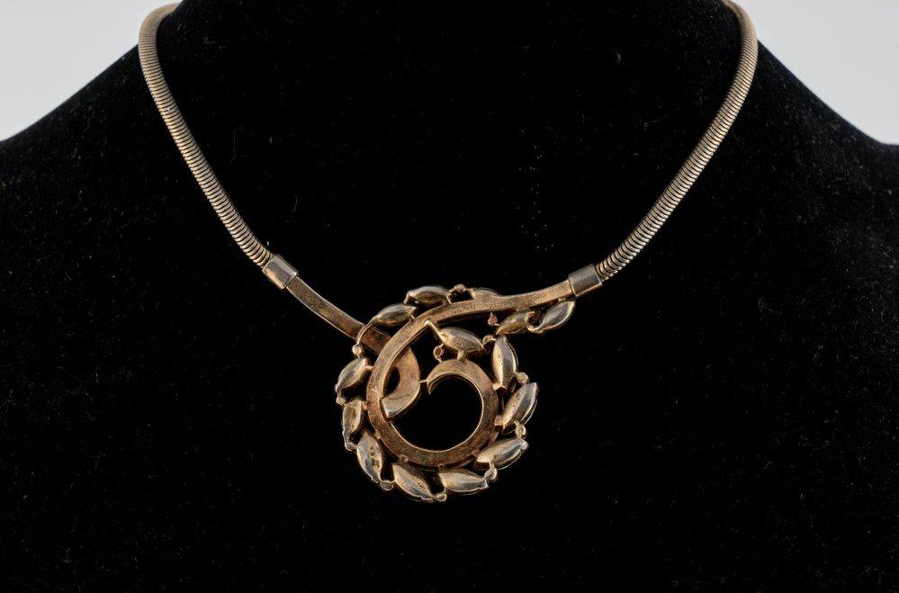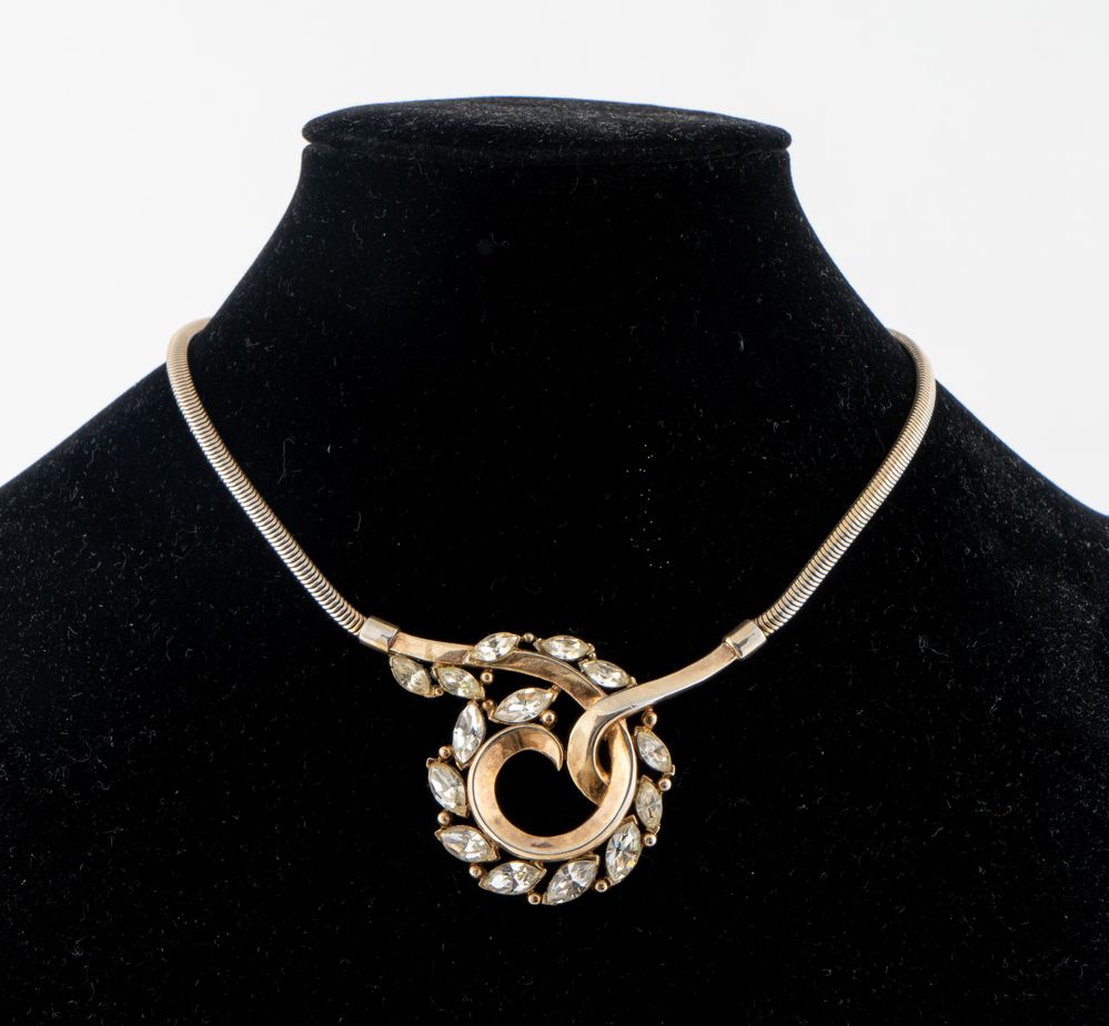 TRIFARI Collana in metallo dorato con ciondolo arricchito di zirconi. Anni '40. Cm 38. Reca marchio Trifari Pat Pend. (Lievi difetti)
