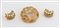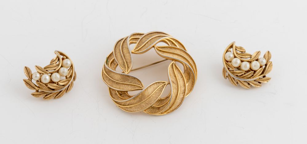 TRIFARI Parure composta da spilla e orecchini a clip in metallo dorato con applicazioni di perle. Spilla diametro: cm 4,5. Orecchini: cm 2,5x2 cad.. Al retro recano marchio Trifari.