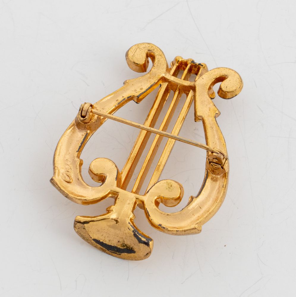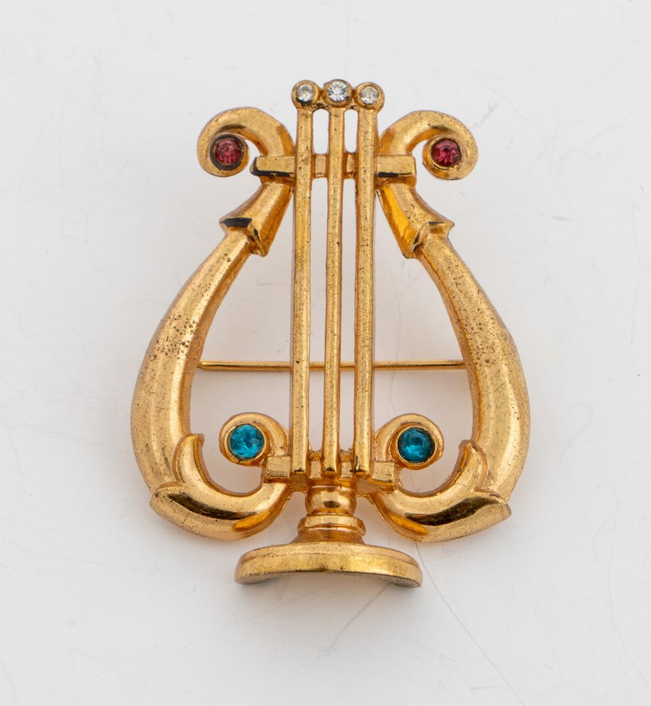 CORO Spilla a forma di lira in metallo dorato con pietre. Cm 5x4. Reca marchio Coro. (Lievi difetti)