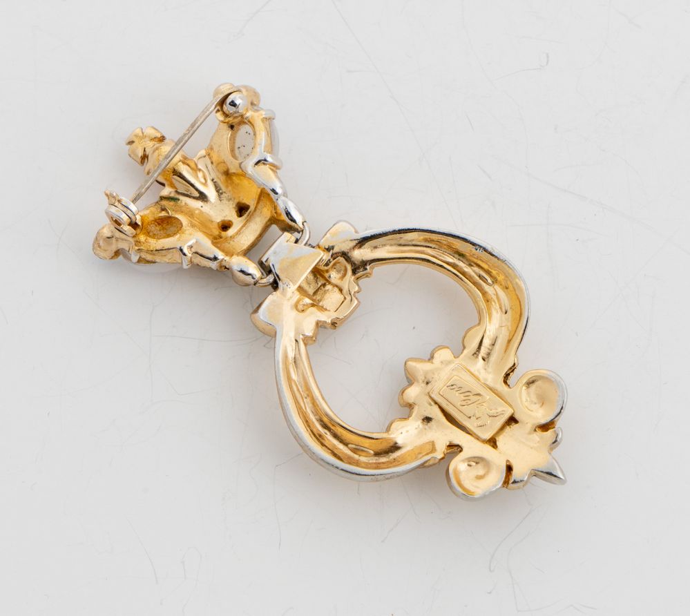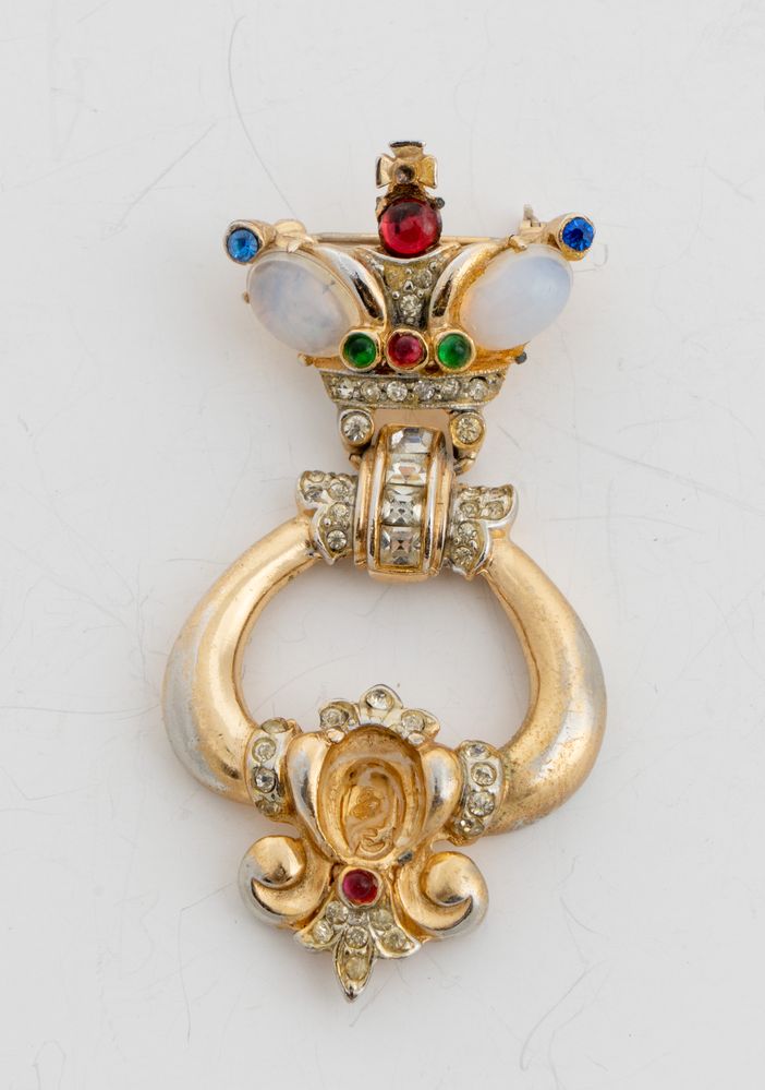 CORO Spilla con corona in metallo dorato con zirconi e pietre. Cm 7x3. Reca marchio Coro. (Lievi difetti)