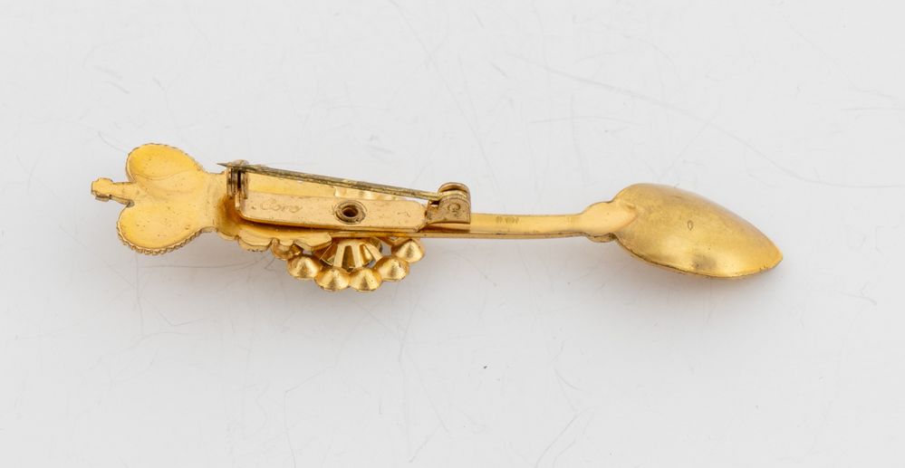 CORO Spilla a forma di cucchiaino in metallo dorato con zirconi. Cm 7,5x2. Al retro reca marchio Coro. (Lievissimi difetti)